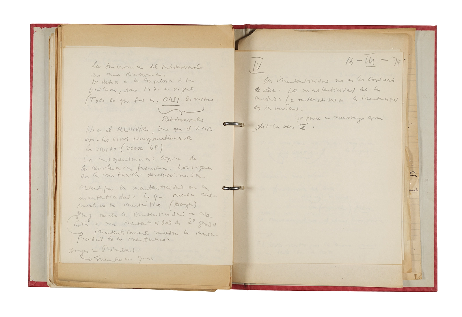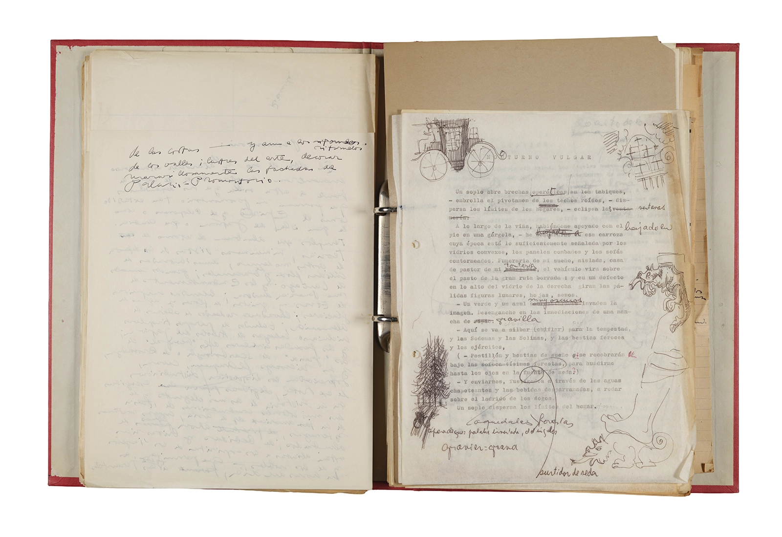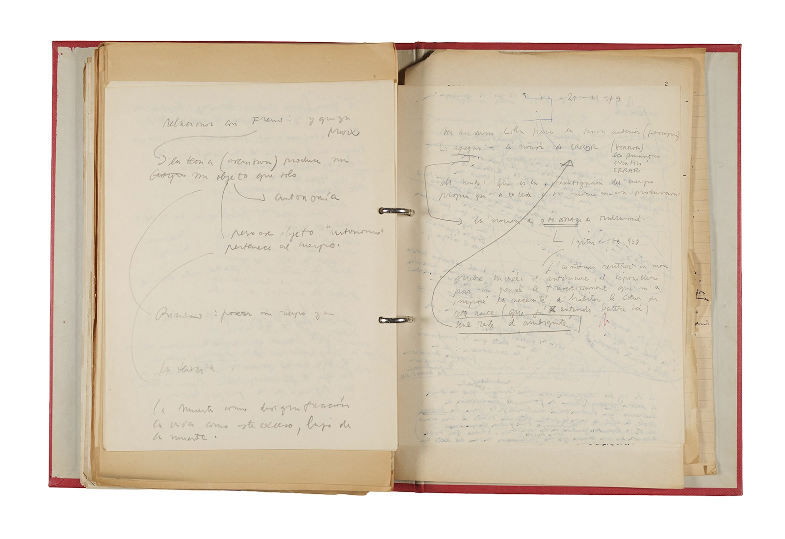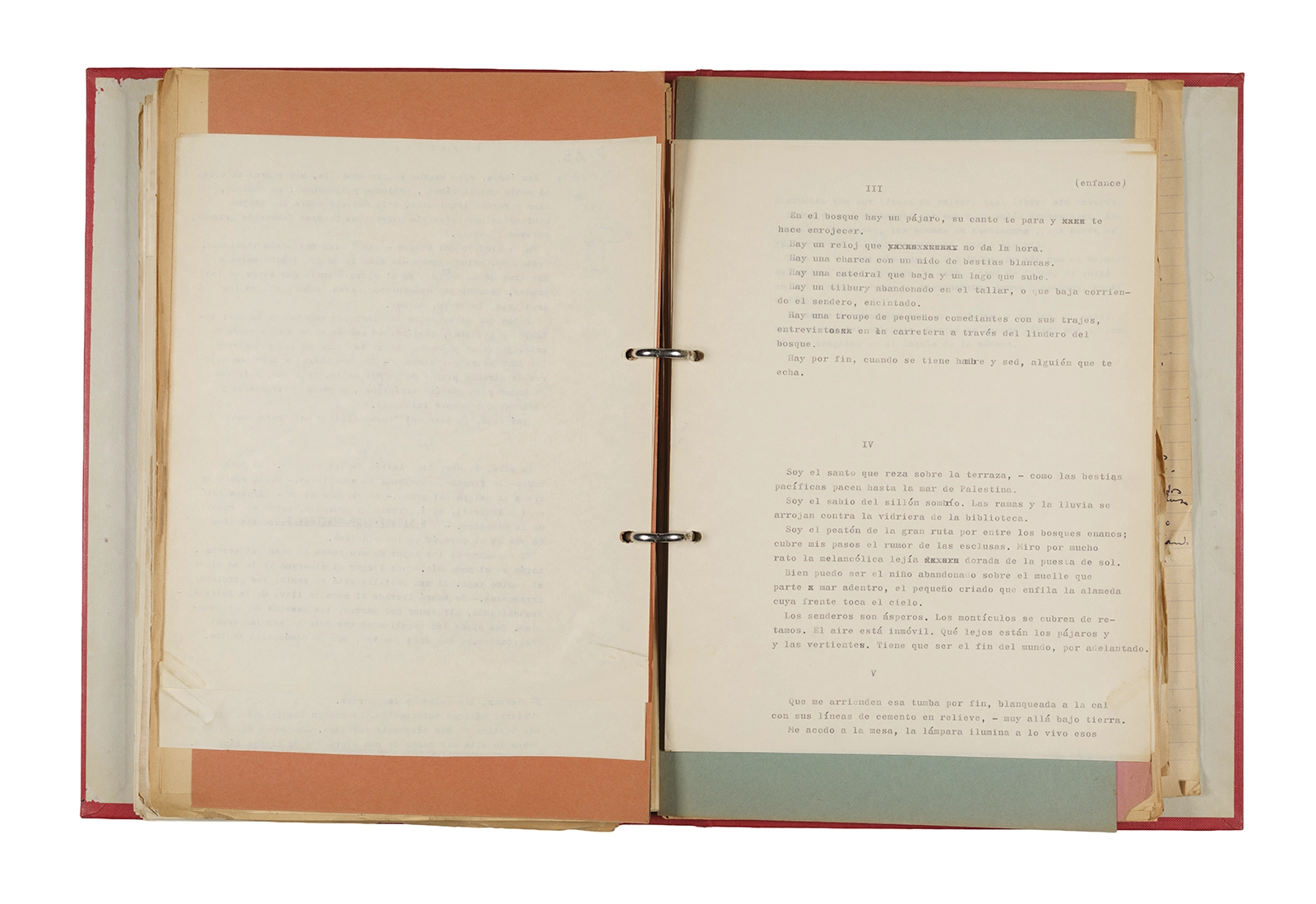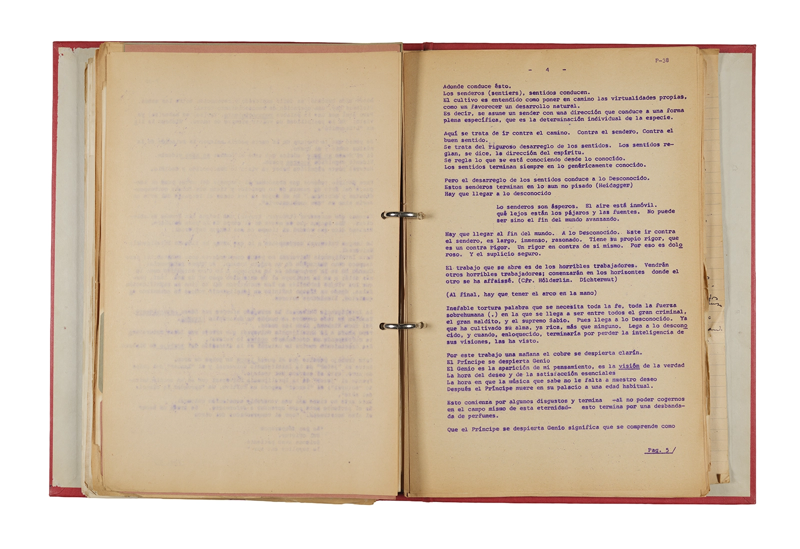 Esta carpeta reúne distintos materiales vinculados al seminario colectivo sobre la poesía de Arthur Rimbaud dictados por Ronald Kay y Enrique Lihn entre 1973 y 1974 en el Departamento de Estudios Humanísticos de la Universidad de Chile. Contiene un análisis mecanografiado del poema “Devoción” de Rimbaud, un dossier preparado para las sesiones del Seminario realizadas durante 1974 con la traducción de veinte textos de “Iluminaciones”, con correcciones y comentarios, así como una selección más breve de traducciones rotuladas “Manuscritos ya publicados por el Departamento de Estudios Humanísticos”. Se incluye aquí también el dibujo de un plano de Santiago, distintos trabajo realizados en el marco del Seminario —entre ellos, el texto “Texto y ‘Realidad'” de Patricio Marchant—, y listas de asistencia de las sesiones realizadas durante noviembre de 1973. Por último, esta carpeta contiene también una serie de diagramas y viñetas con planificaciones de posibles acciones en el espacio público. Estos últimos documentos, fechados en octubre de 1974, incluyen los nombres de los siguientes participantes del seminario Signometraje, también dictado por Kay en el DEH: Juan Balbontín, Diamela Eltit, Catalina Parra y Raúl Zurita.