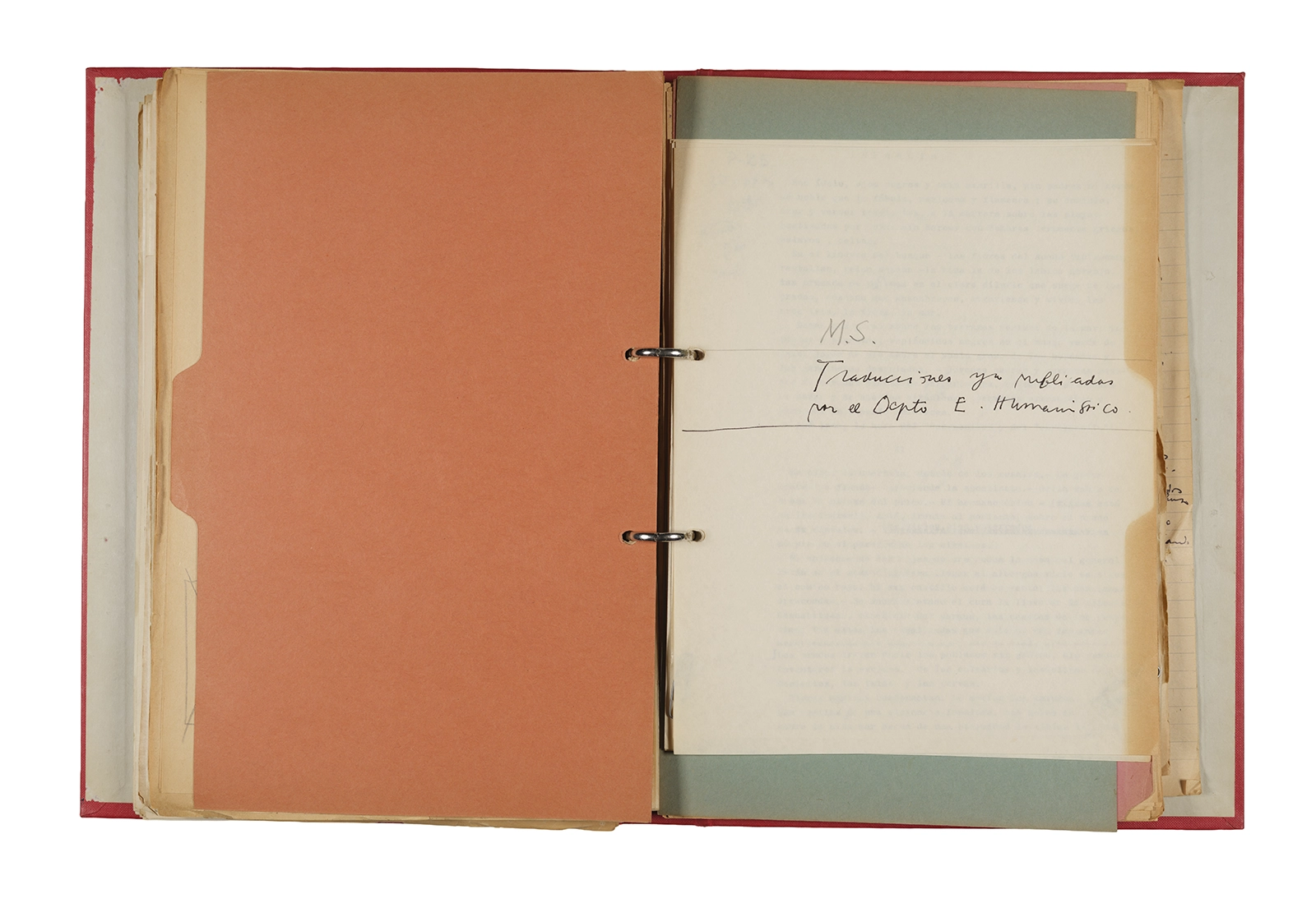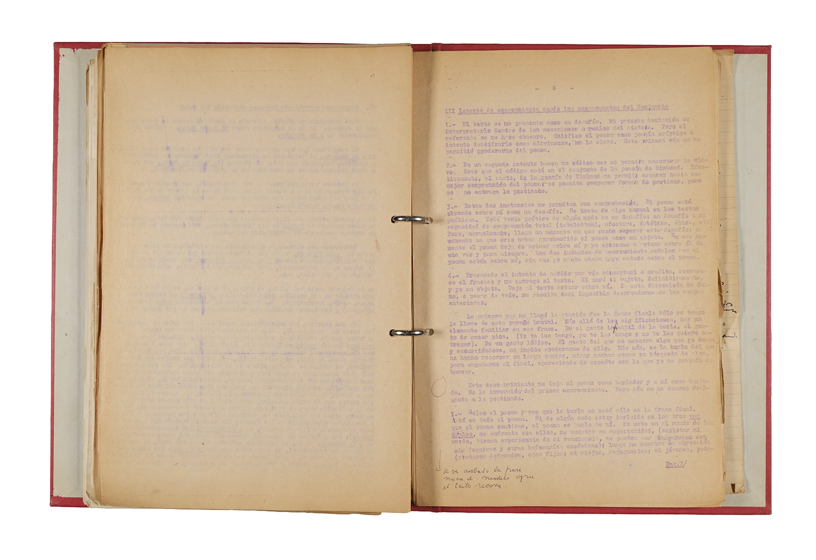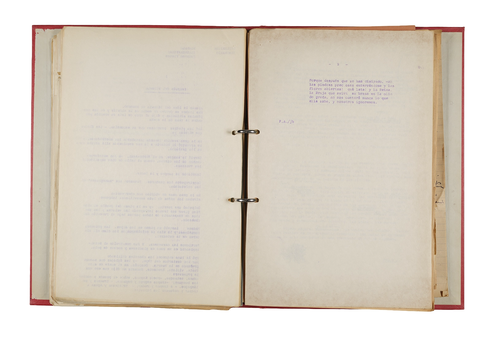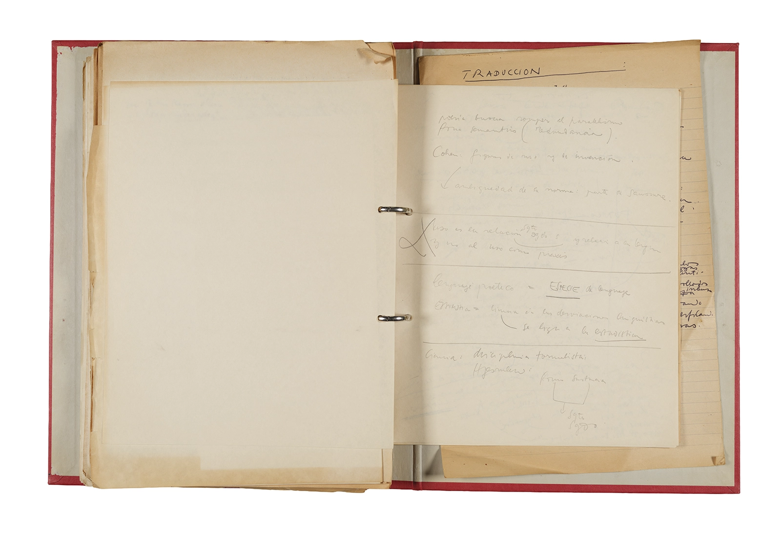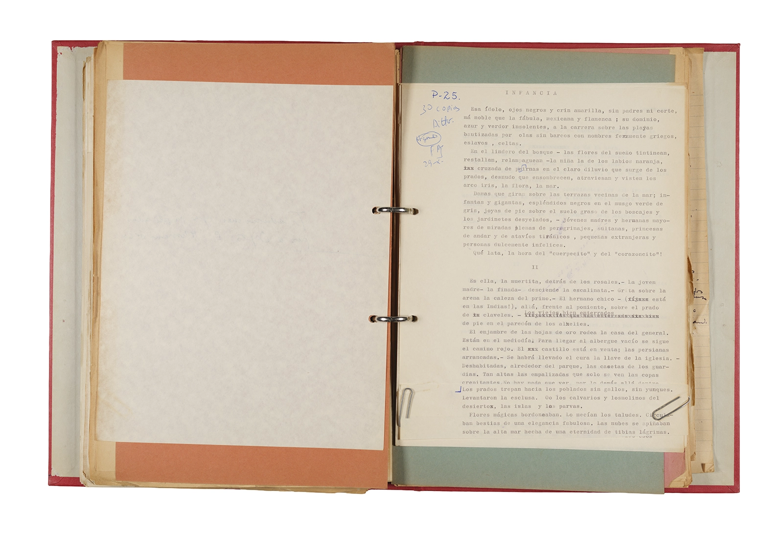 Papel roneo mecanografiado, apuntes manuscritos en tinta y grafito, clip metálico.