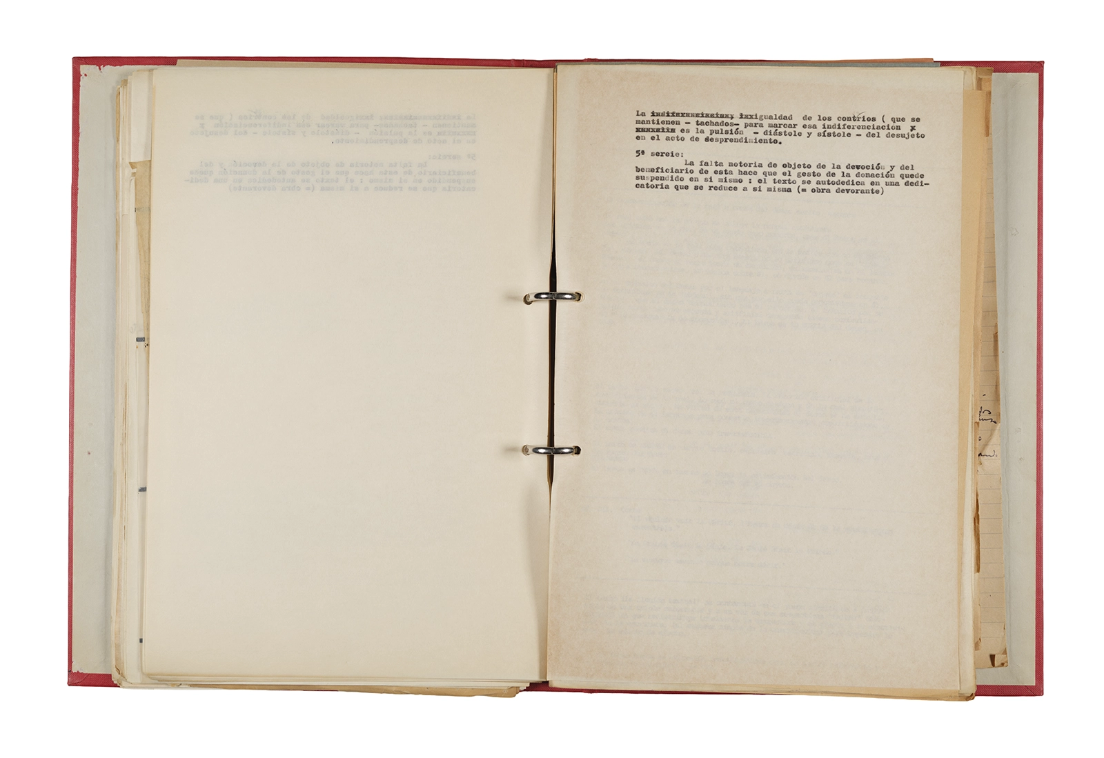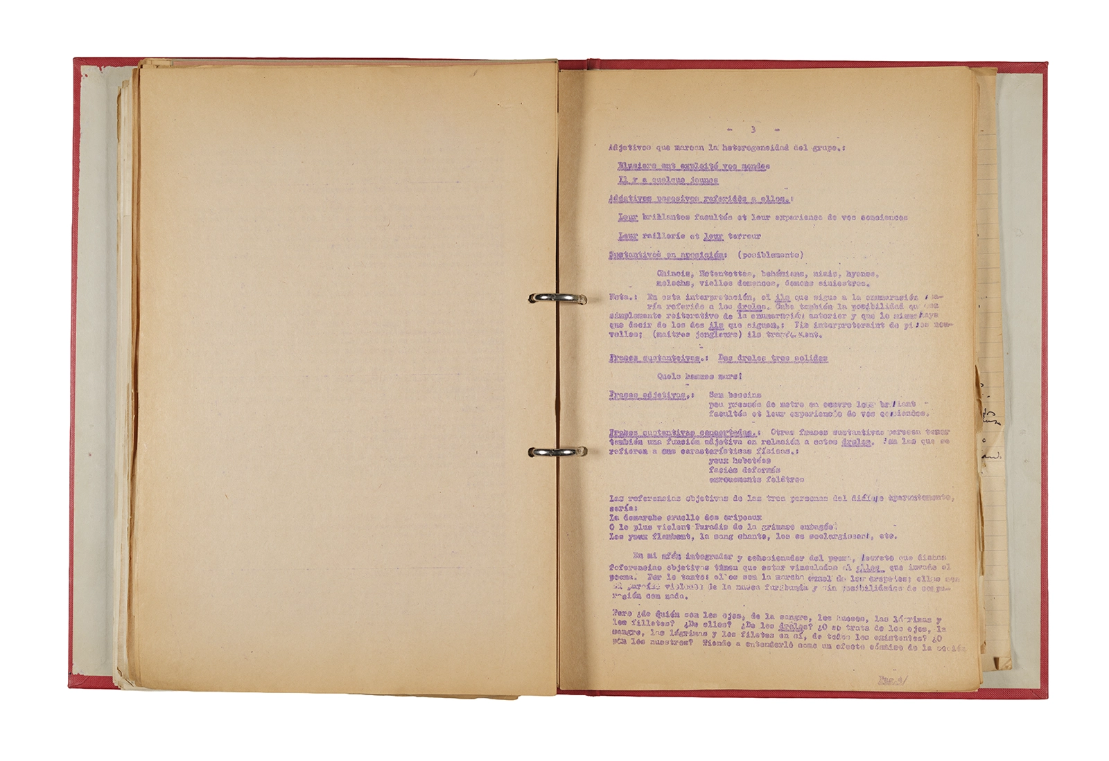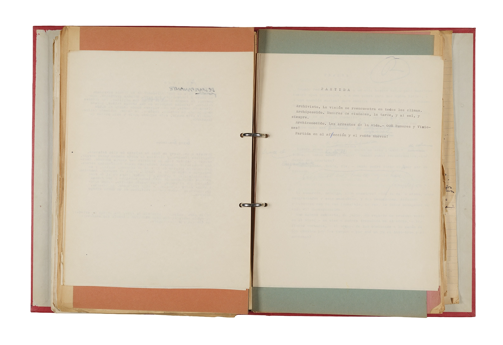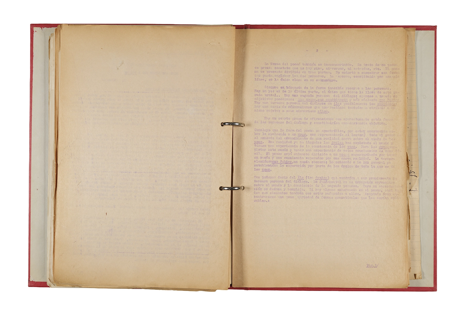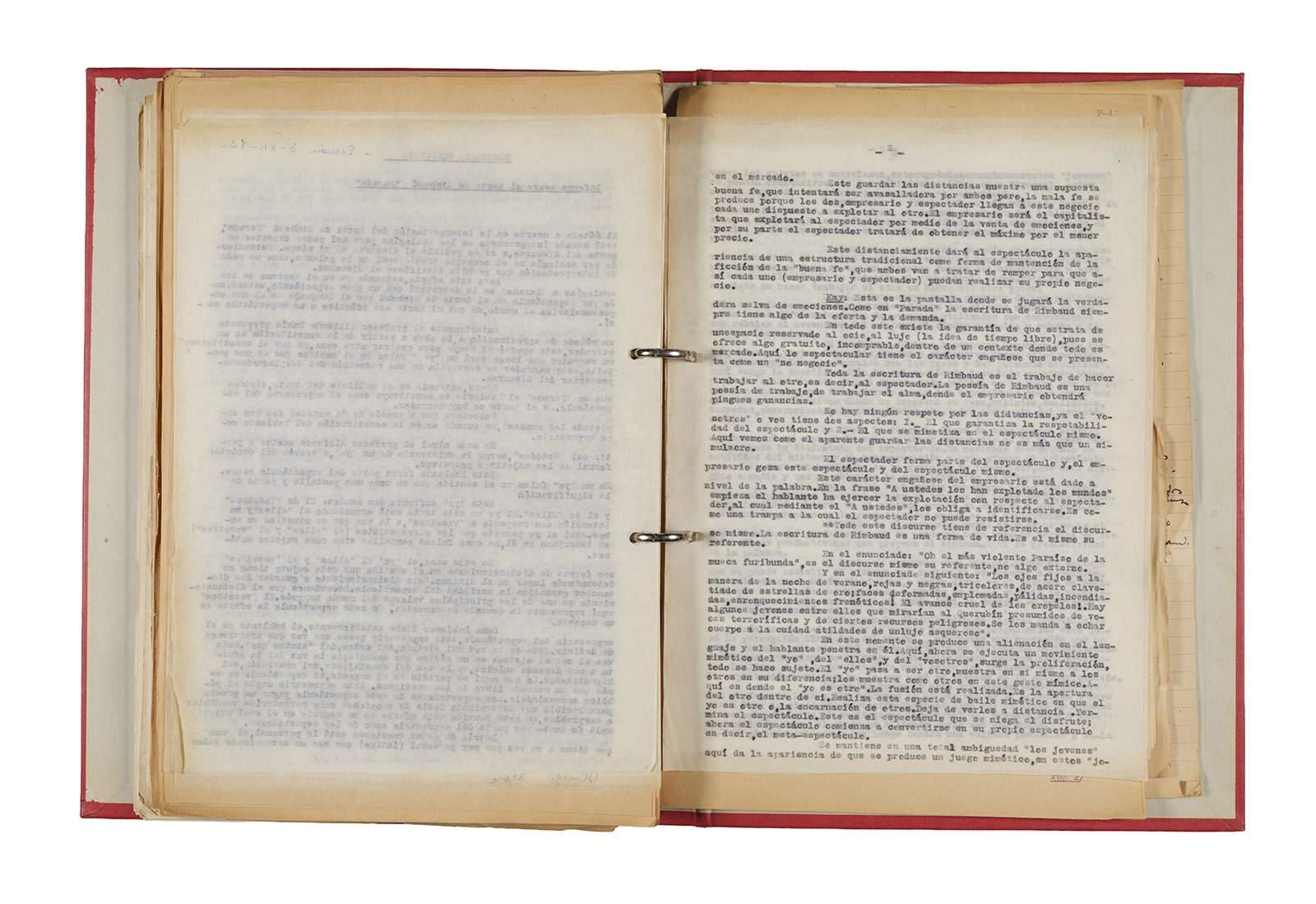 Papel roneo mecanografiado, apuntes manuscritos en tinta y grafito, clip metálico.