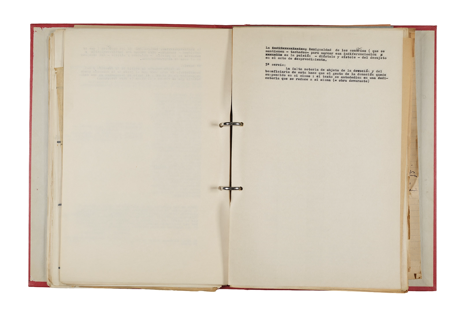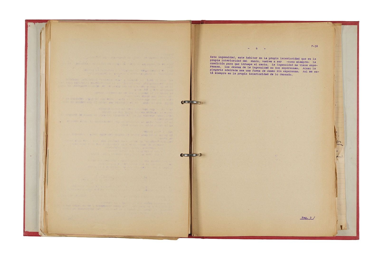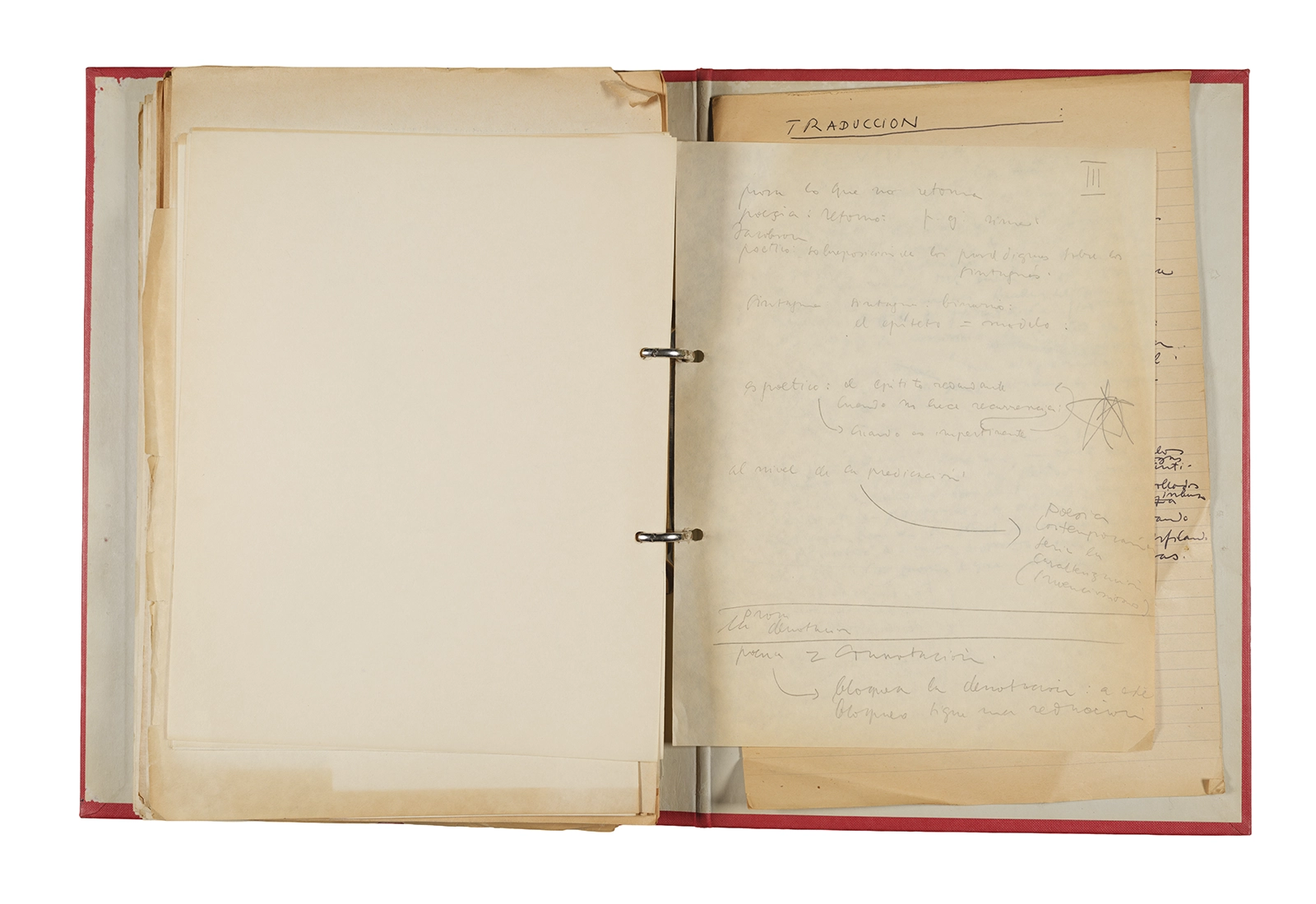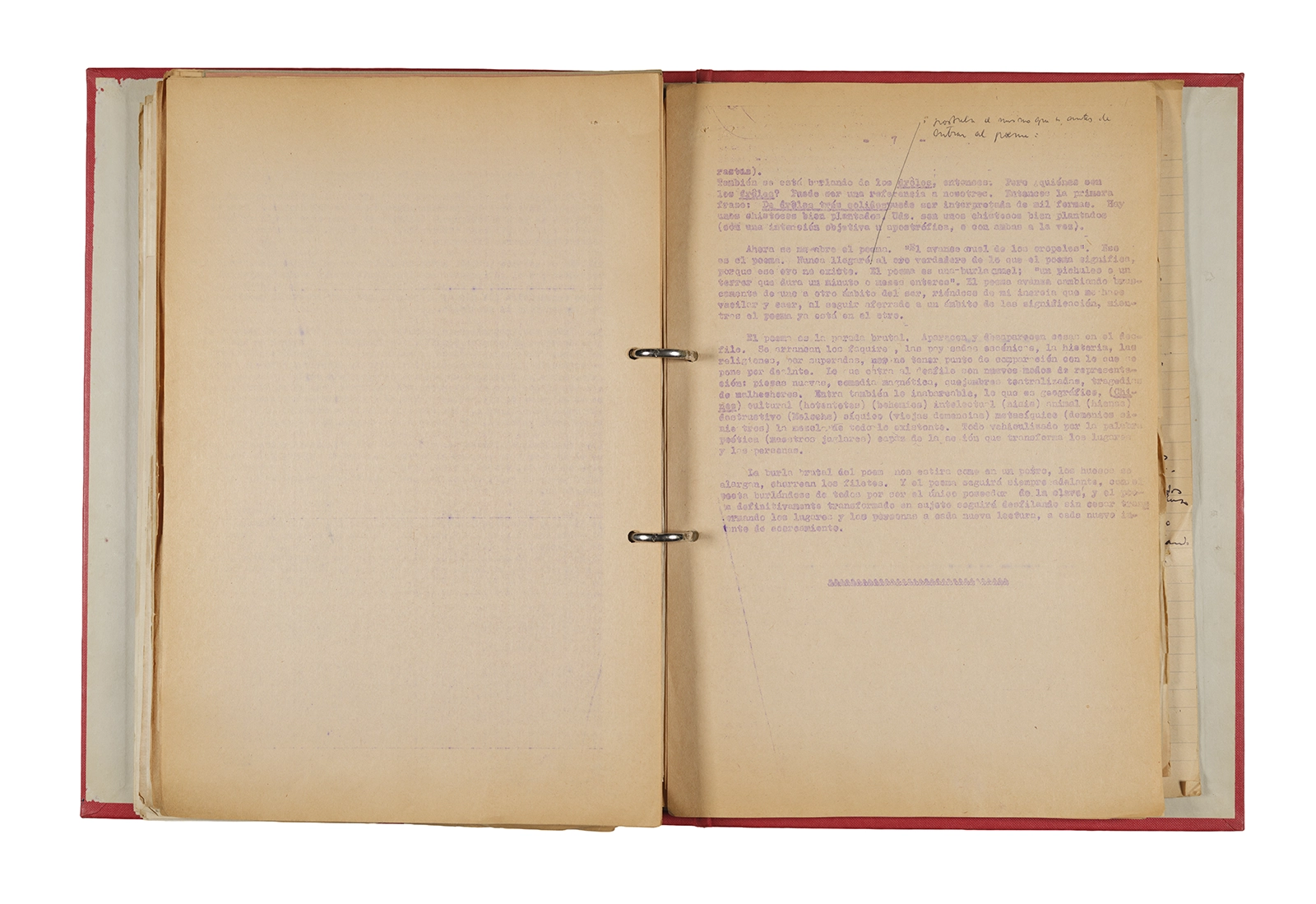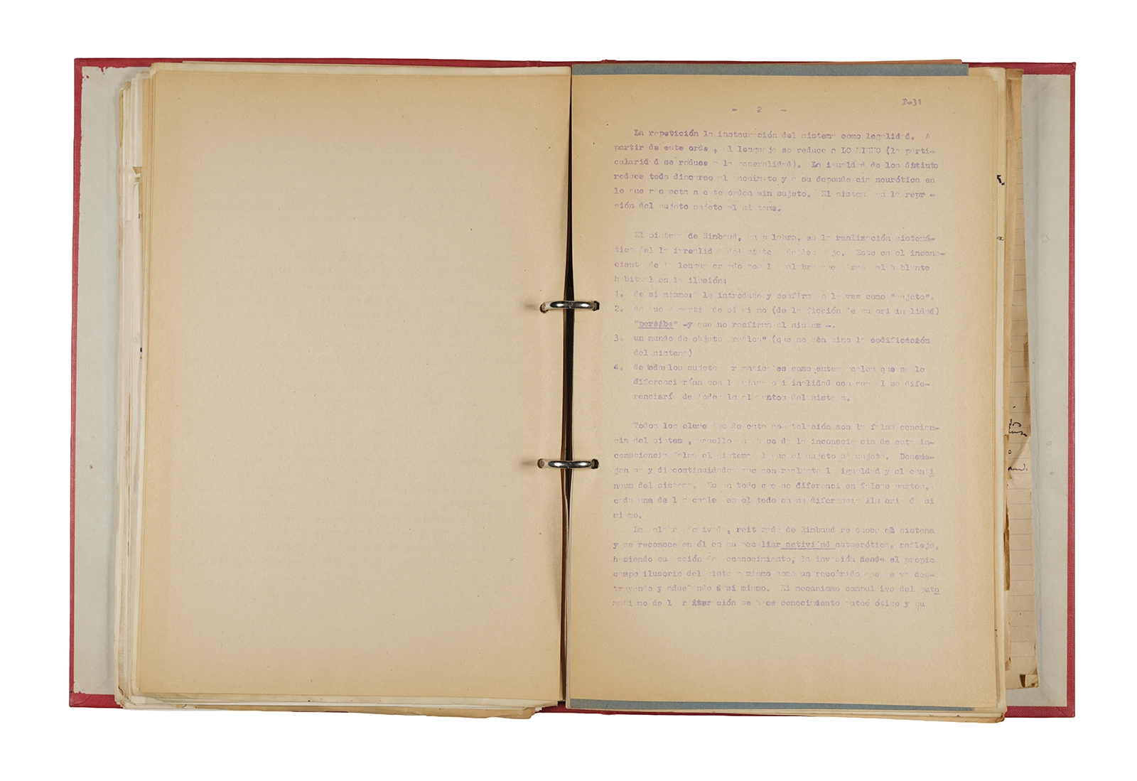 Papel roneo mecanografiado, apuntes manuscritos en tinta y grafito, clip metálico.