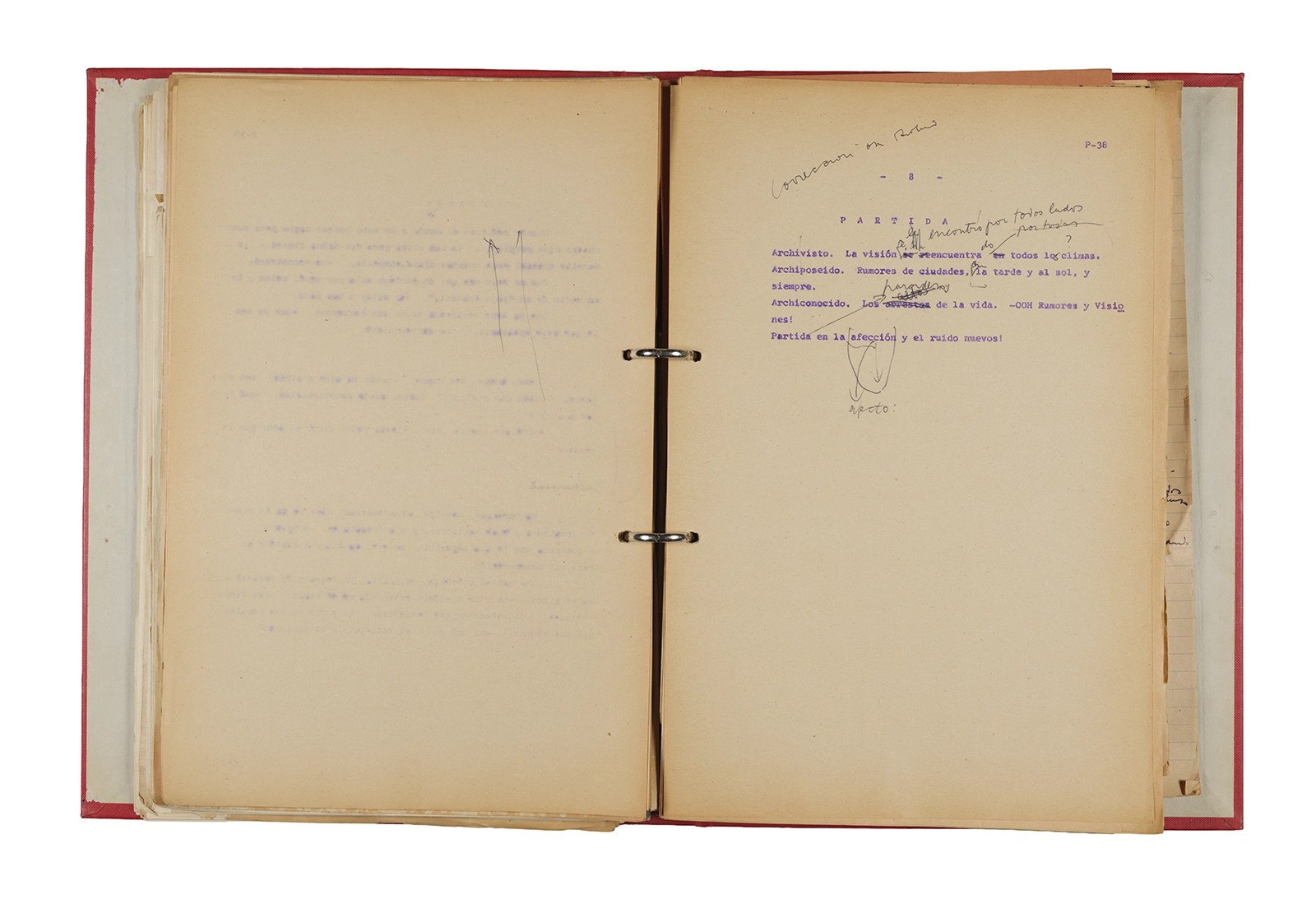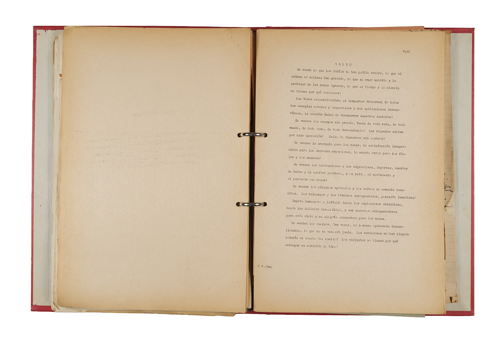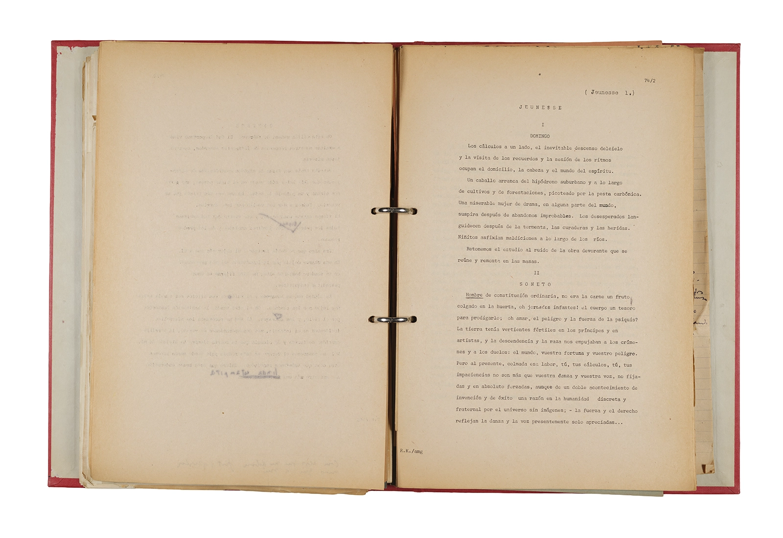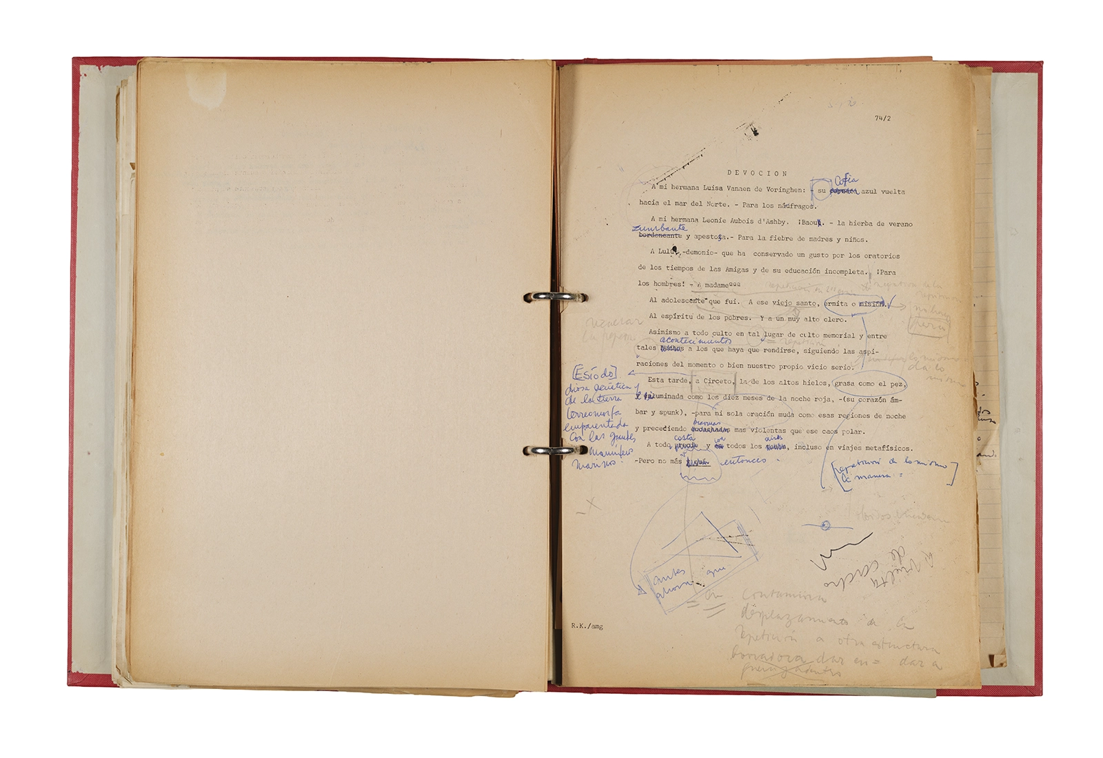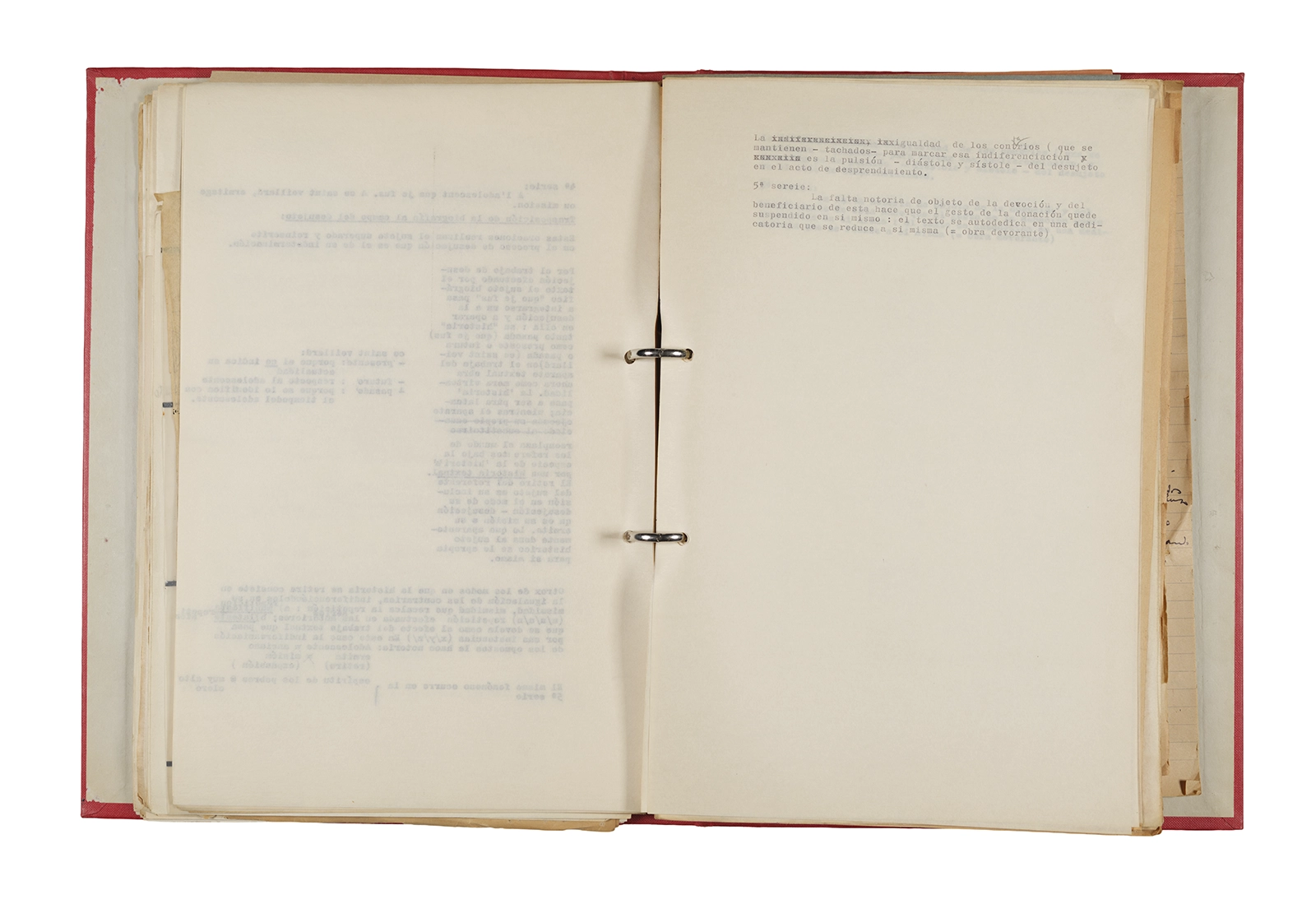 Papel roneo mecanografiado, apuntes manuscritos en tinta y grafito, clip metálico.