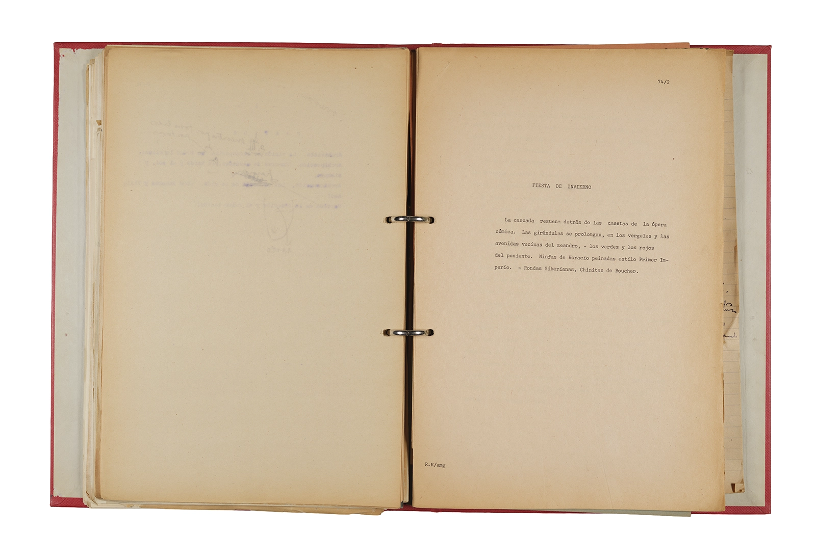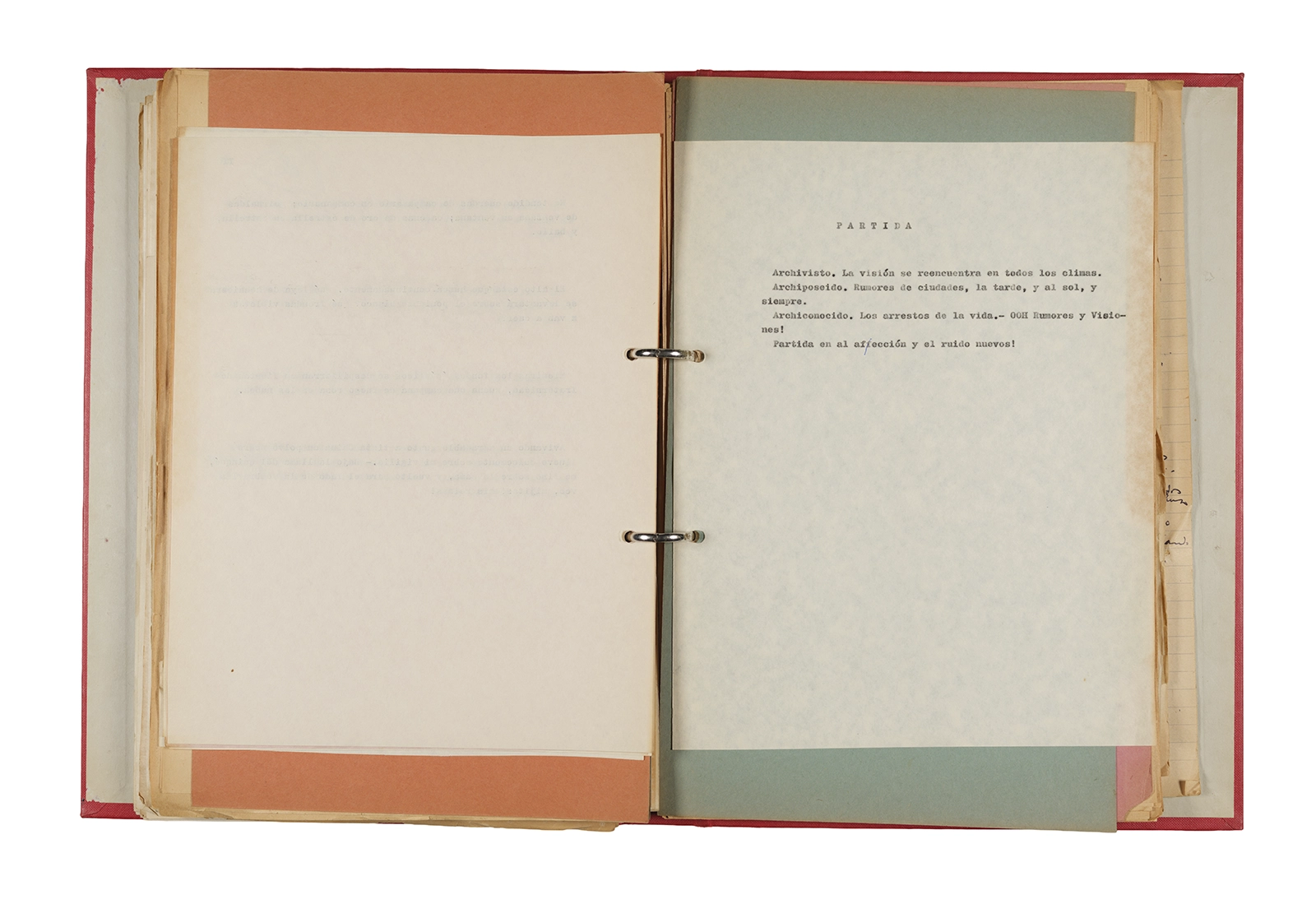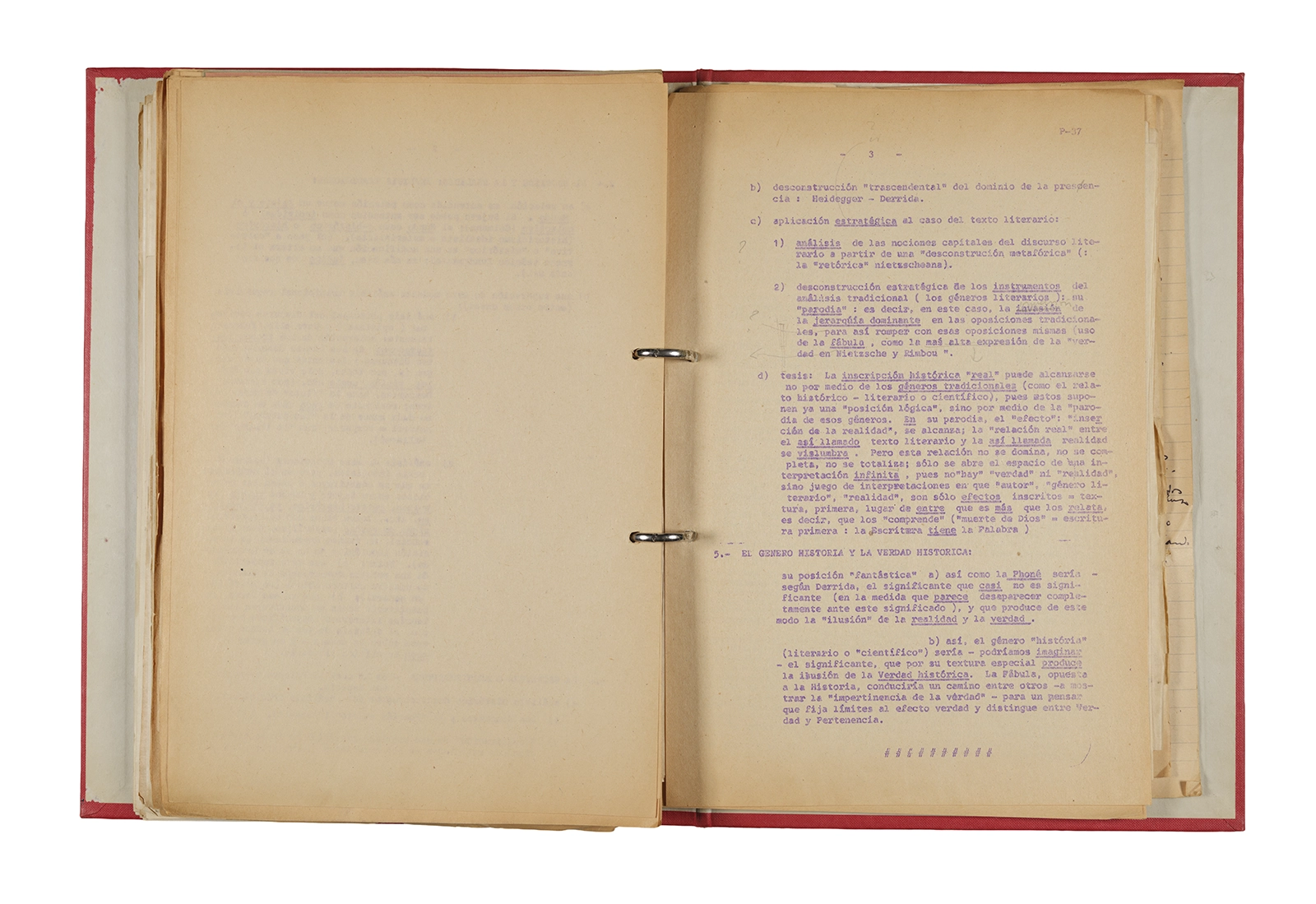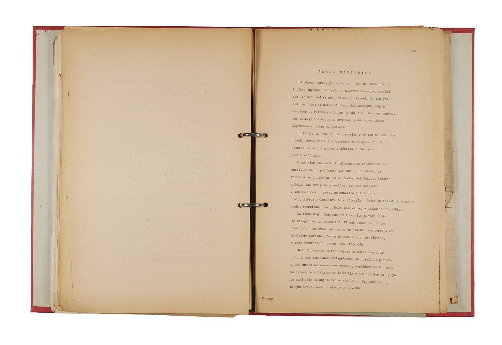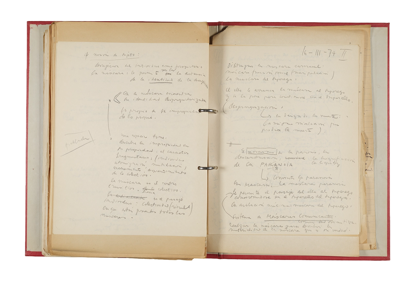 Papel roneo mecanografiado, apuntes manuscritos en tinta y grafito, clip metálico.