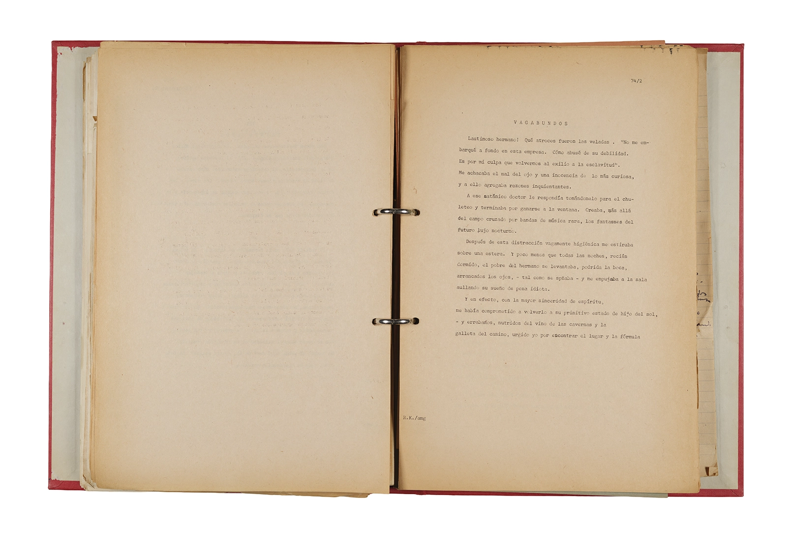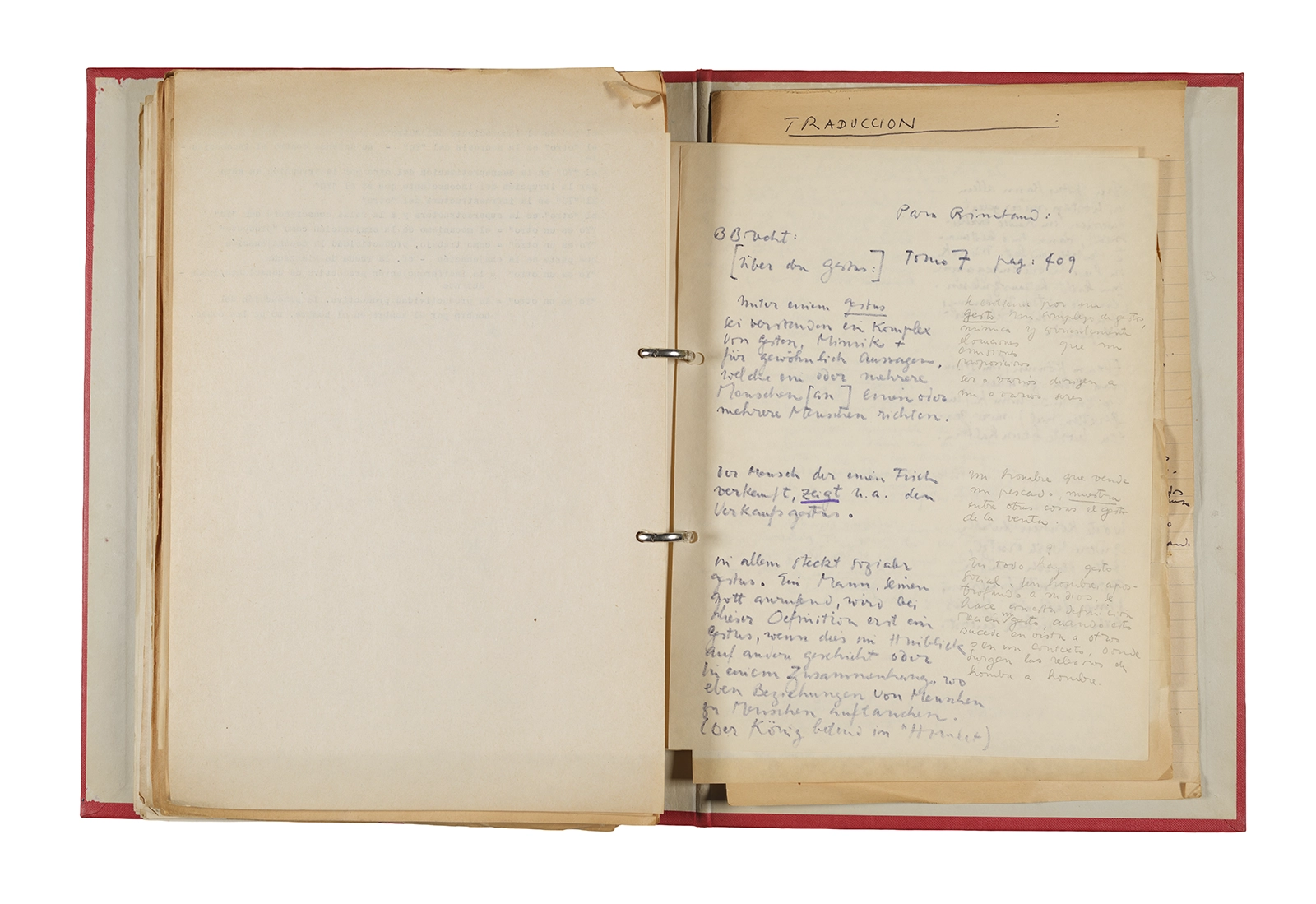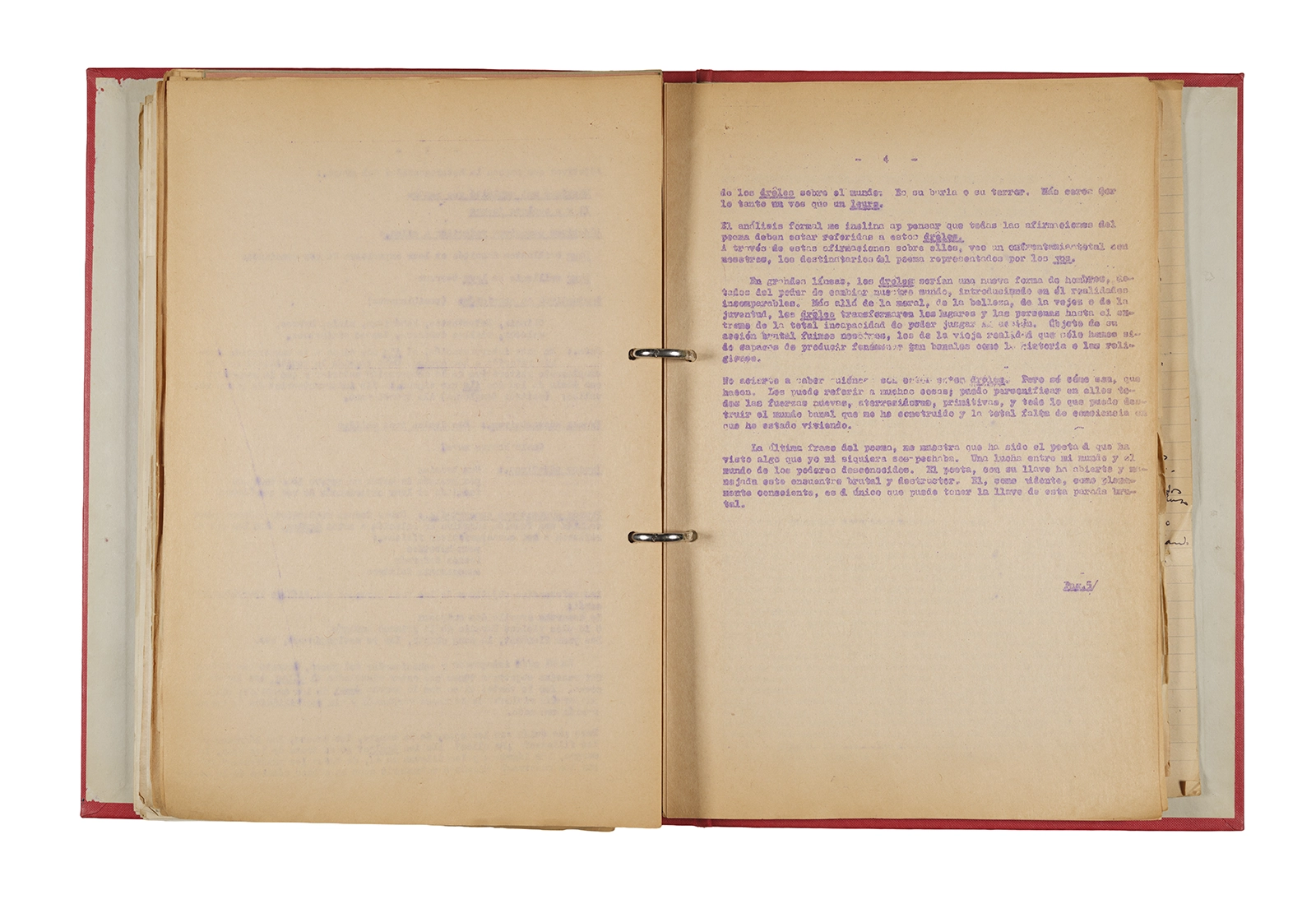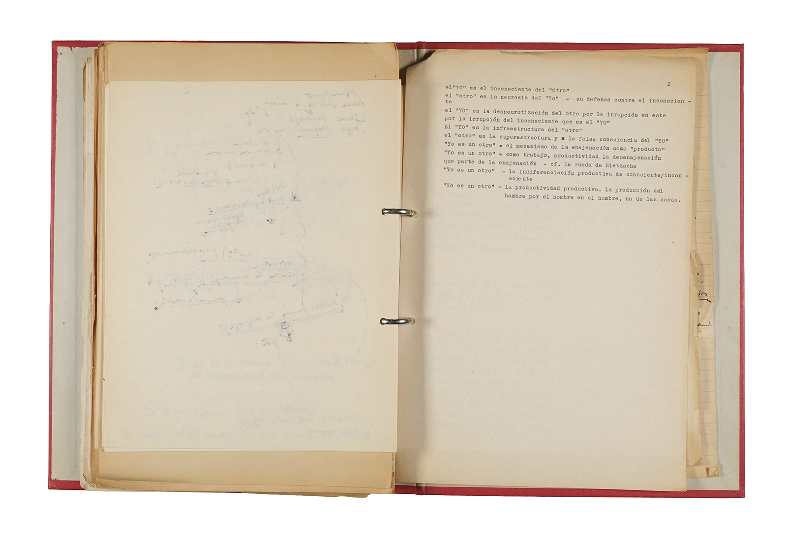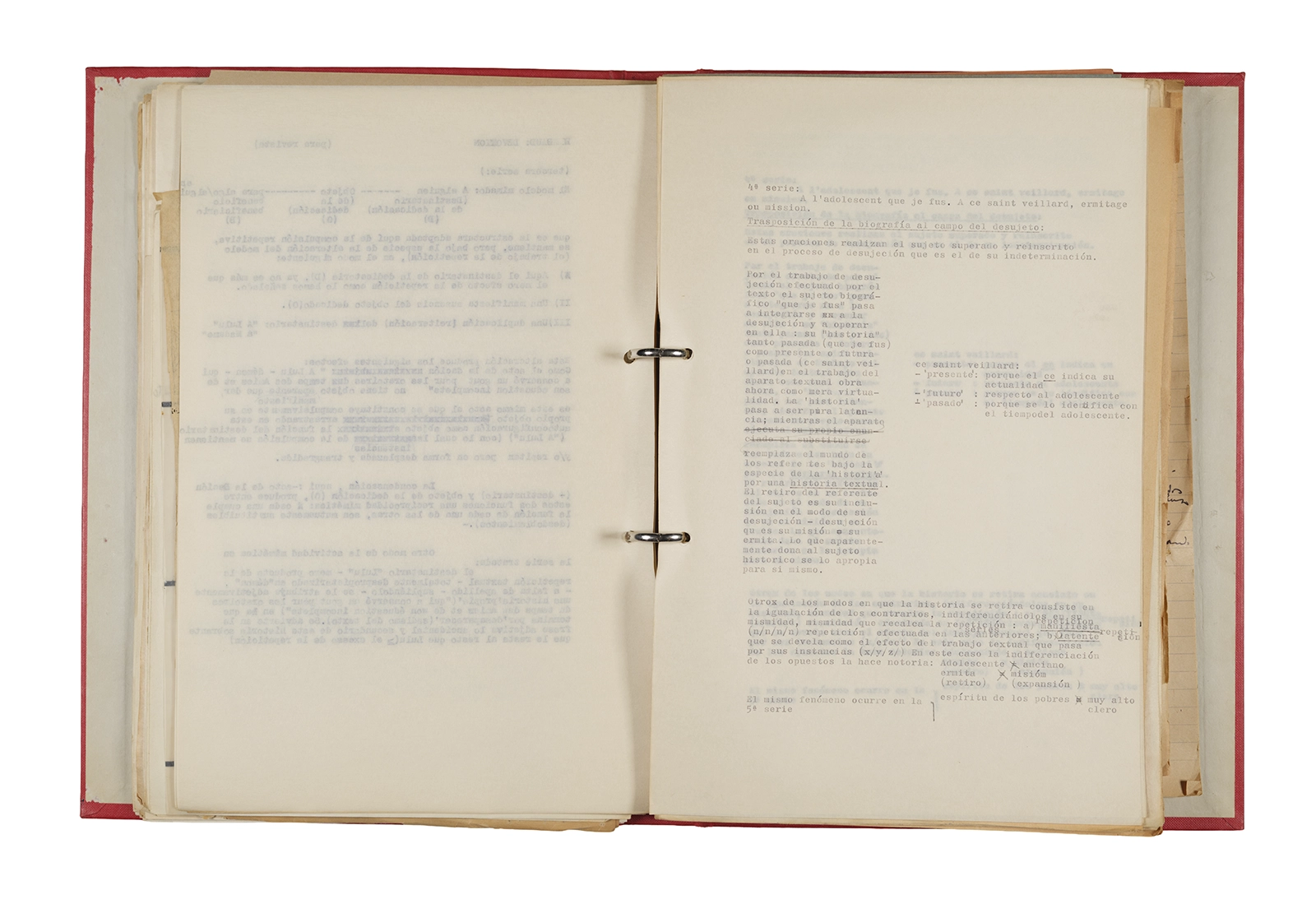 Papel roneo mecanografiado, apuntes manuscritos en tinta y grafito, clip metálico.