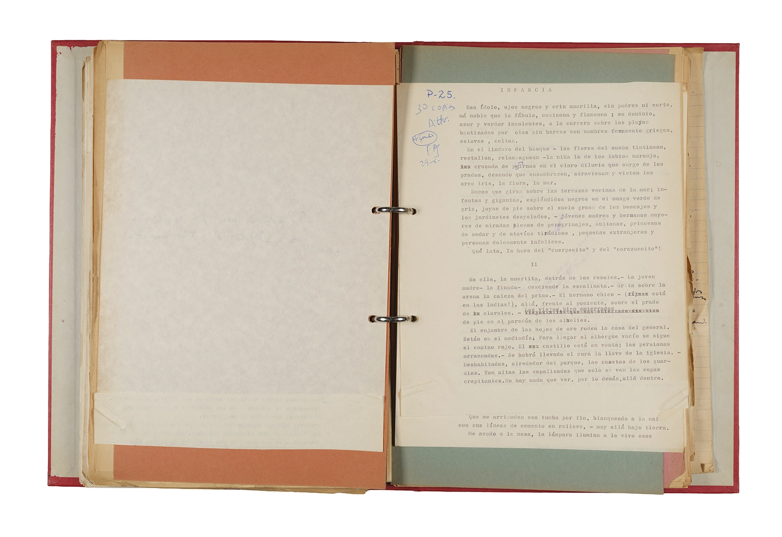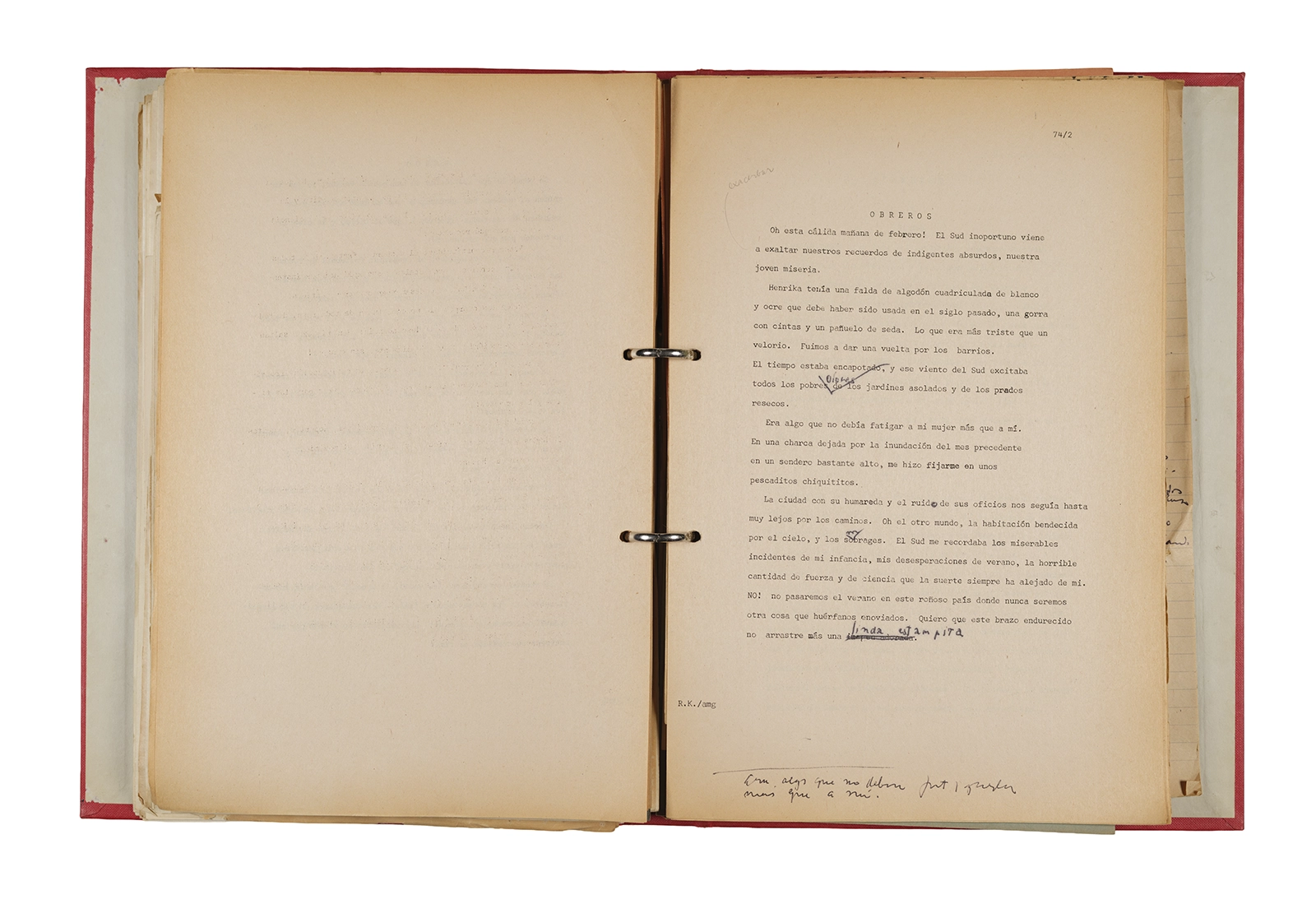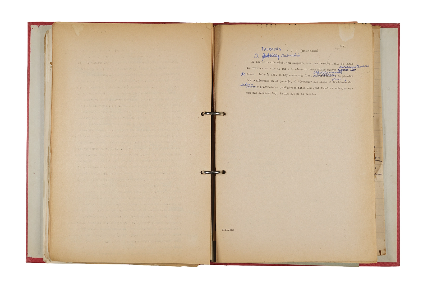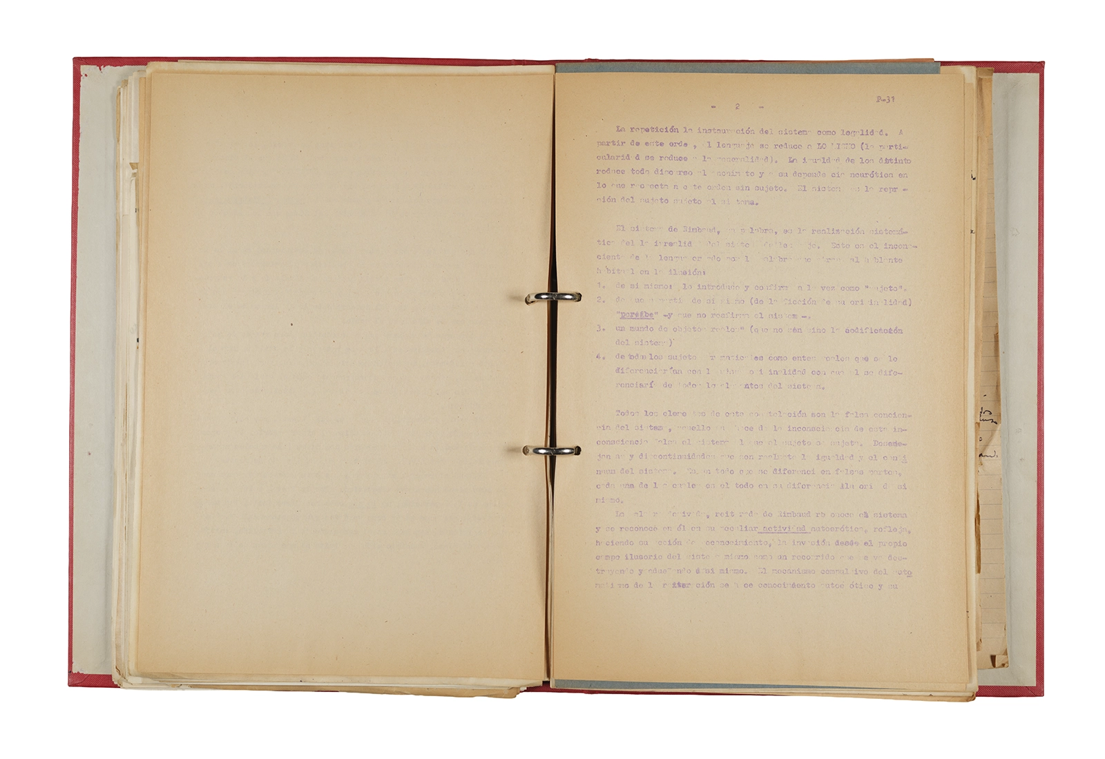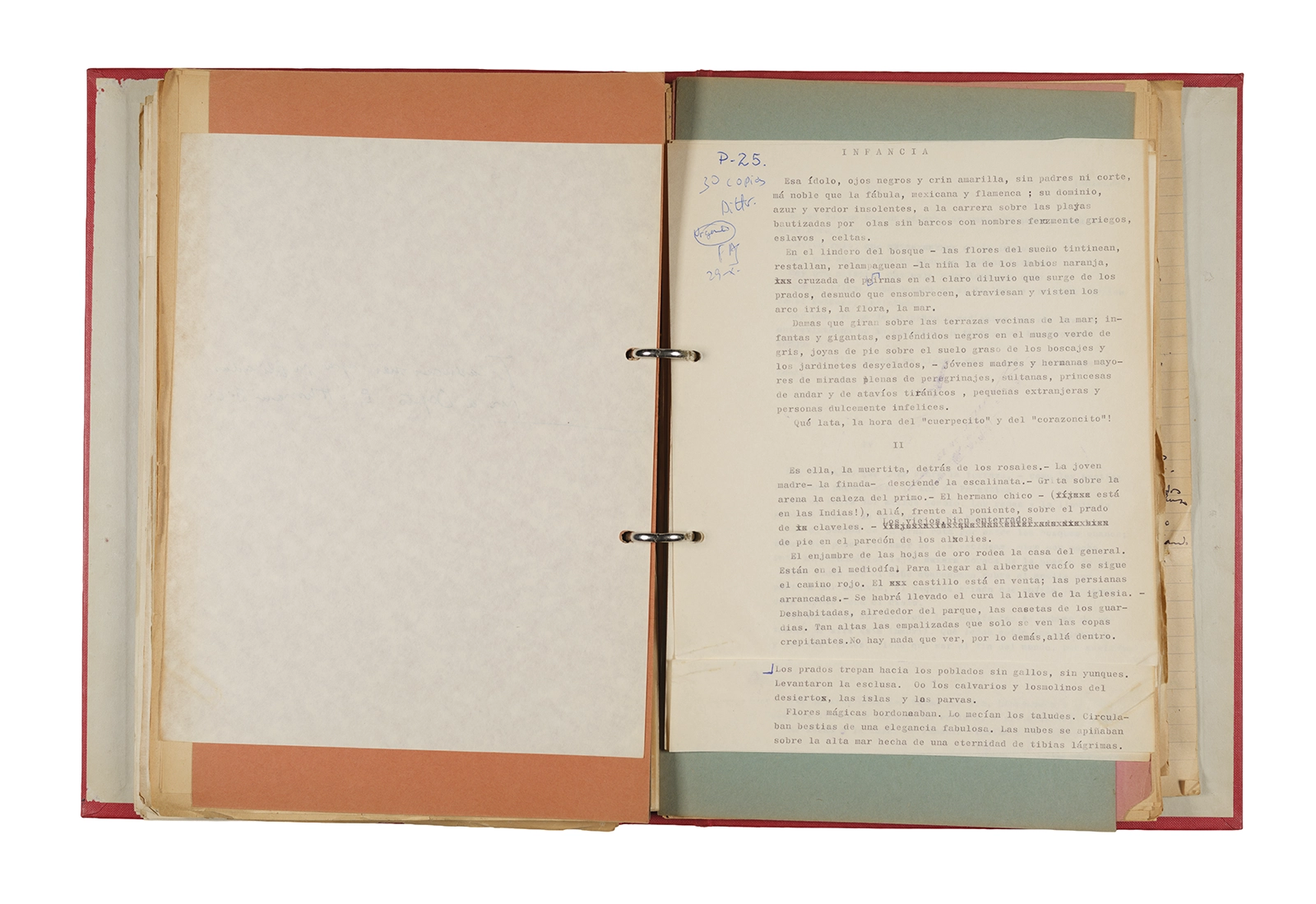 Papel roneo mecanografiado, apuntes manuscritos en tinta y grafito, clip metálico.
