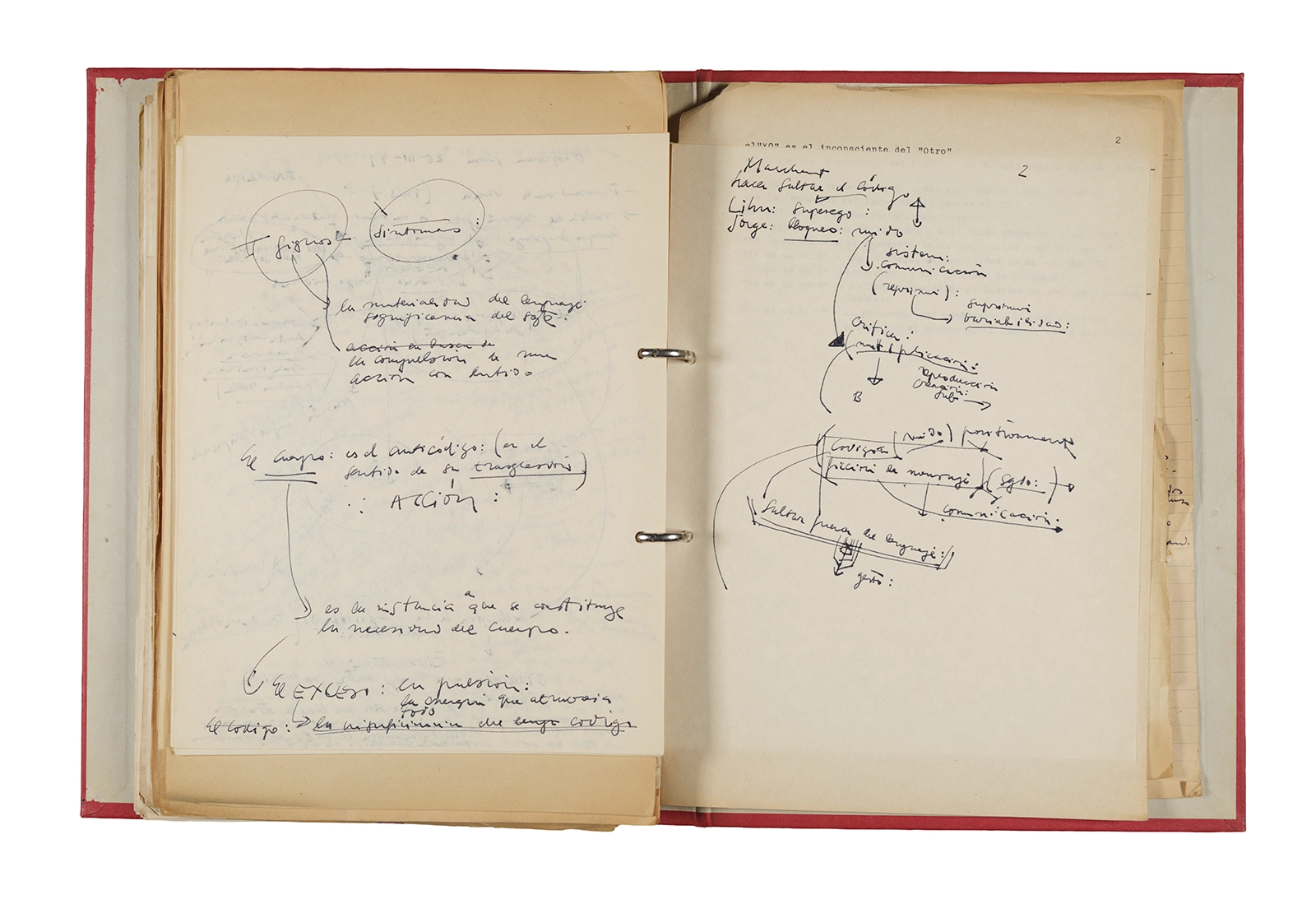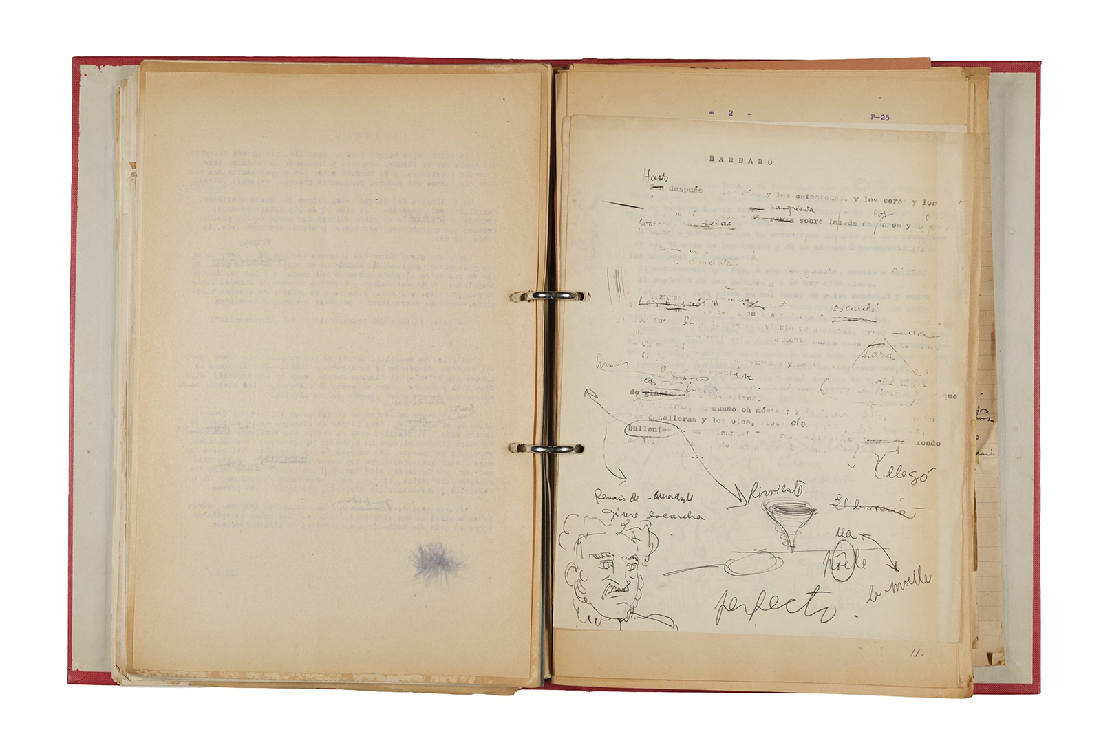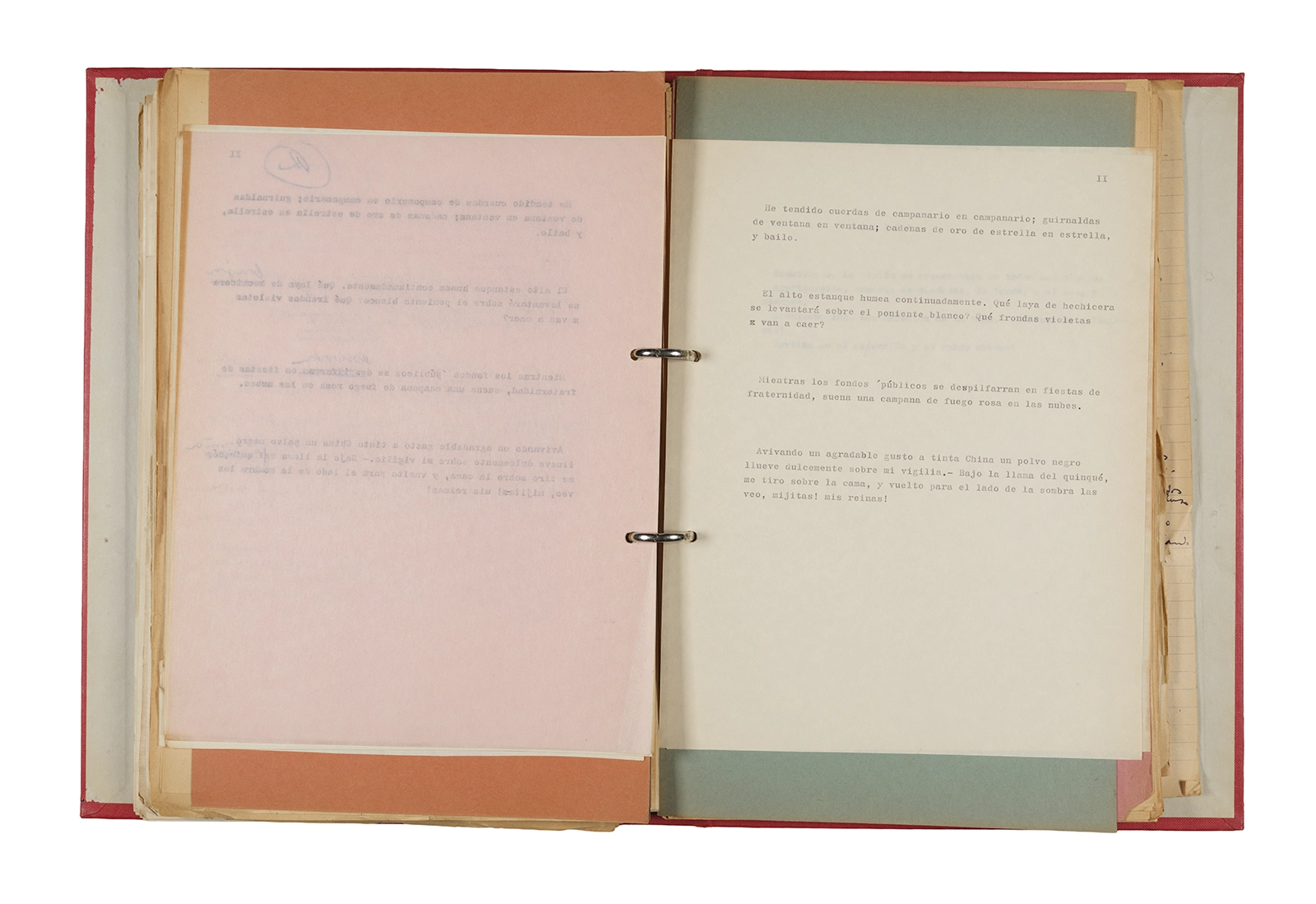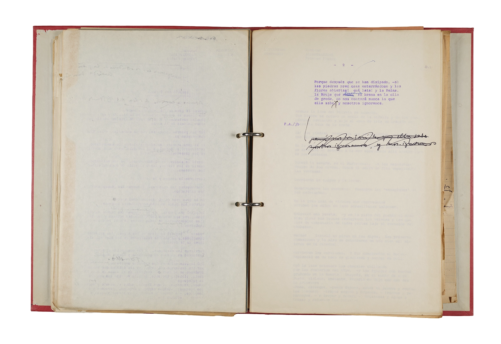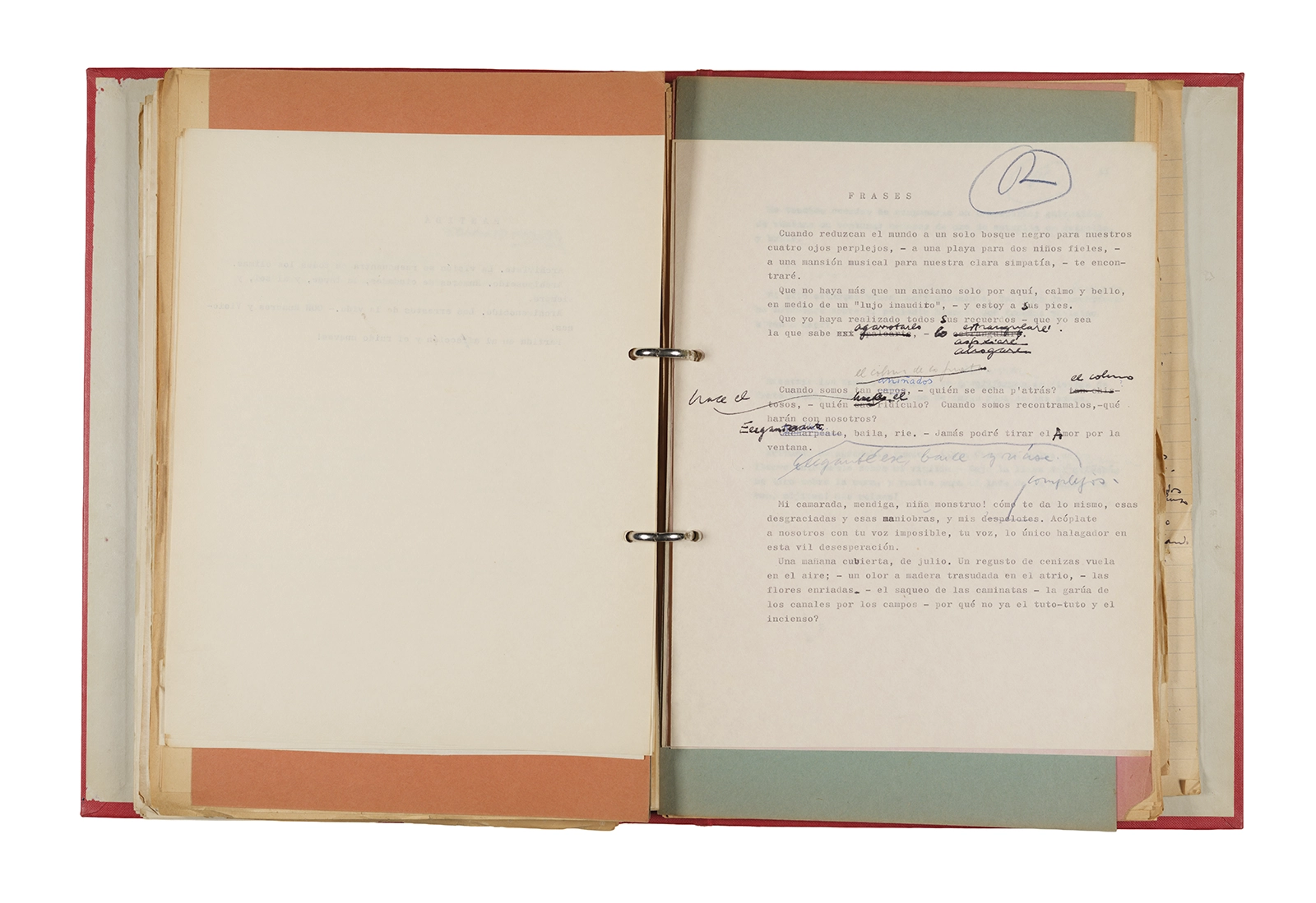 Papel roneo mecanografiado, apuntes manuscritos en tinta y grafito, clip metálico.