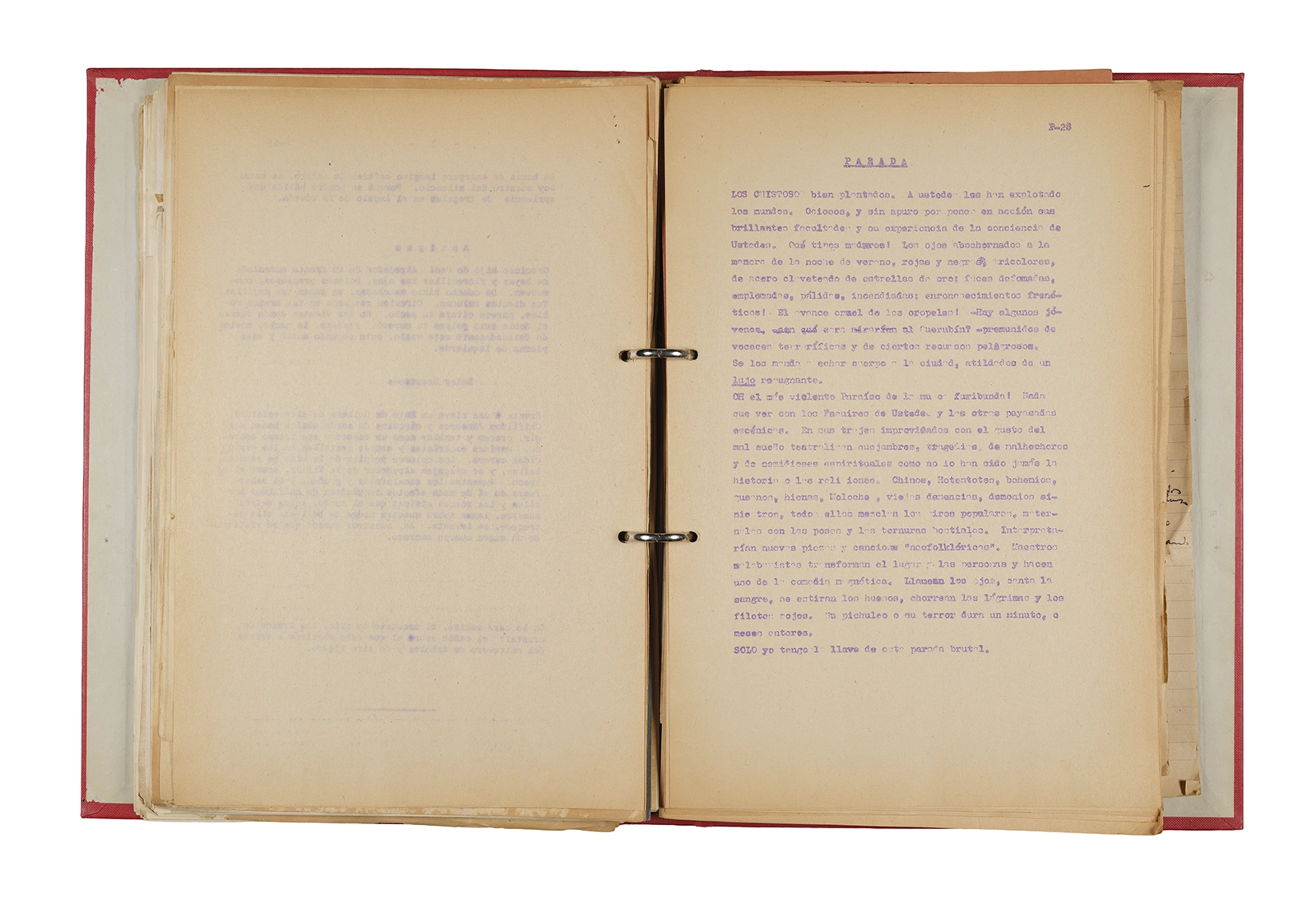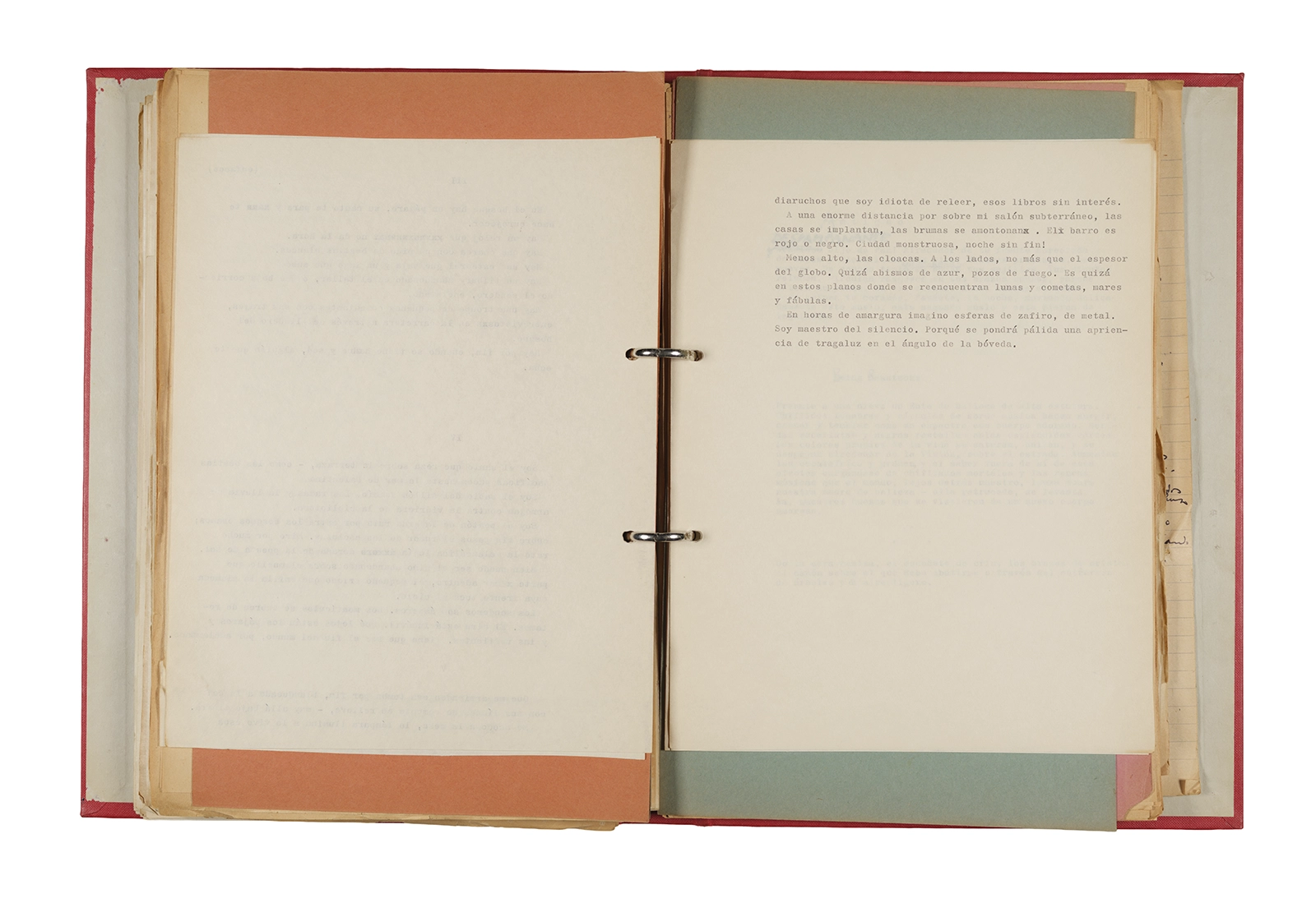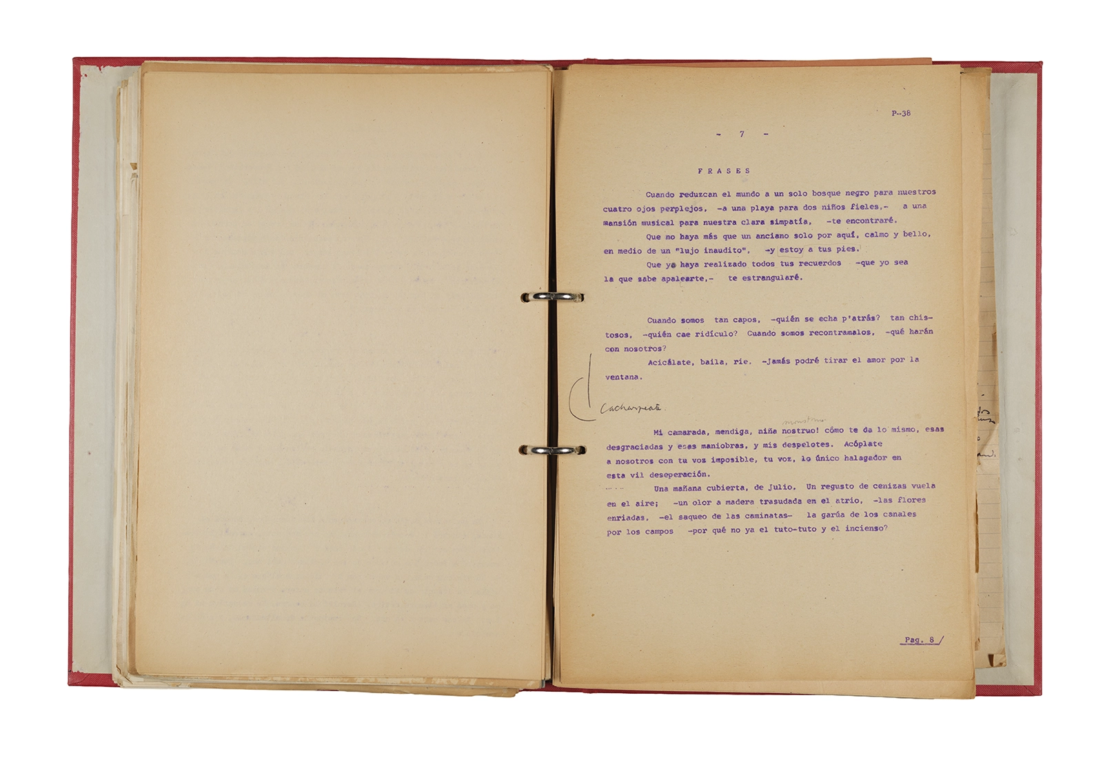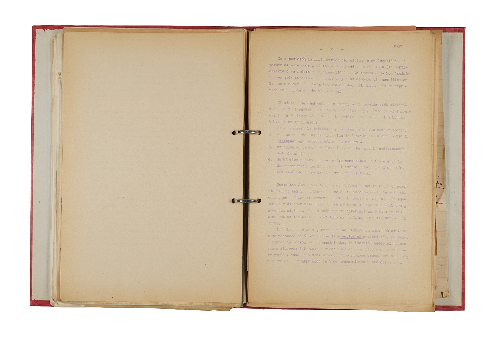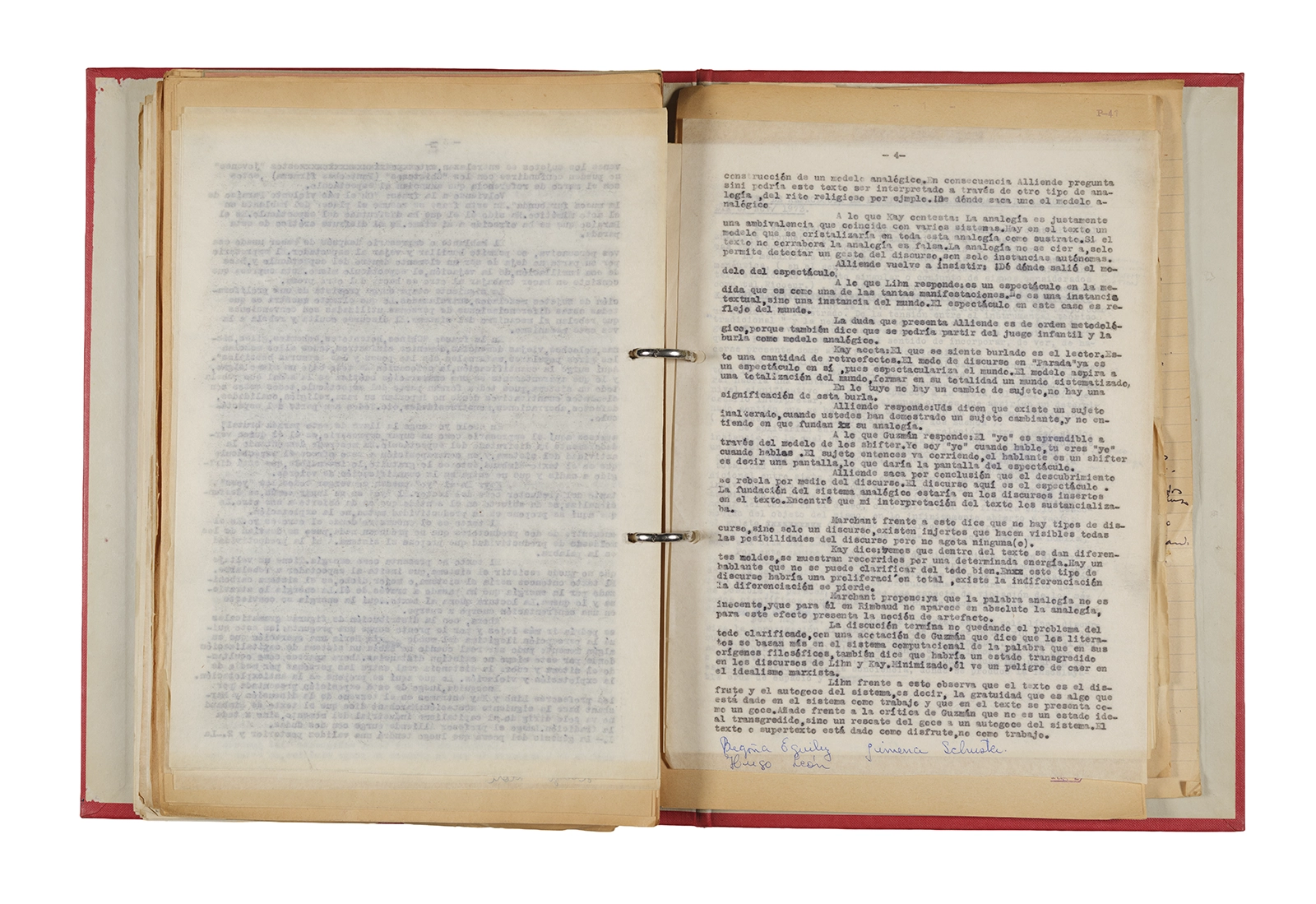 Papel roneo mecanografiado, apuntes manuscritos en tinta y grafito, clip metálico.