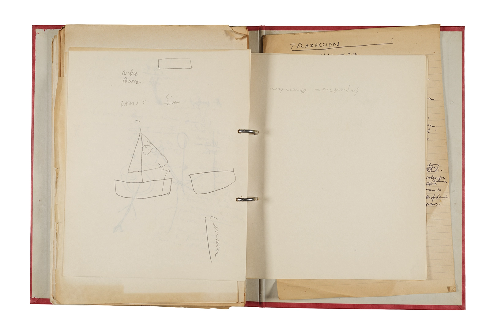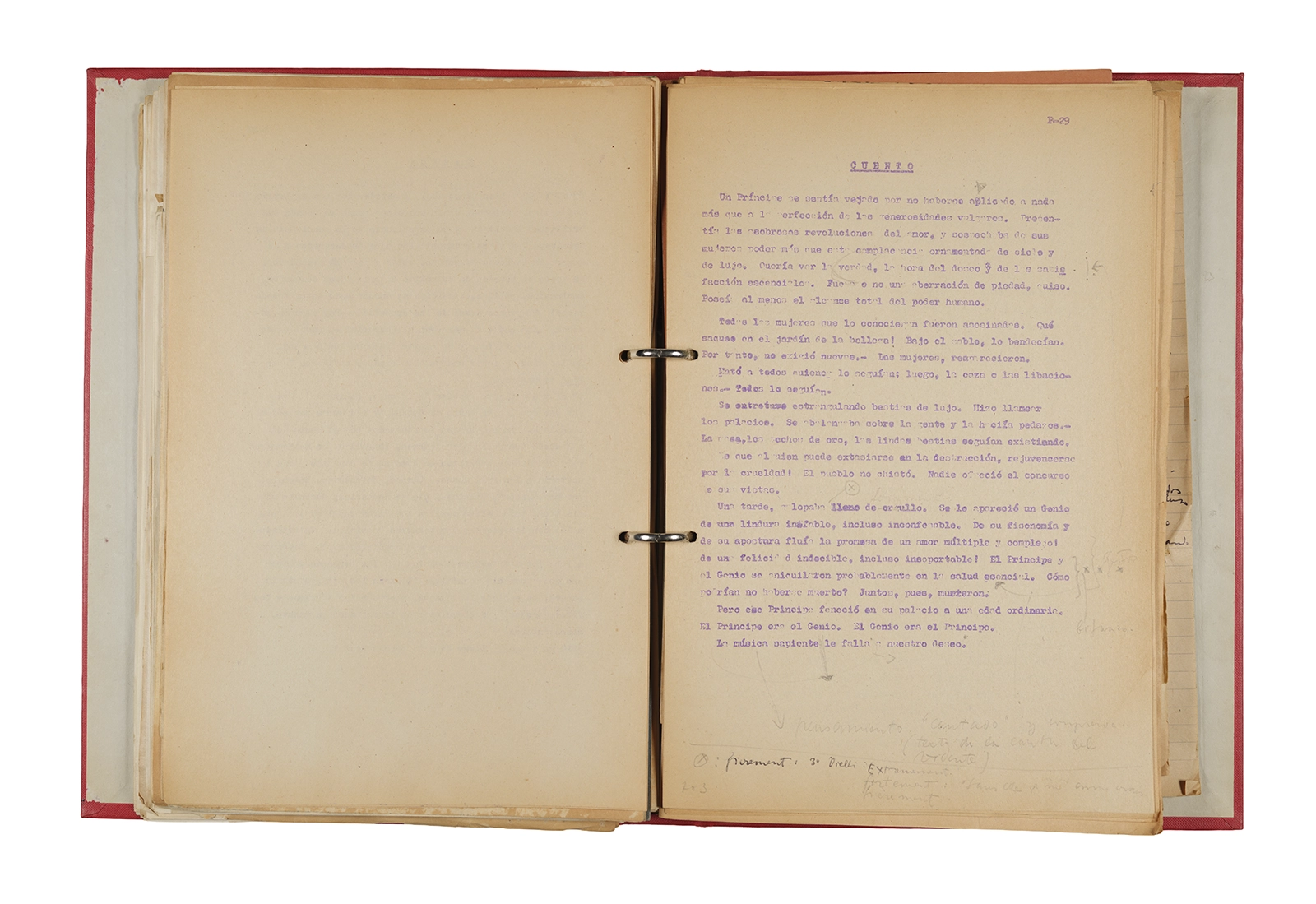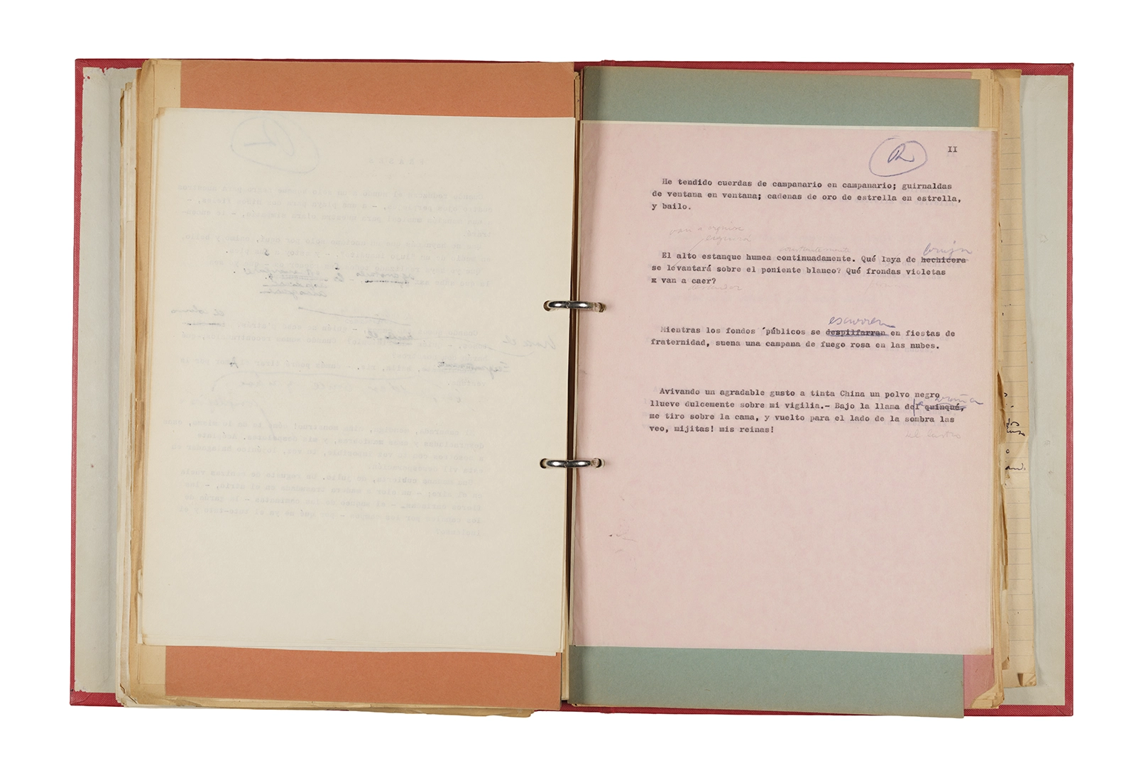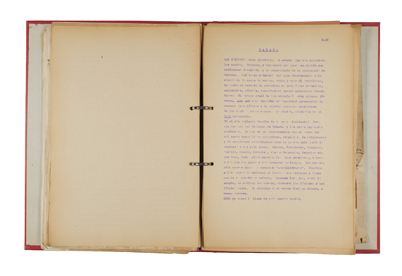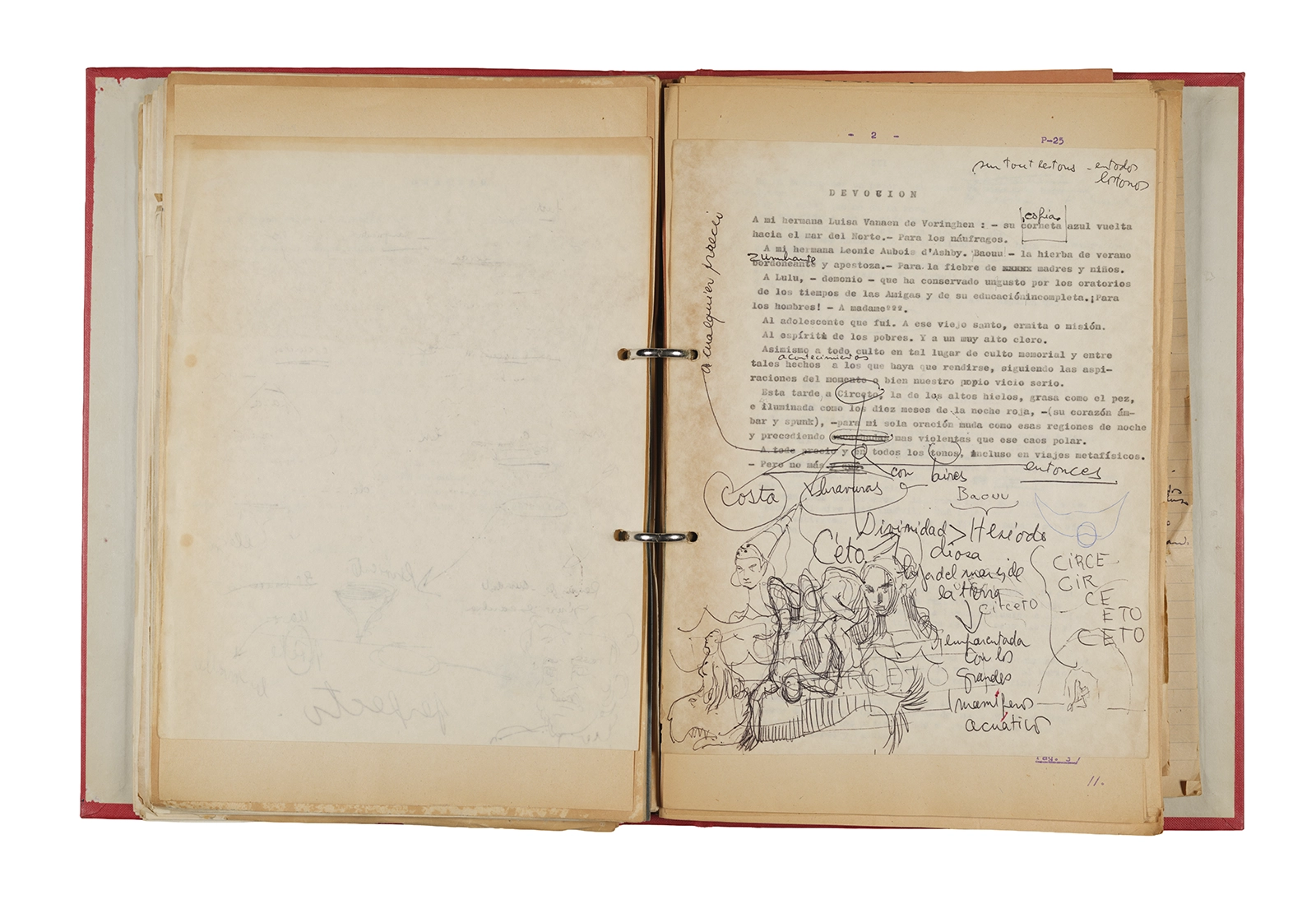 Papel roneo mecanografiado, apuntes manuscritos en tinta y grafito, clip metálico.