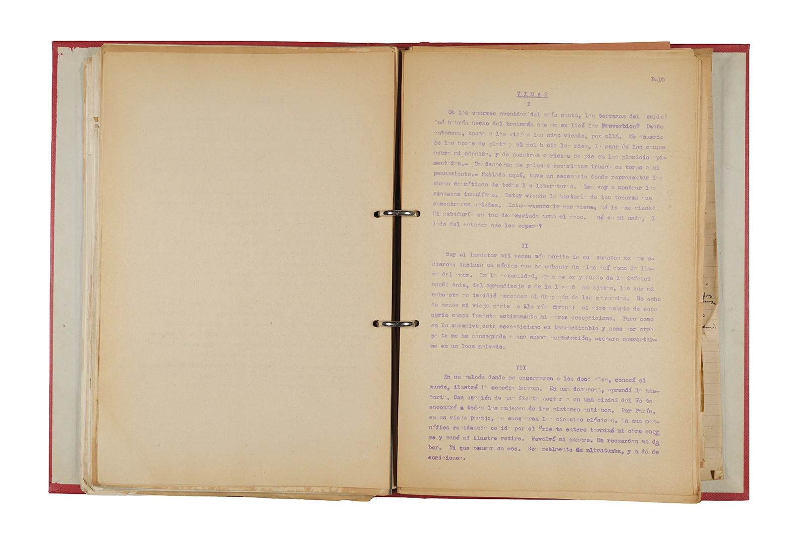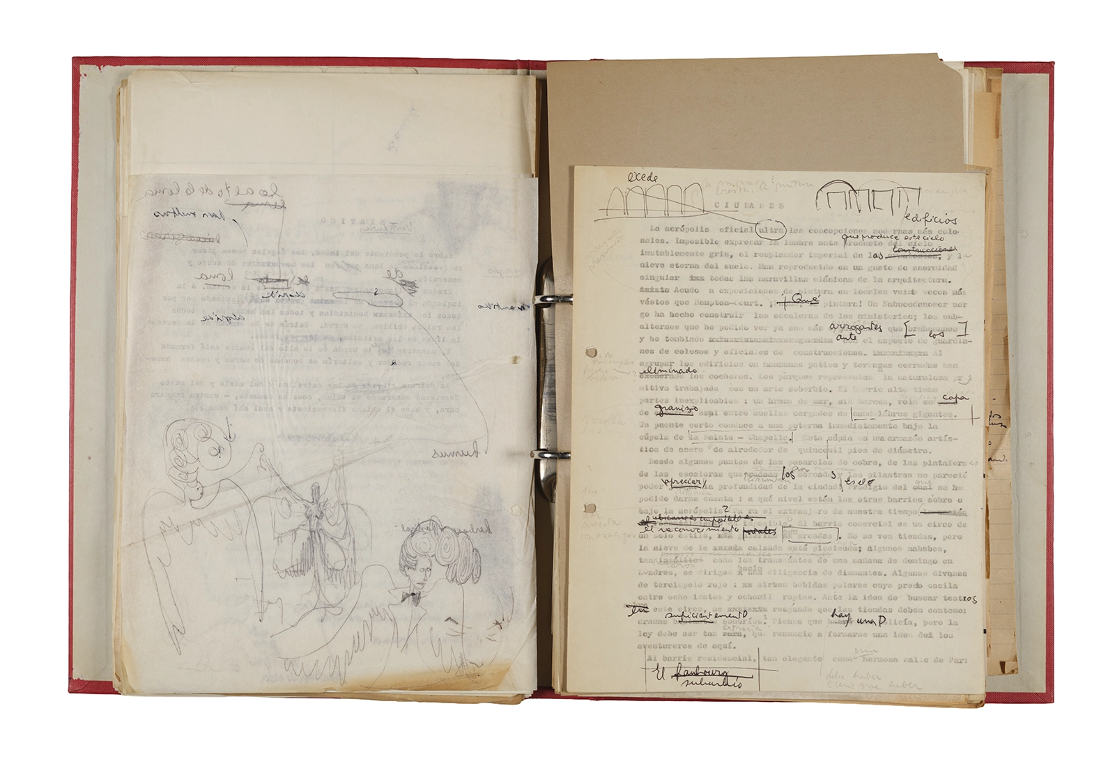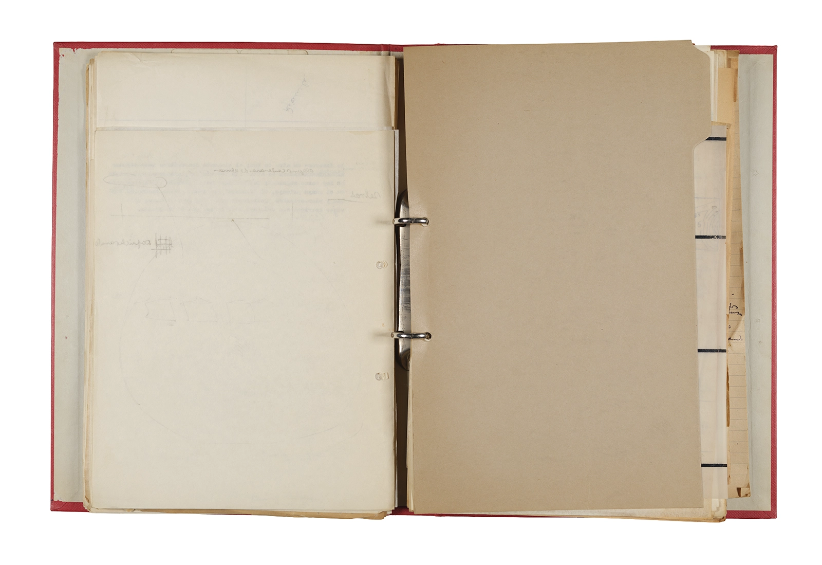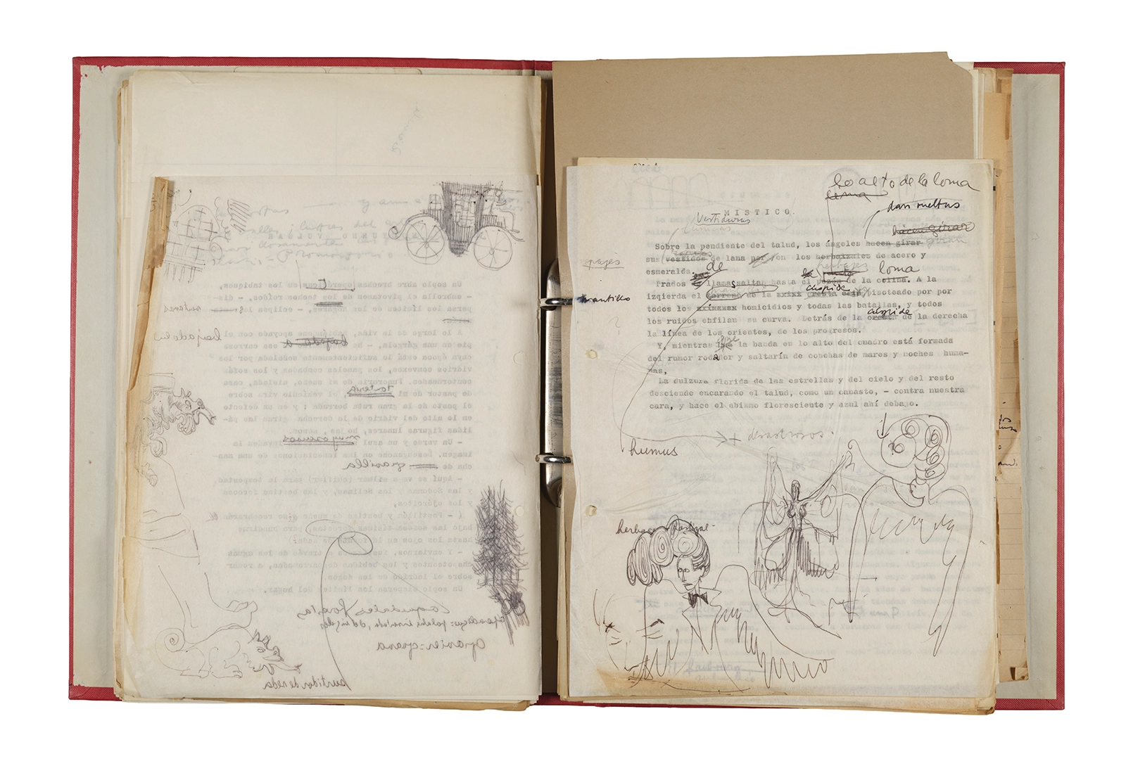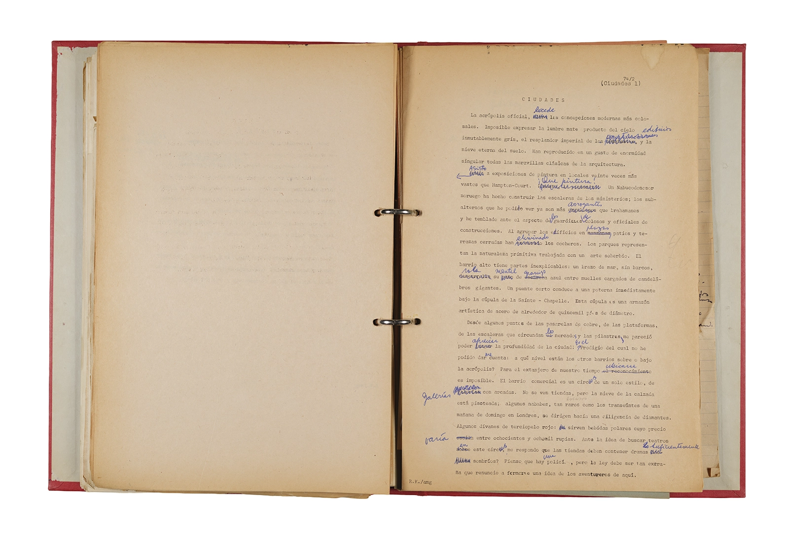 Papel roneo mecanografiado, apuntes manuscritos en tinta y grafito, clip metálico.