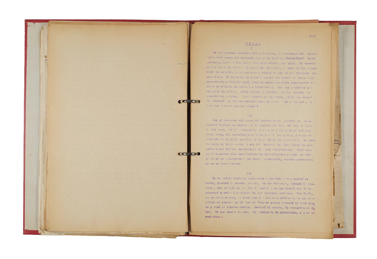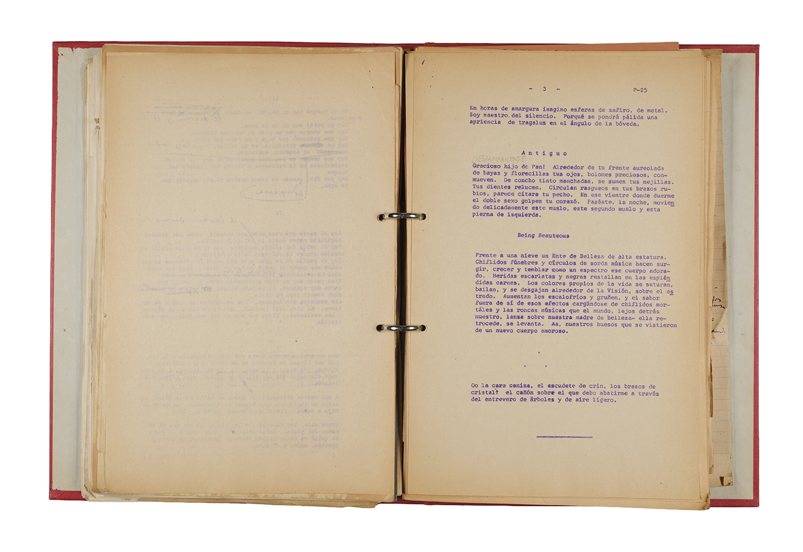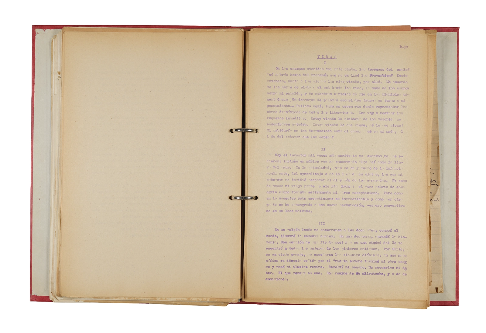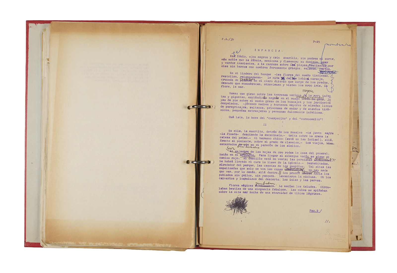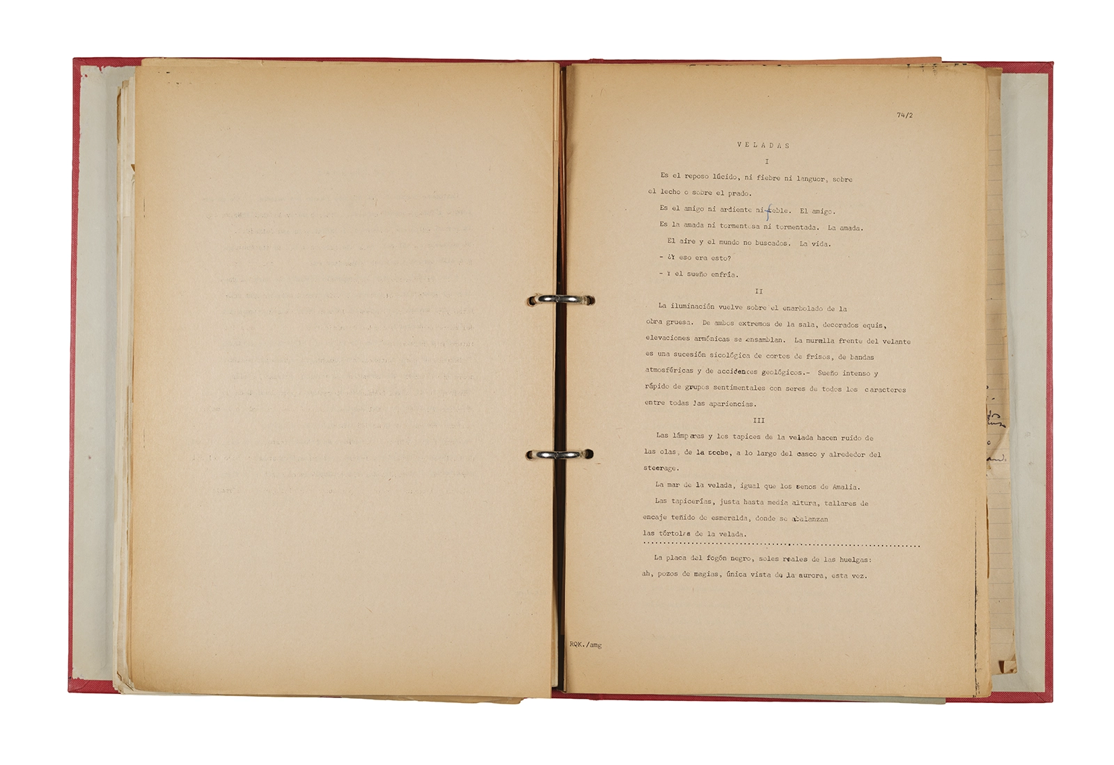 Papel roneo mecanografiado, apuntes manuscritos en tinta y grafito, clip metálico.