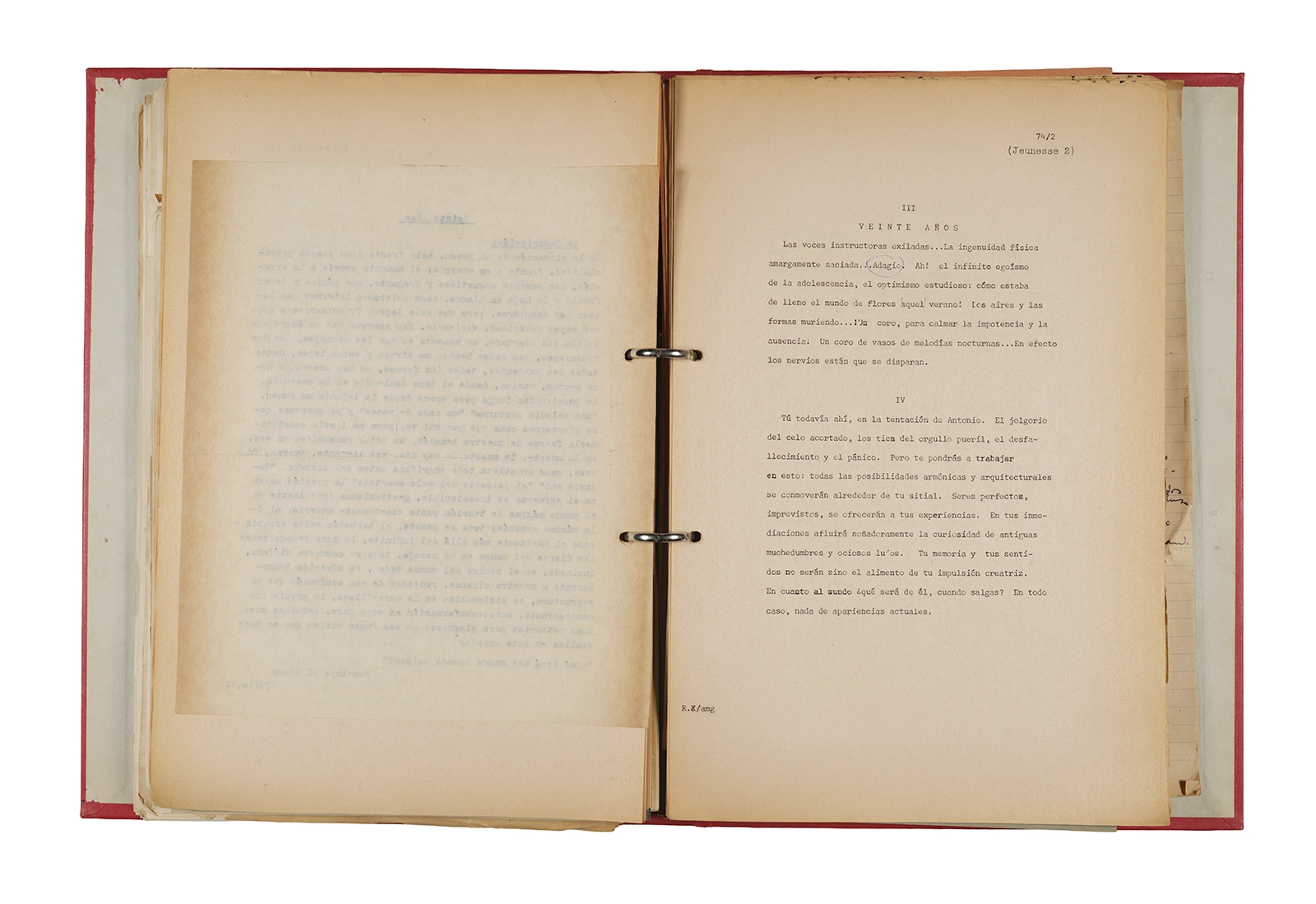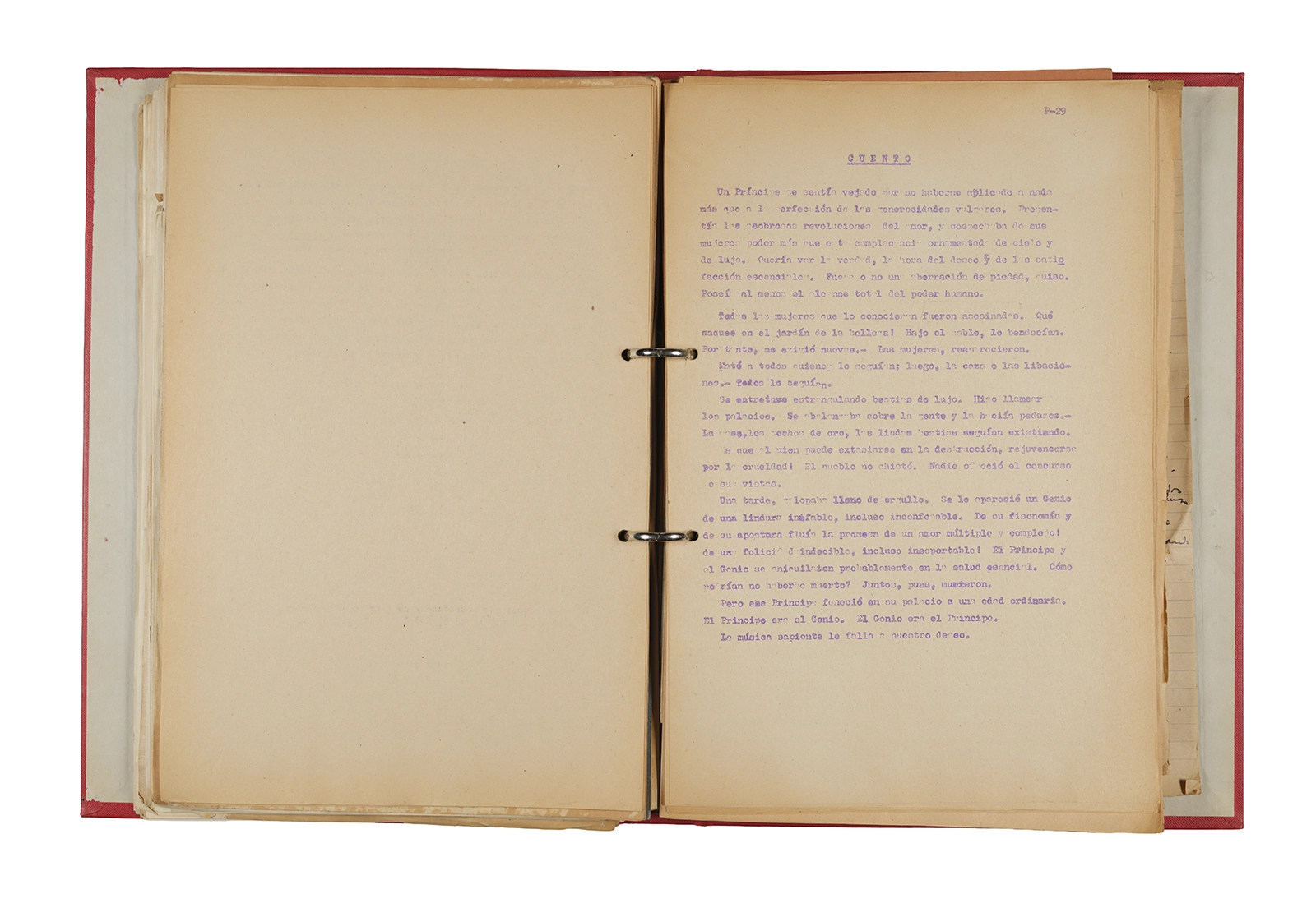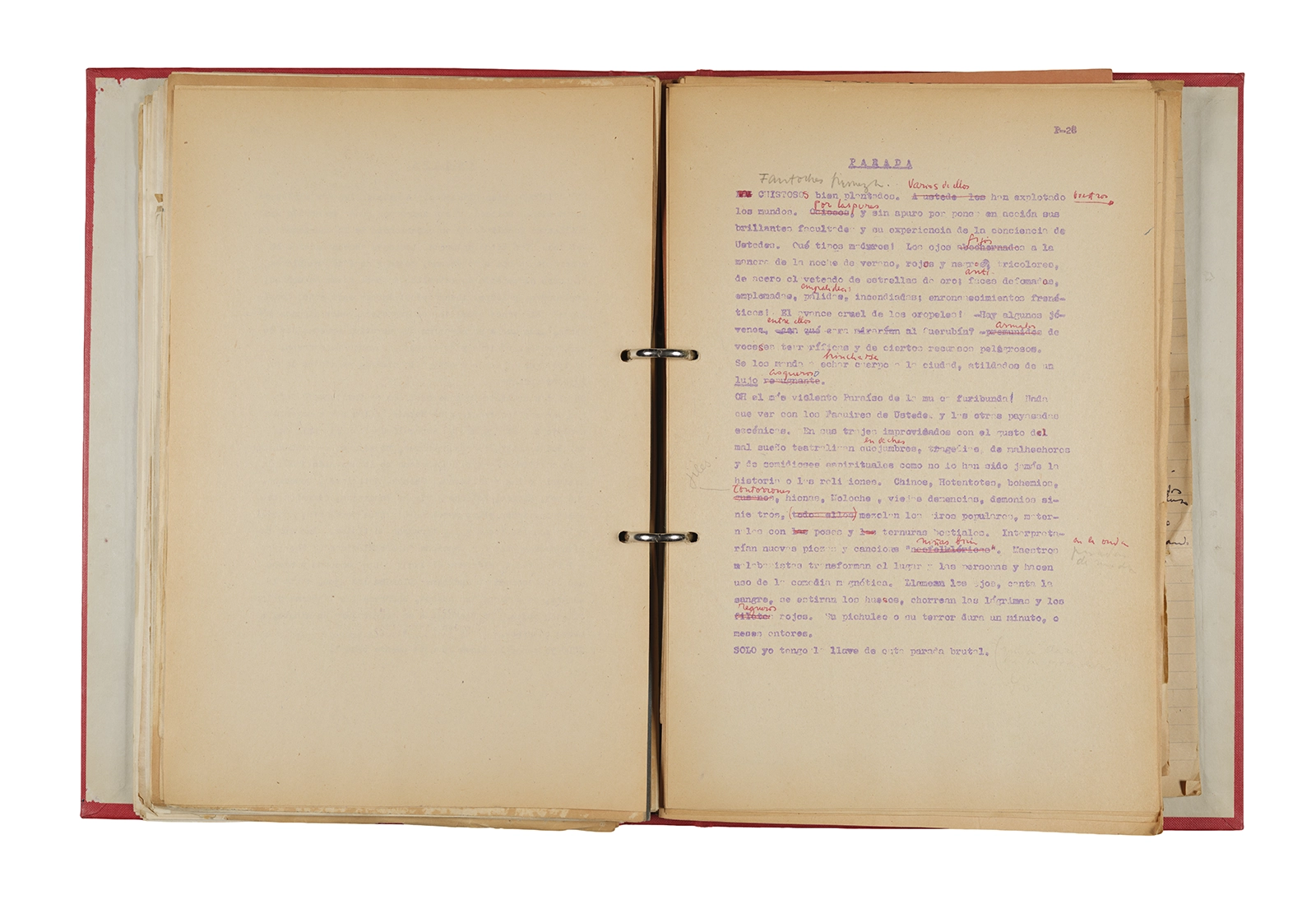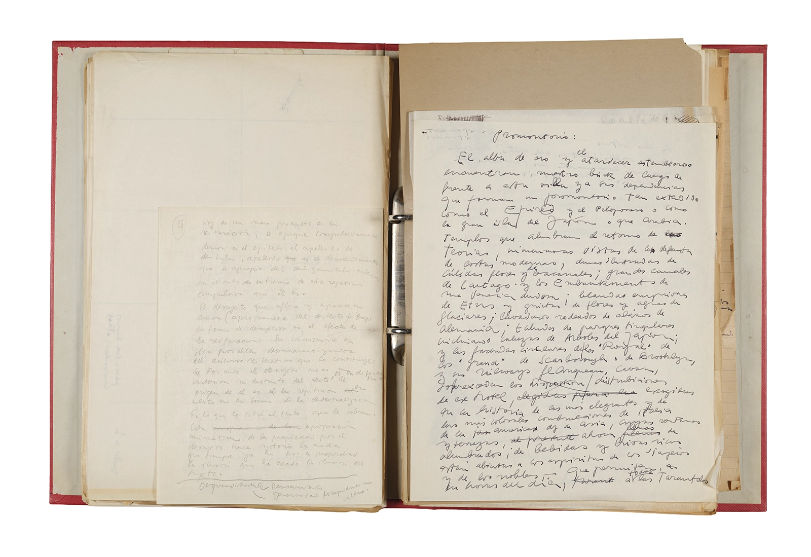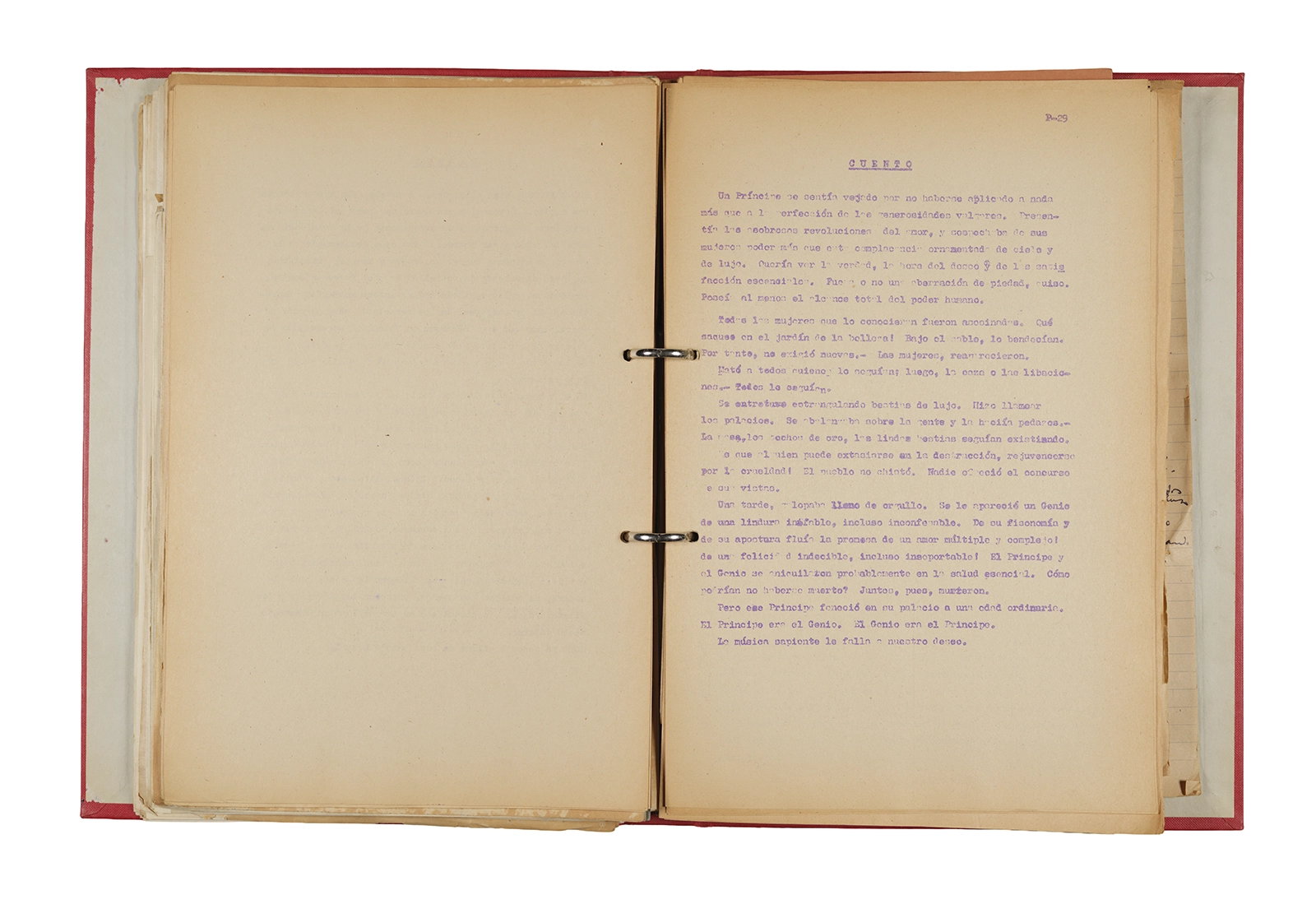 Papel roneo mecanografiado, apuntes manuscritos en tinta y grafito, clip metálico.
