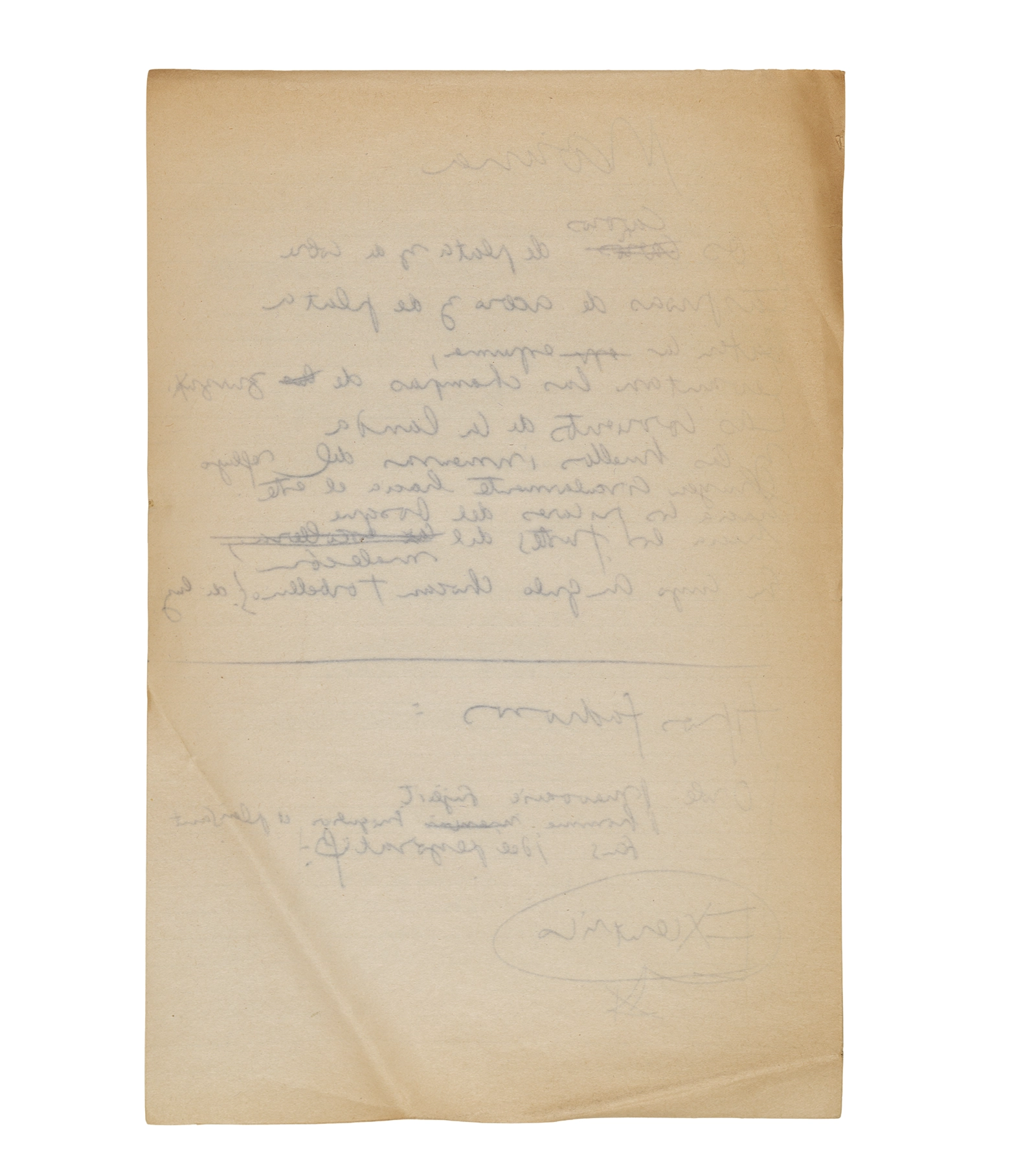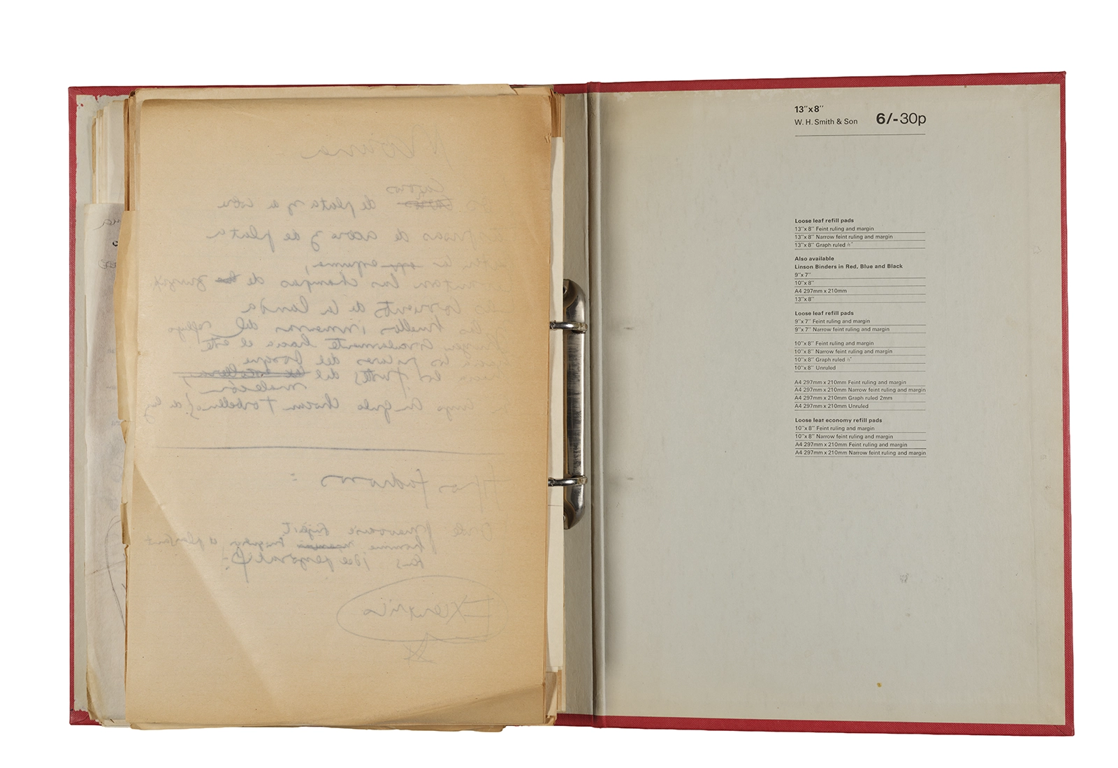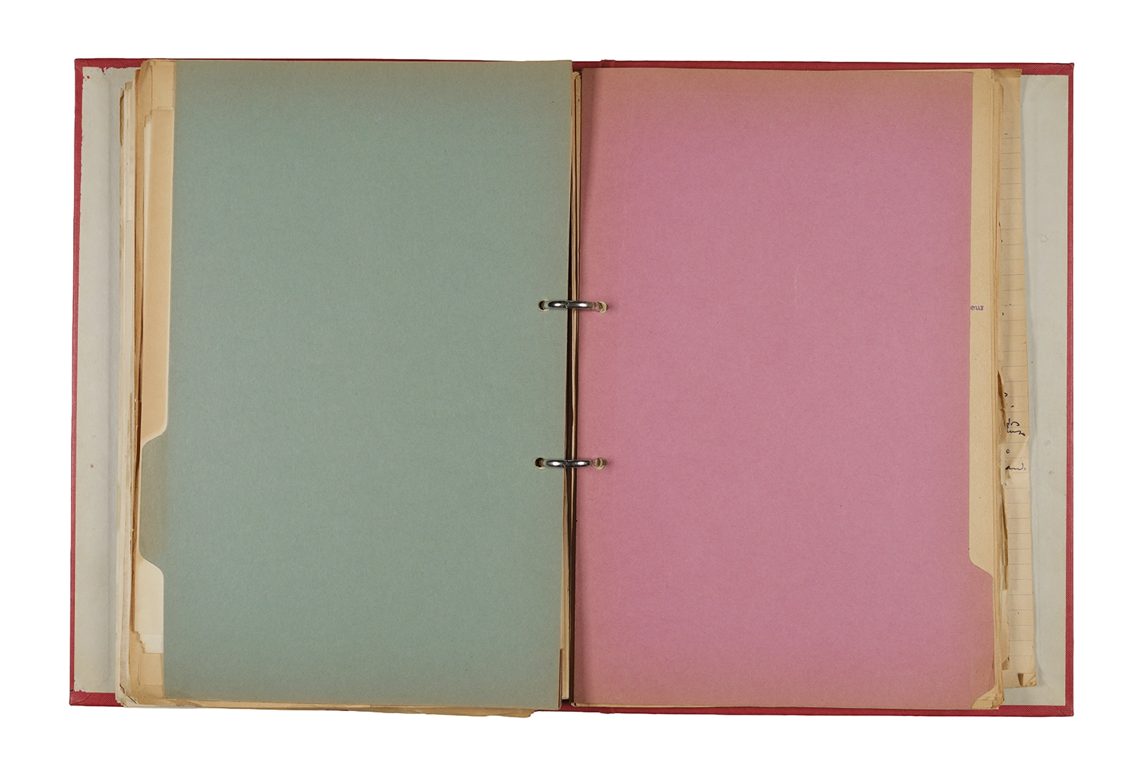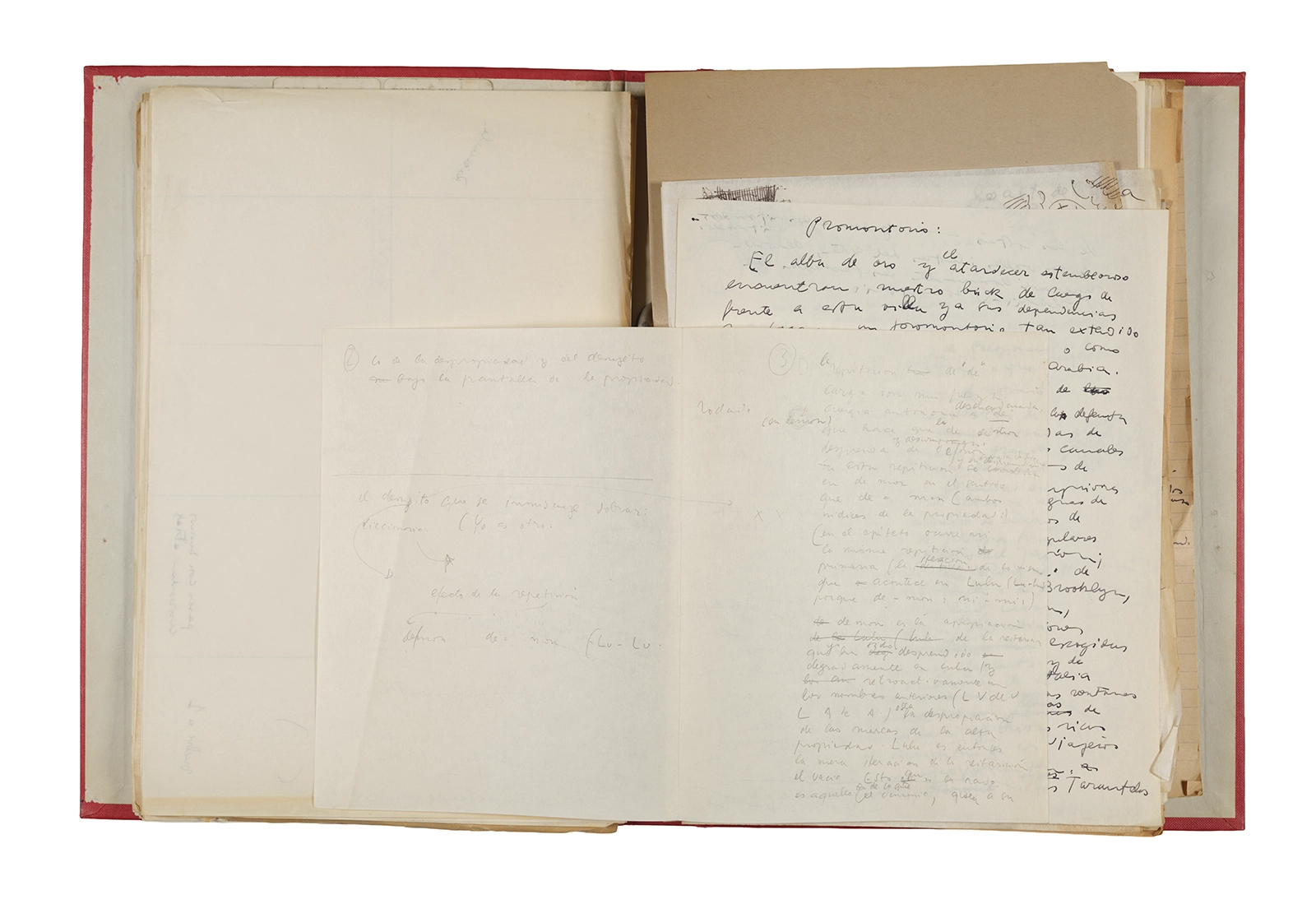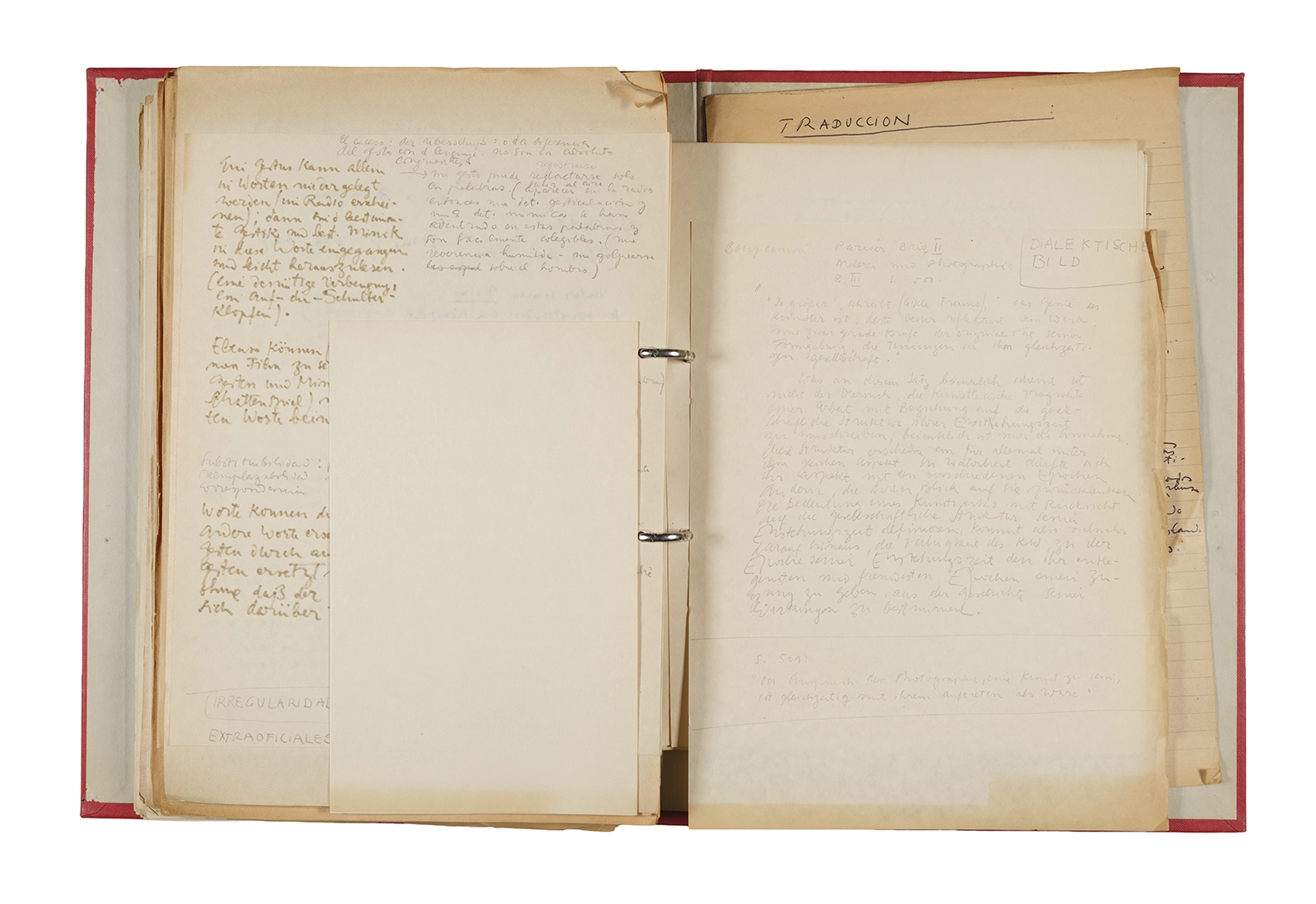 Papel roneo mecanografiado, apuntes manuscritos en tinta y grafito, clip metálico.