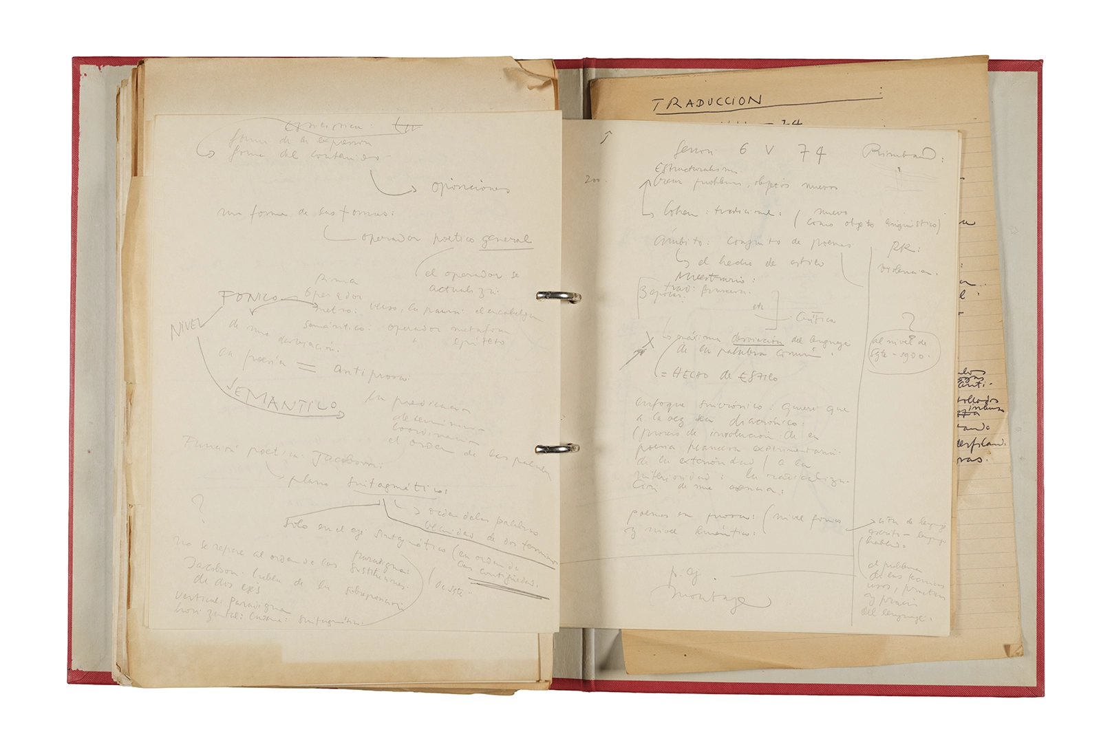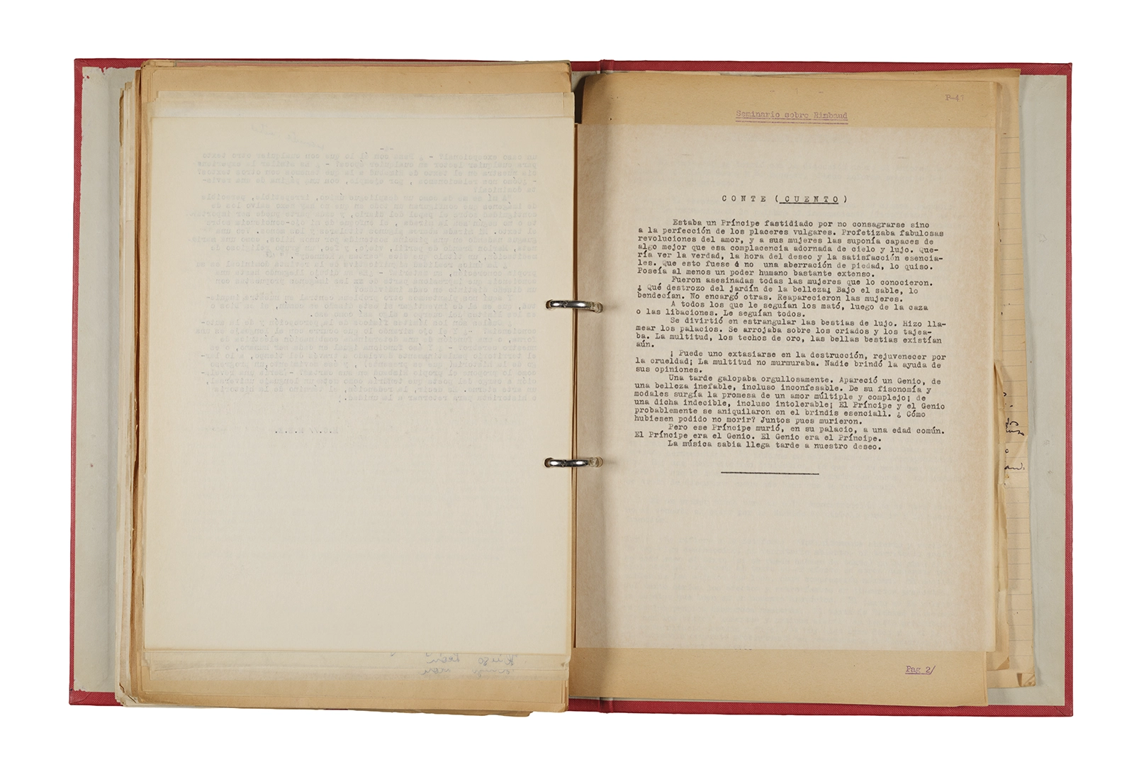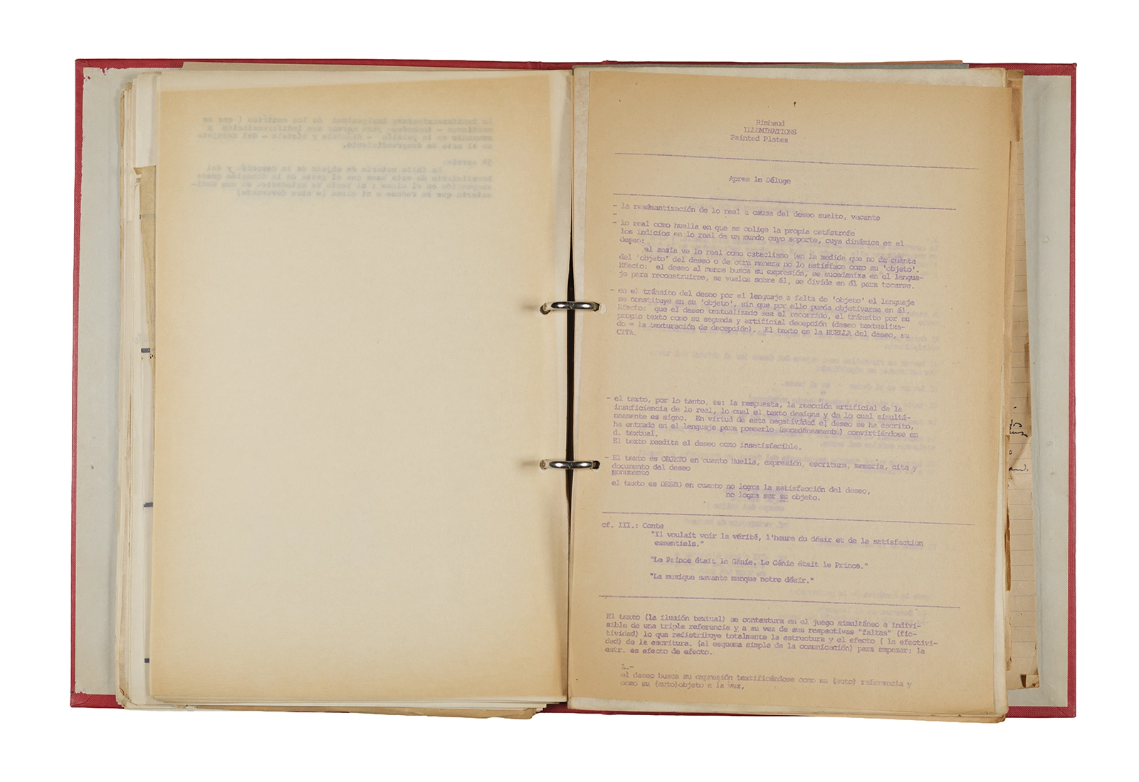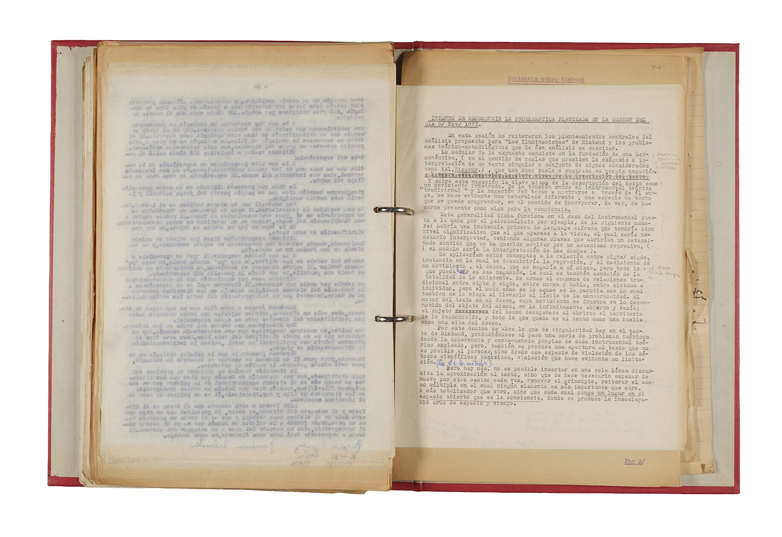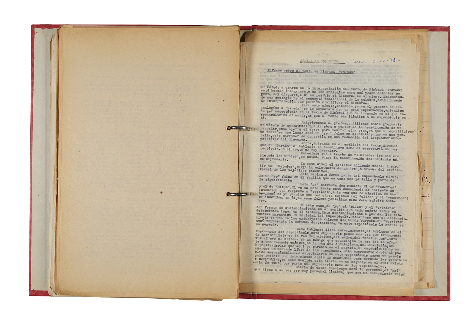 Carpeta Seminario Rimbaud 1973/74: apuntes, dossier traducciones, trabajos, lista de asistencia.