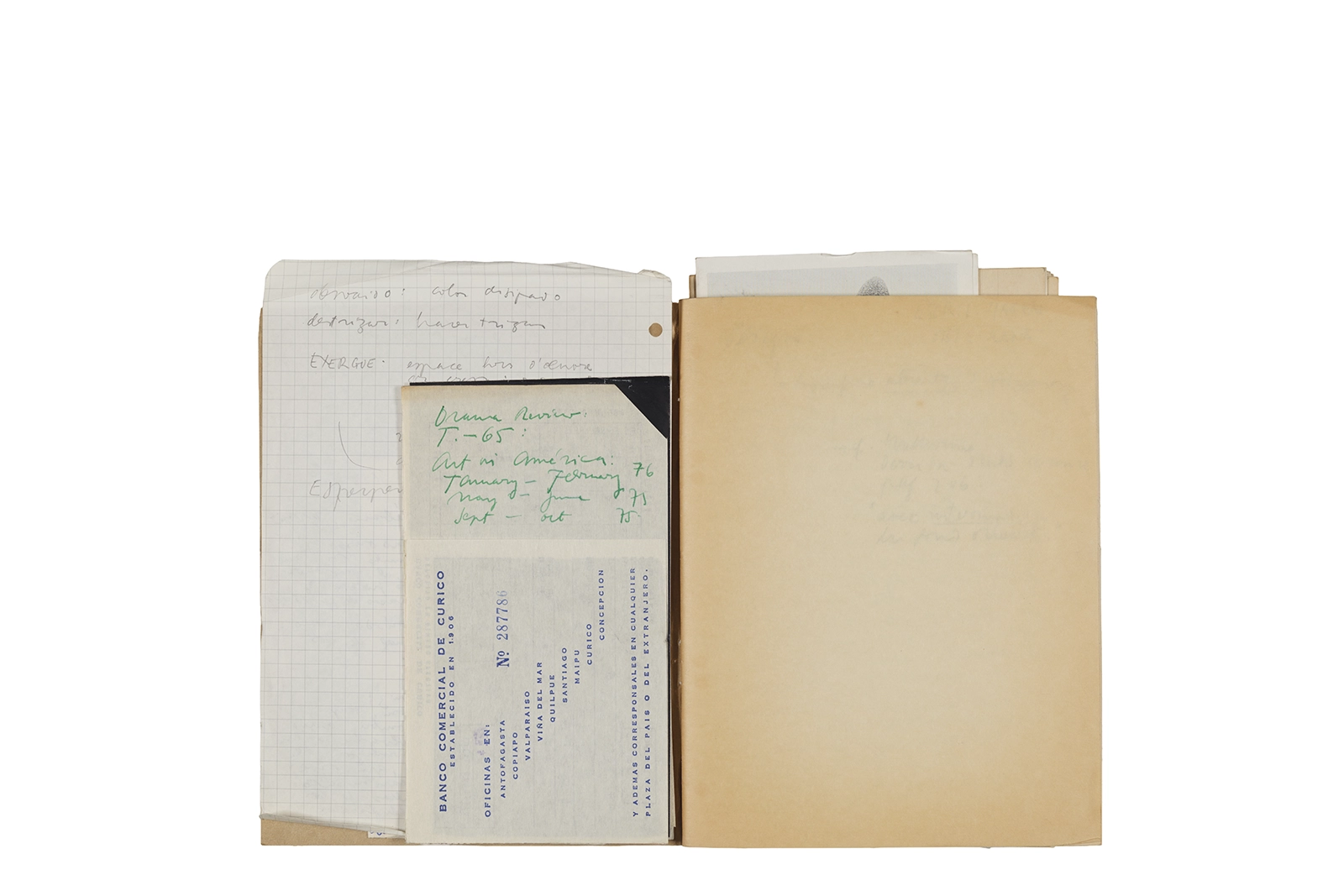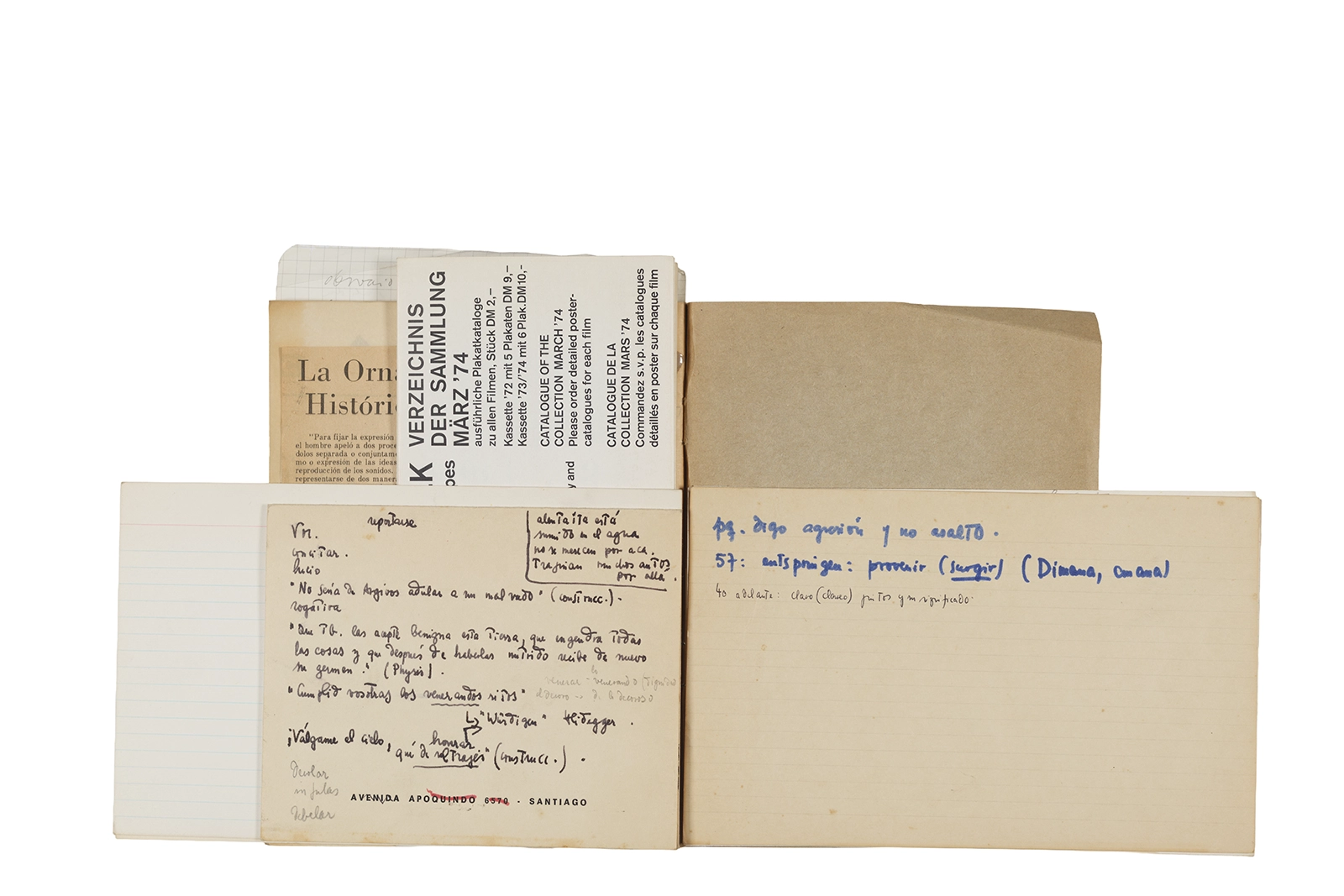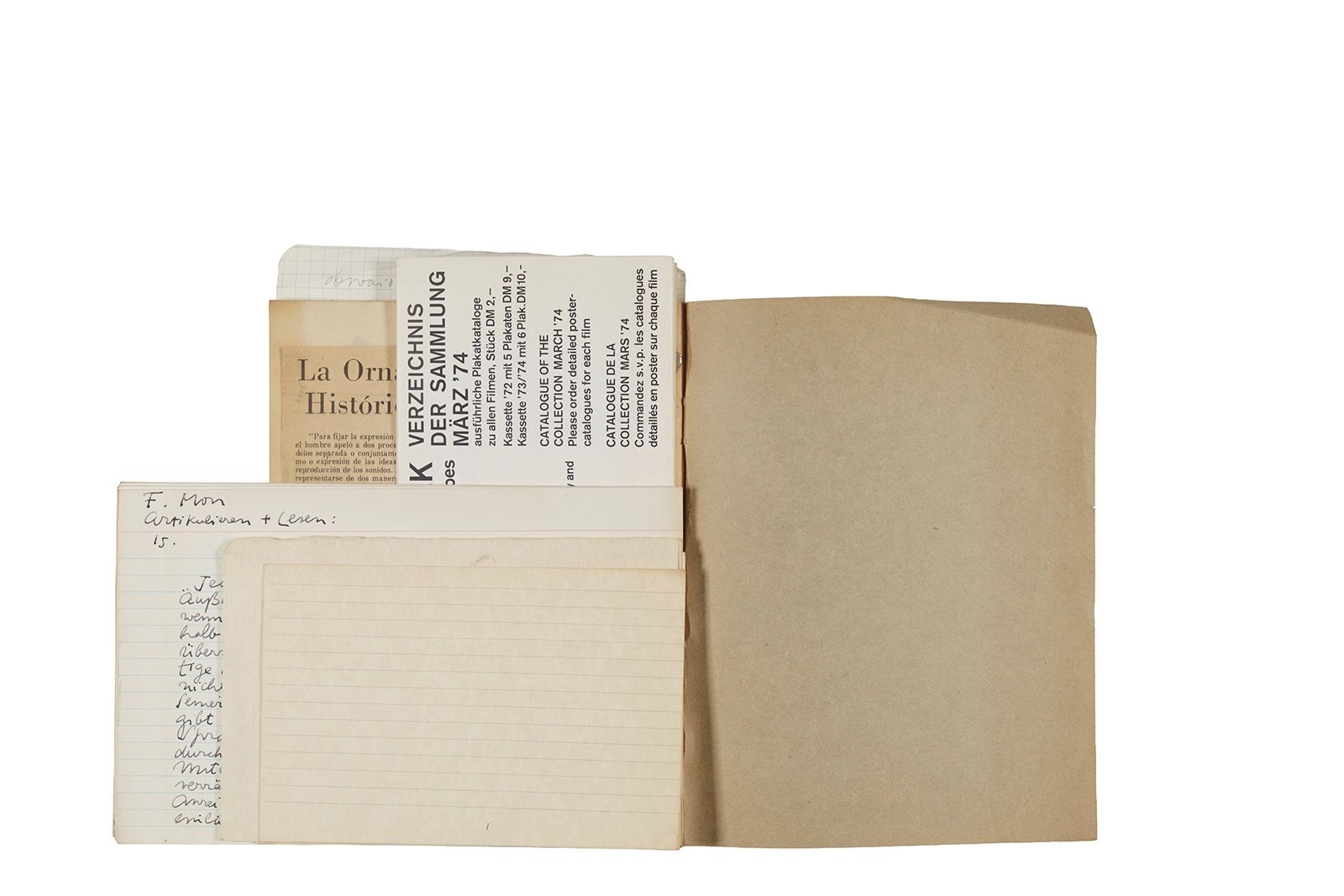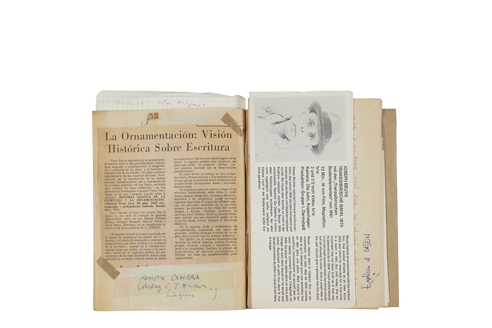 Cuaderno con tapa blanda unida al lomo con corchetes metálicos, manuscritos en tinta y grafito, fichas bibliográficas, recortes de prensa y cinta adhesiva.