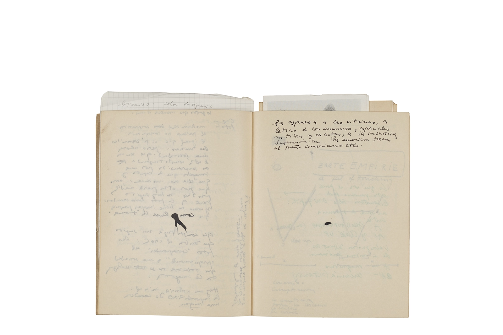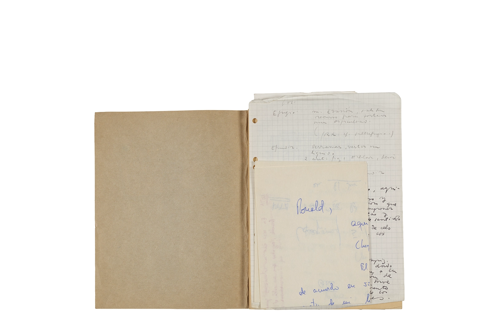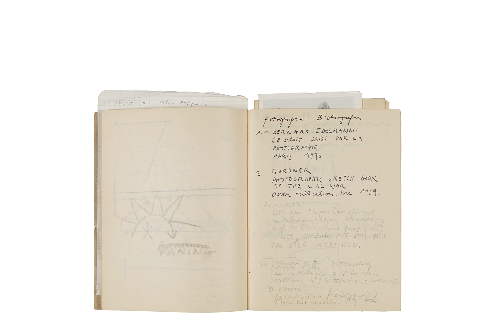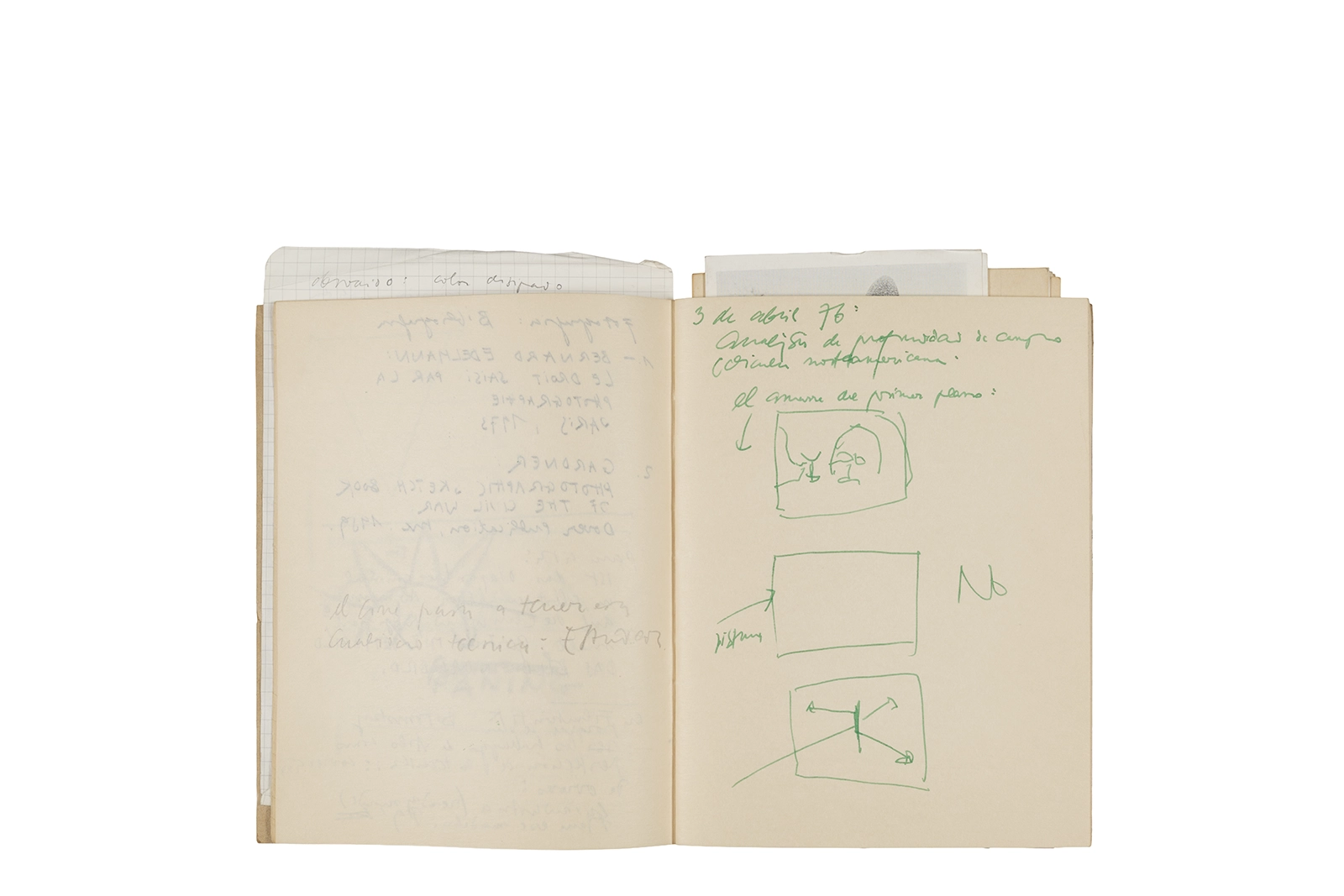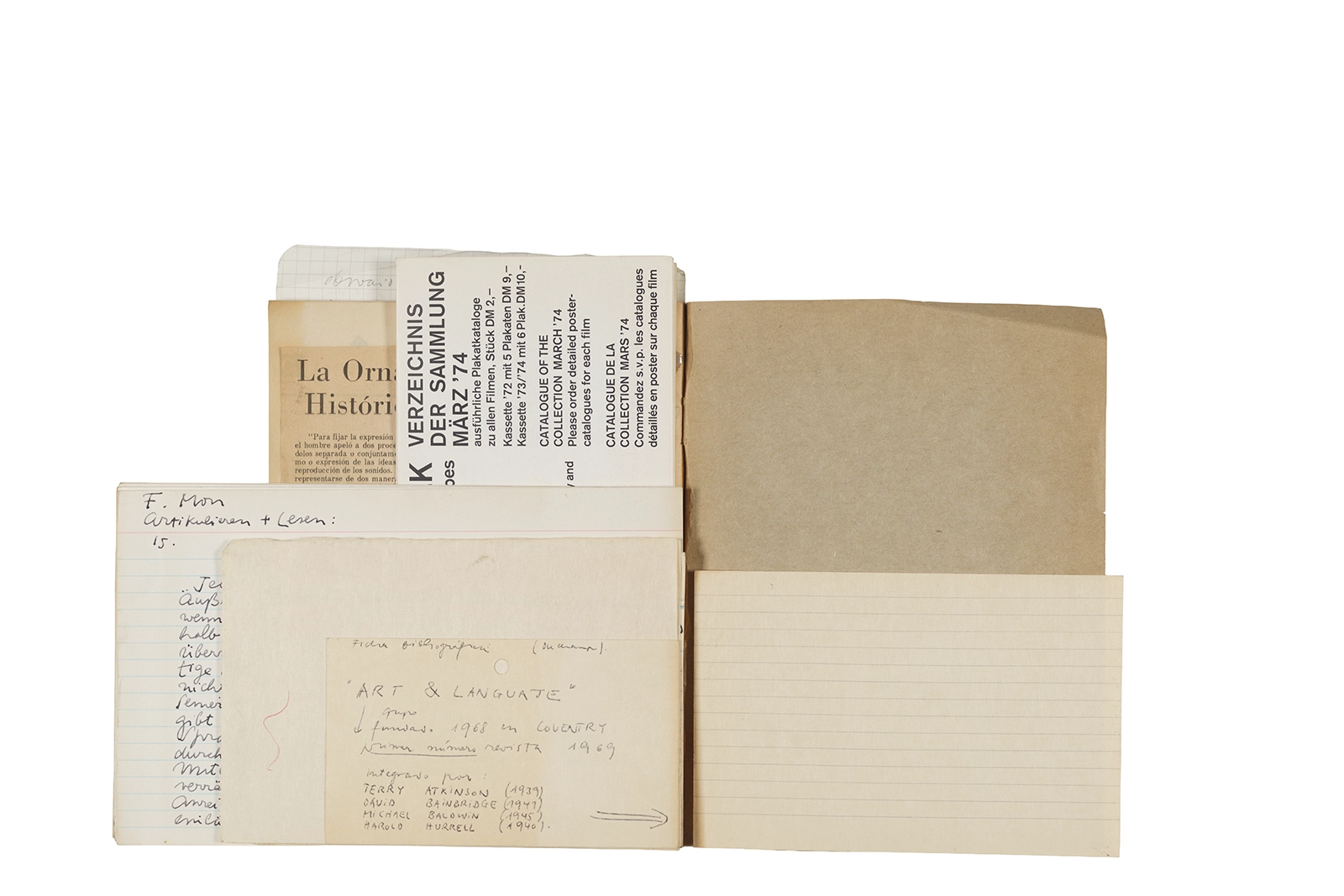 Cuaderno con tapa blanda unida al lomo con corchetes metálicos, manuscritos en tinta y grafito, fichas bibliográficas, recortes de prensa y cinta adhesiva.