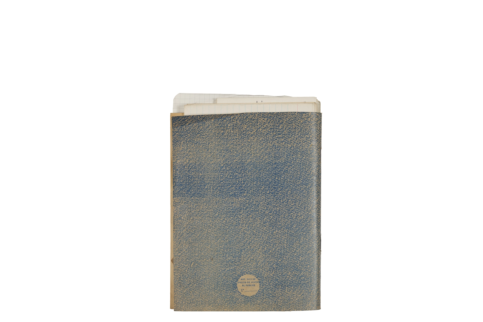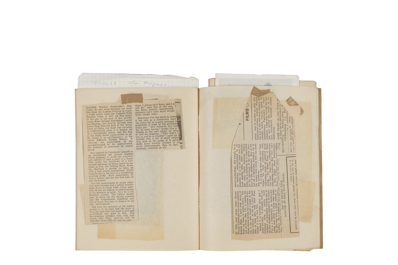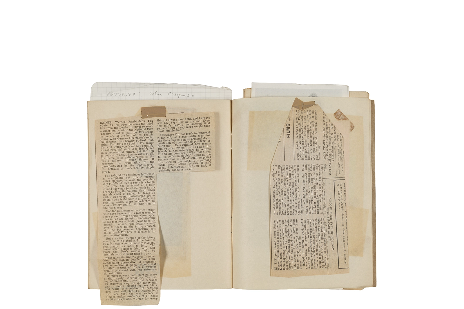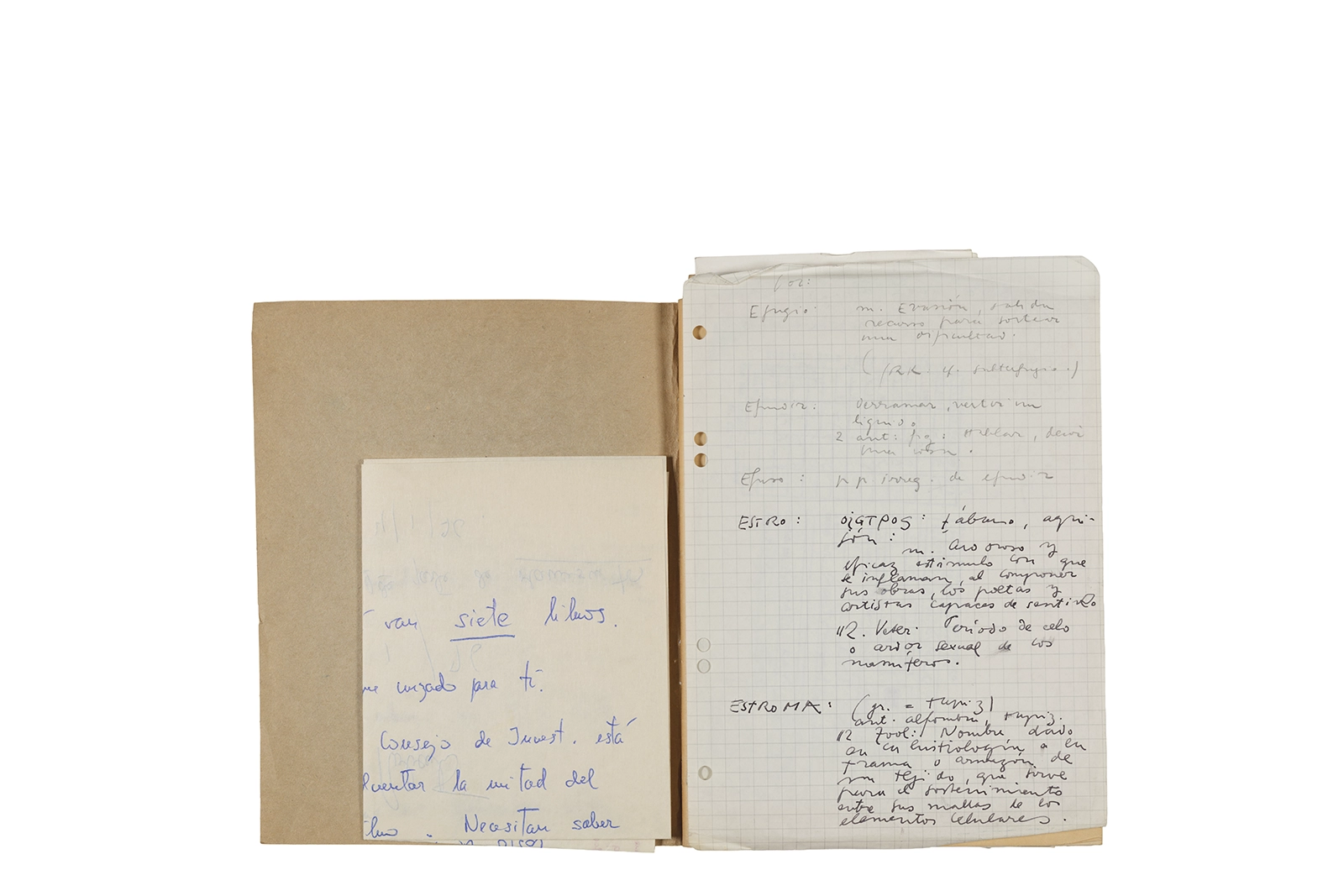 Cuaderno con tapa blanda unida al lomo con corchetes metálicos, manuscritos en tinta y grafito, fichas bibliográficas, recortes de prensa y cinta adhesiva.