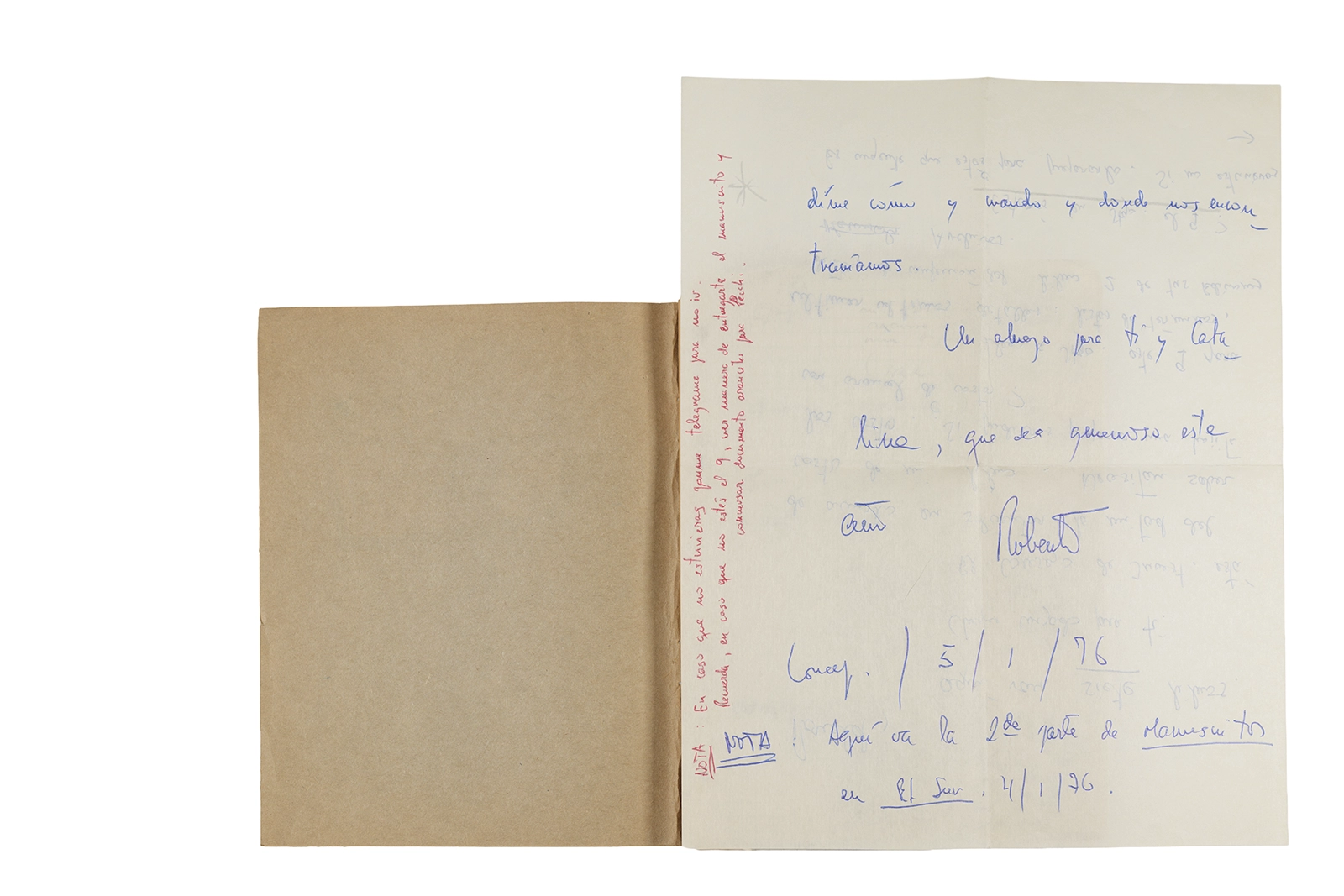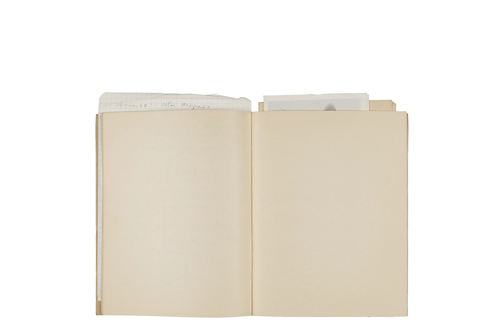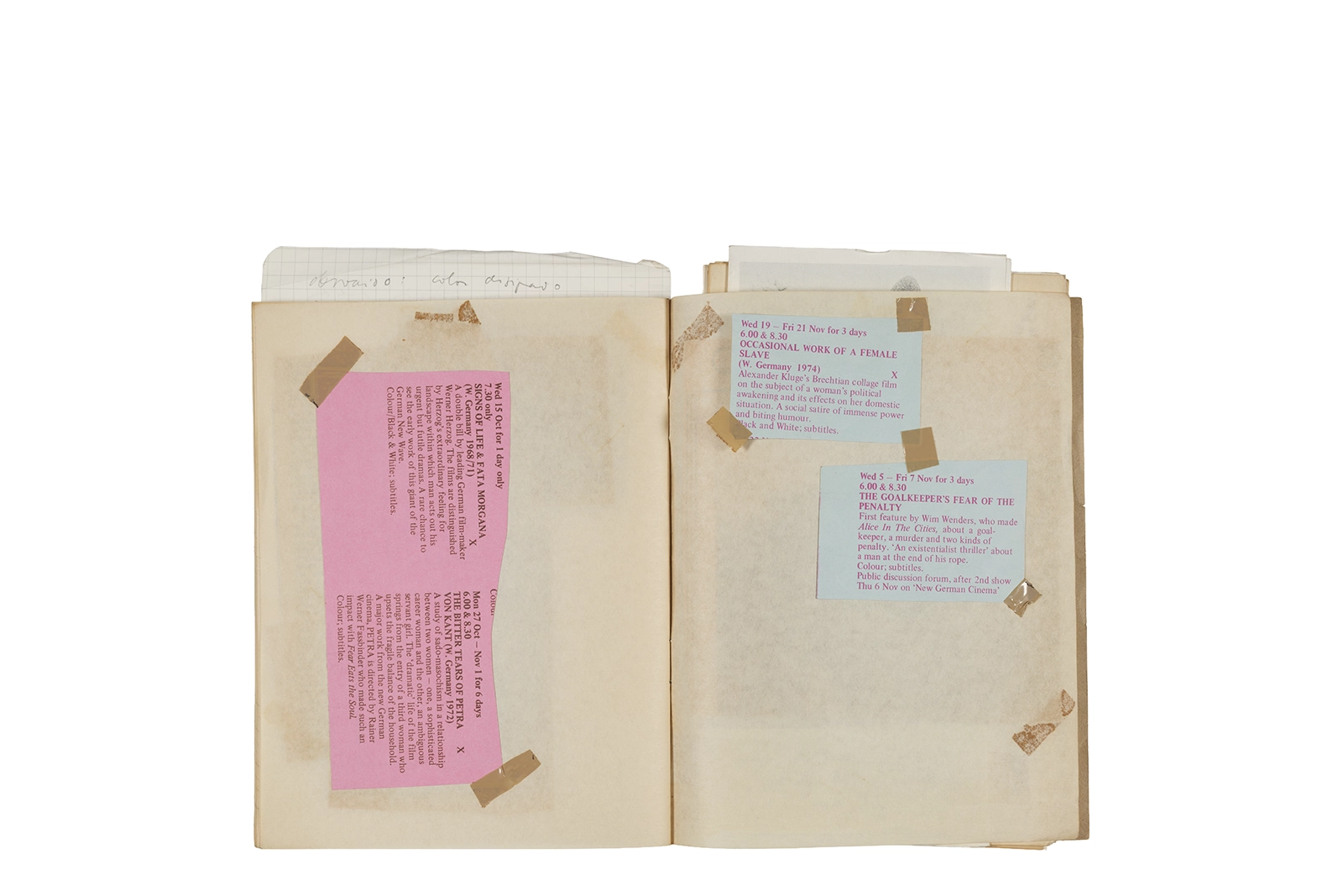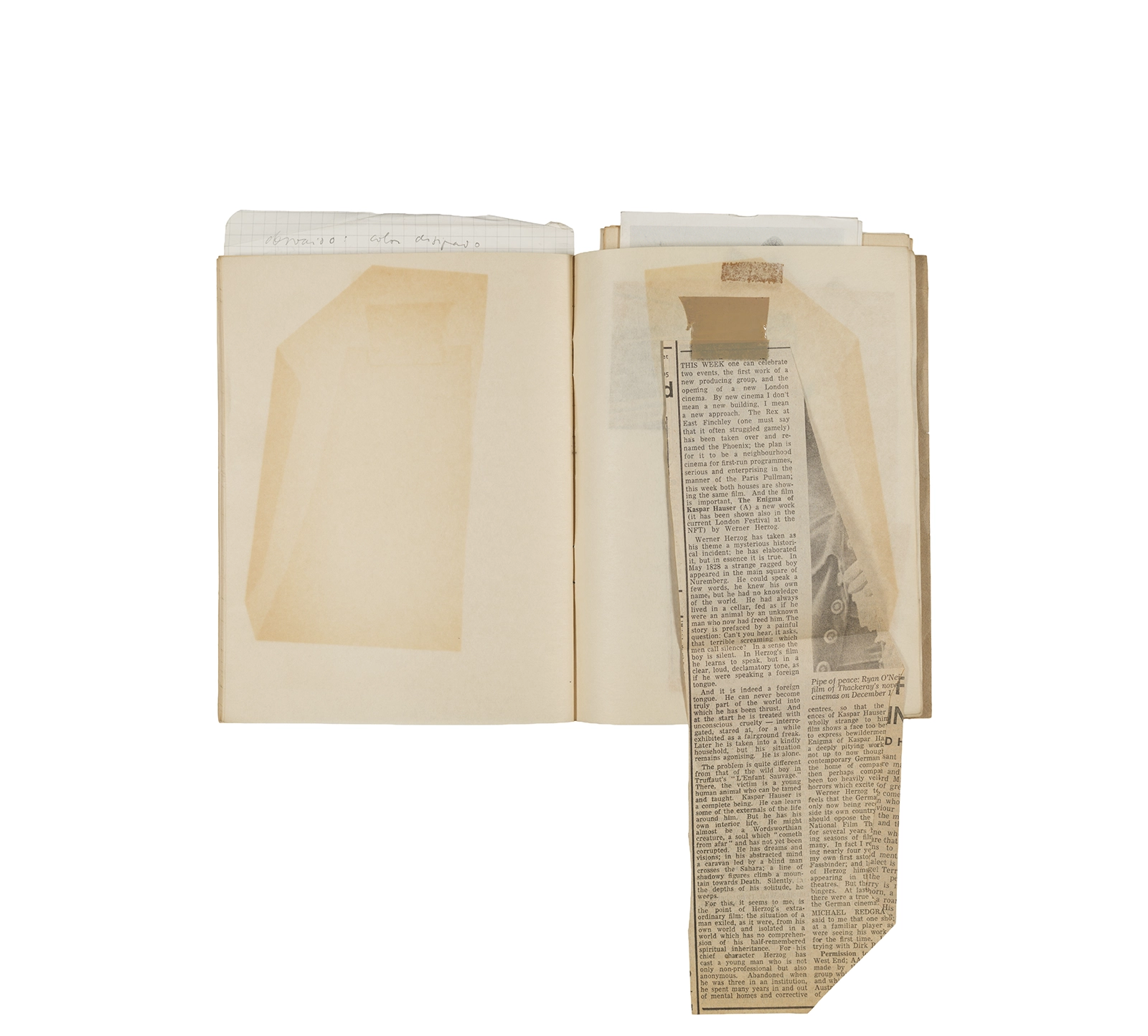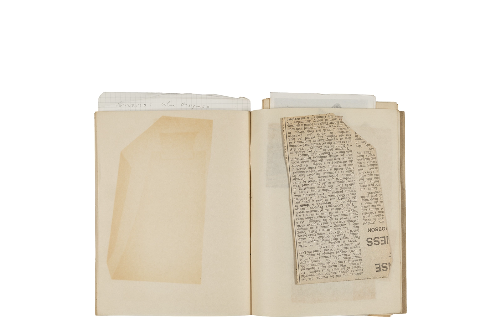 Cuaderno con tapa blanda unida al lomo con corchetes metálicos, manuscritos en tinta y grafito, fichas bibliográficas, recortes de prensa y cinta adhesiva.