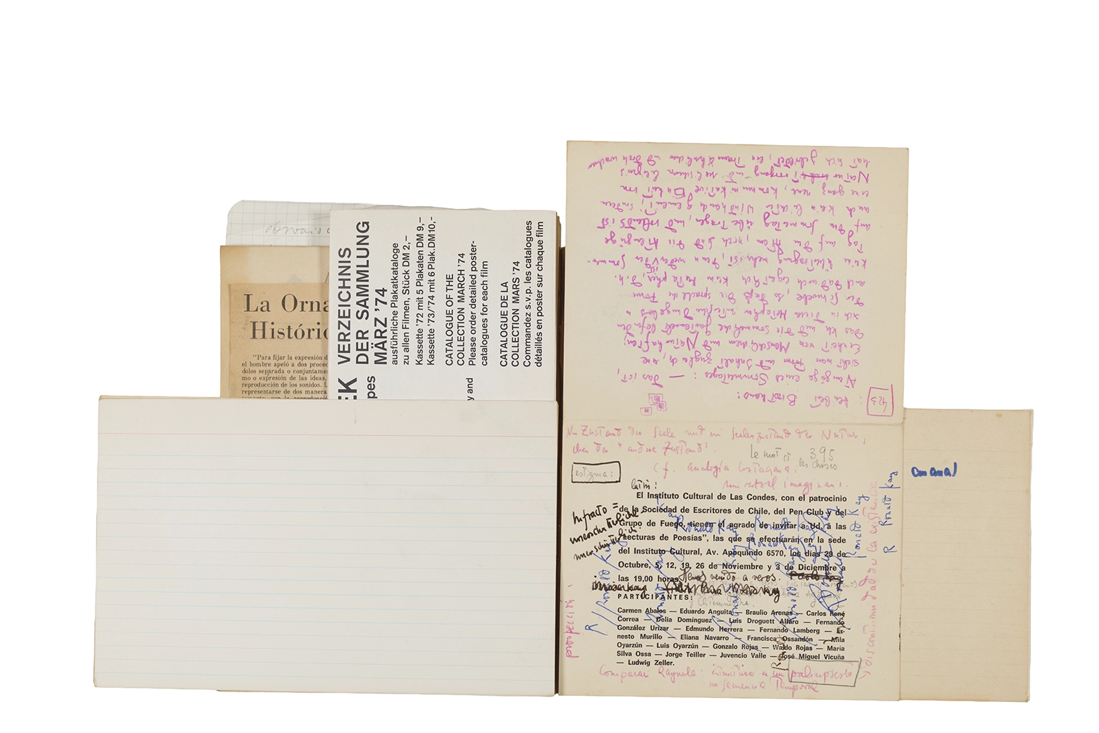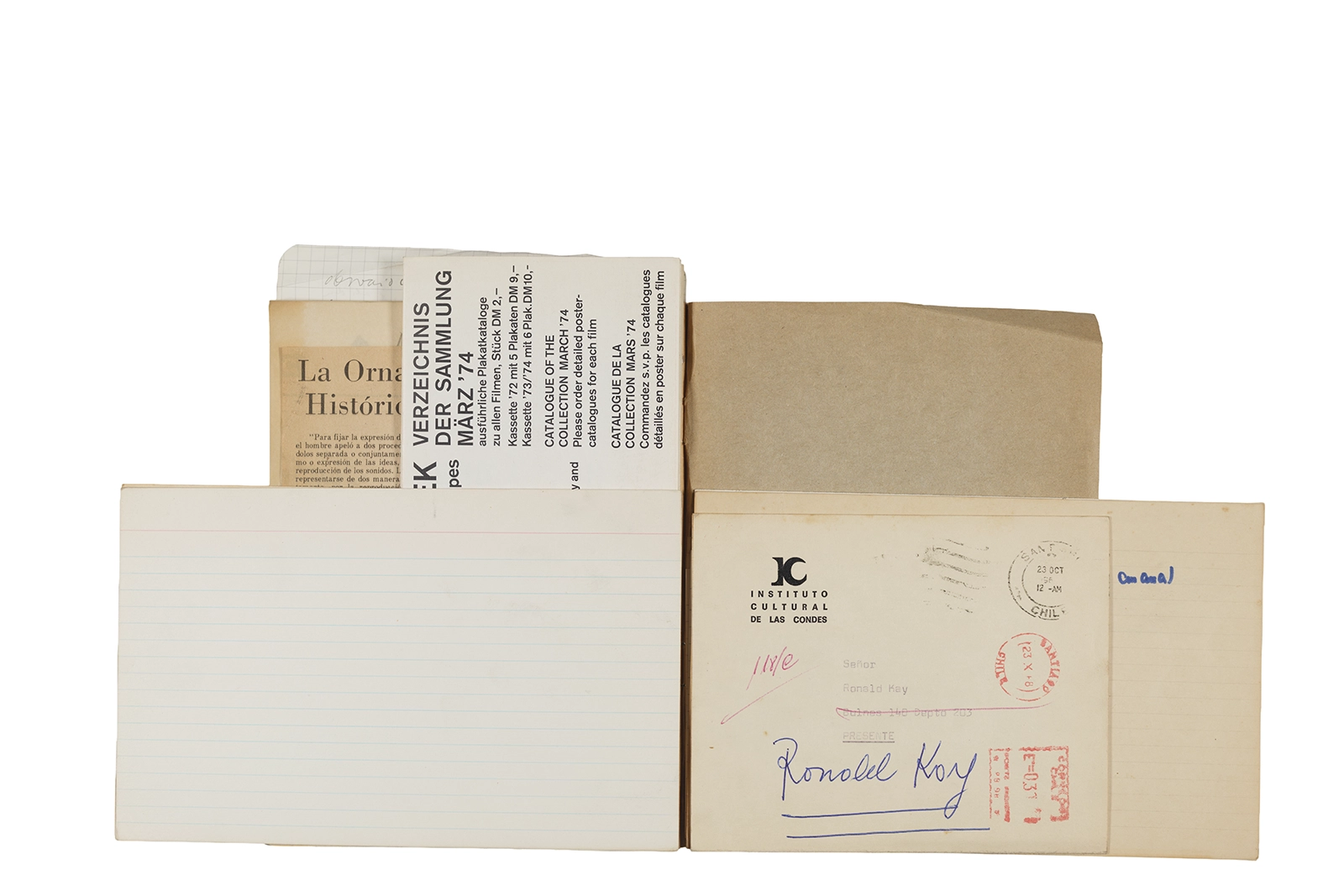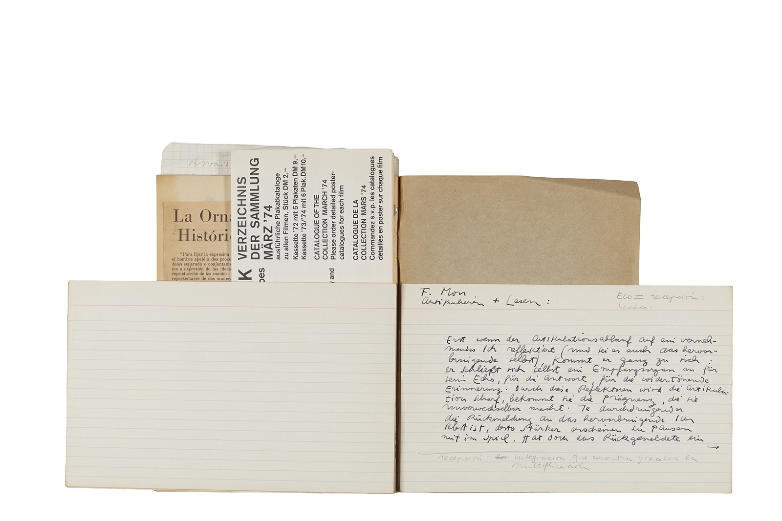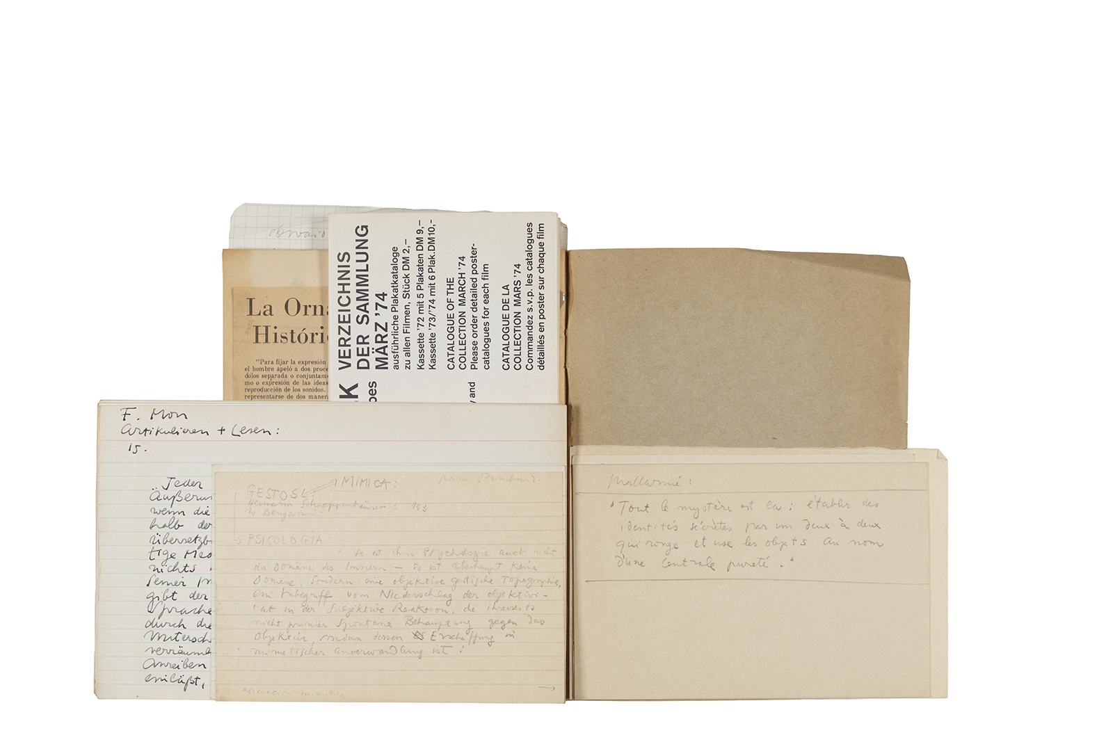 Este cuaderno contiene material vinculado al seminario “Escr:i:magen: Una sistematización de los ensayos teóricos de Stéphane Mallarmé”, dictado por Ronald Kay durante el año 1975 en el Departamento de Estudios Humanísticos de la Universidad de Chile. Asimismo, contiene apuntes sobre cine y fotografía, fichas bibliográficas y recortes de prensa, entre los que se encuentra un artículo titulado “La Ornamentación: Visión Histórica sobre Escritura”. En este cuaderno se incluye además una carta breve de Roberto Hozven a Ronald Kay, y un catálogo de marzo de 1974, de la colección de la Neur Berliner Kunstverein, en la cual se incluían obras de de Rebecca Horn, Richard Hamilton, Wolf Vostell, Joseph Beuys, Allan Kaprow y Cornelia Balcerowiak, entre otros.