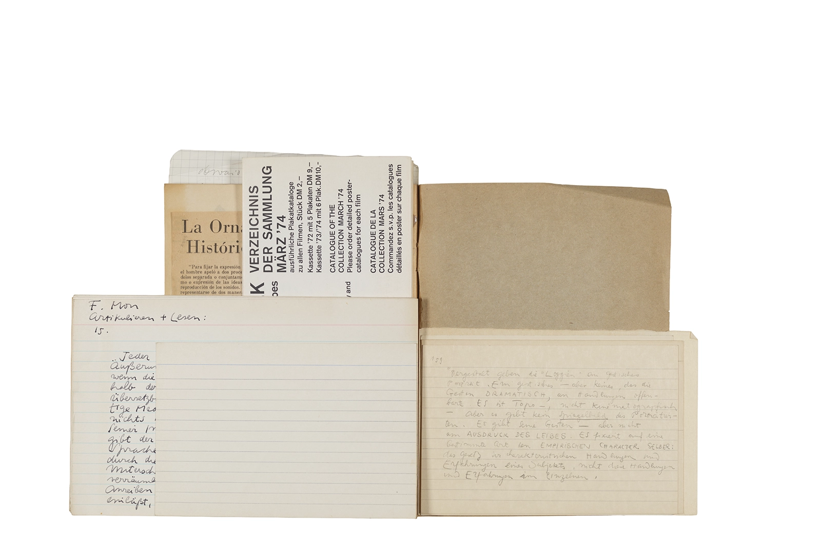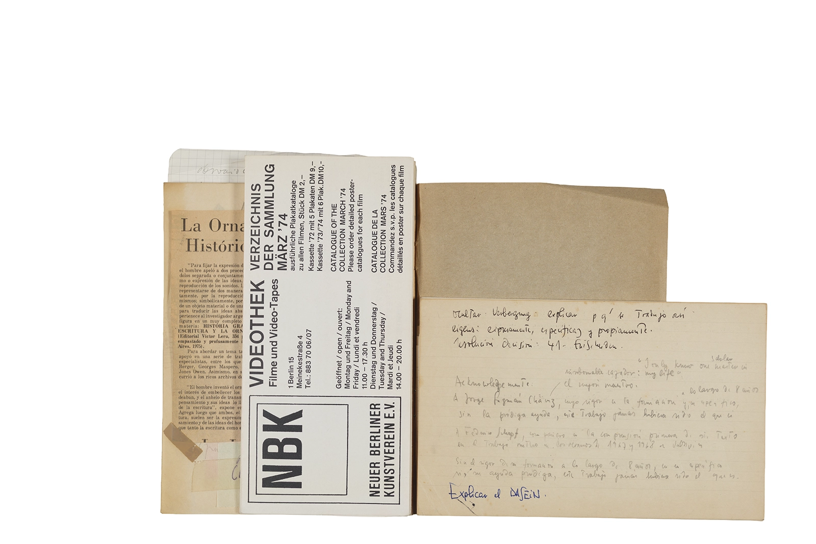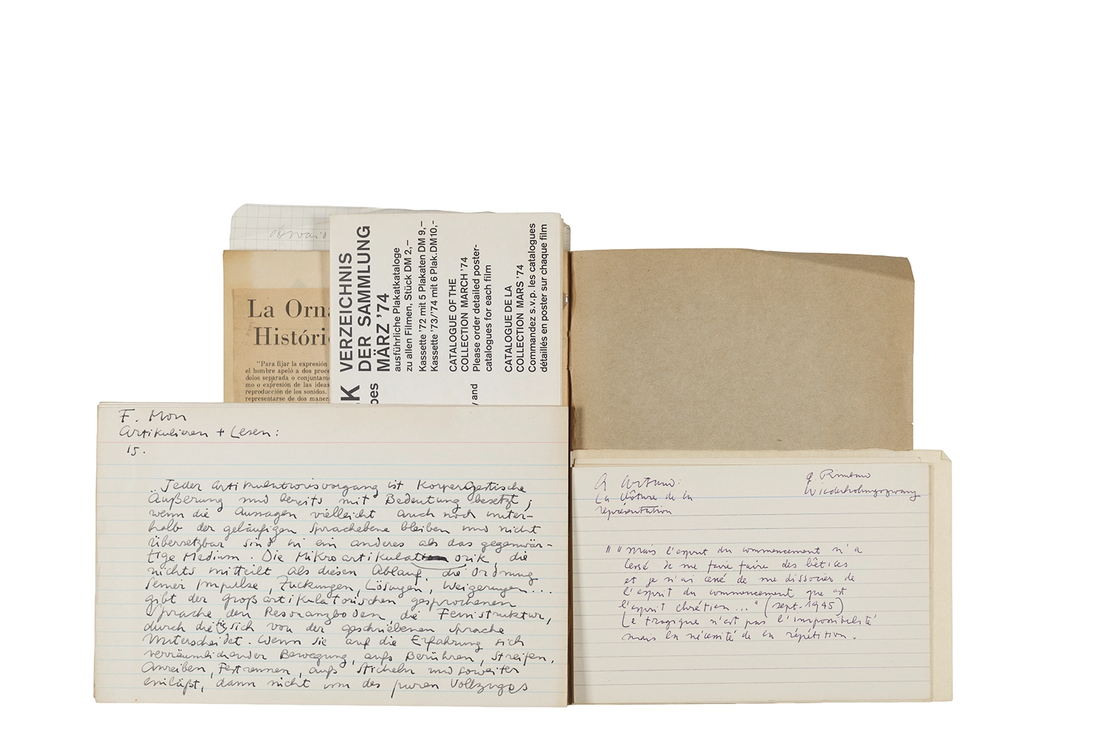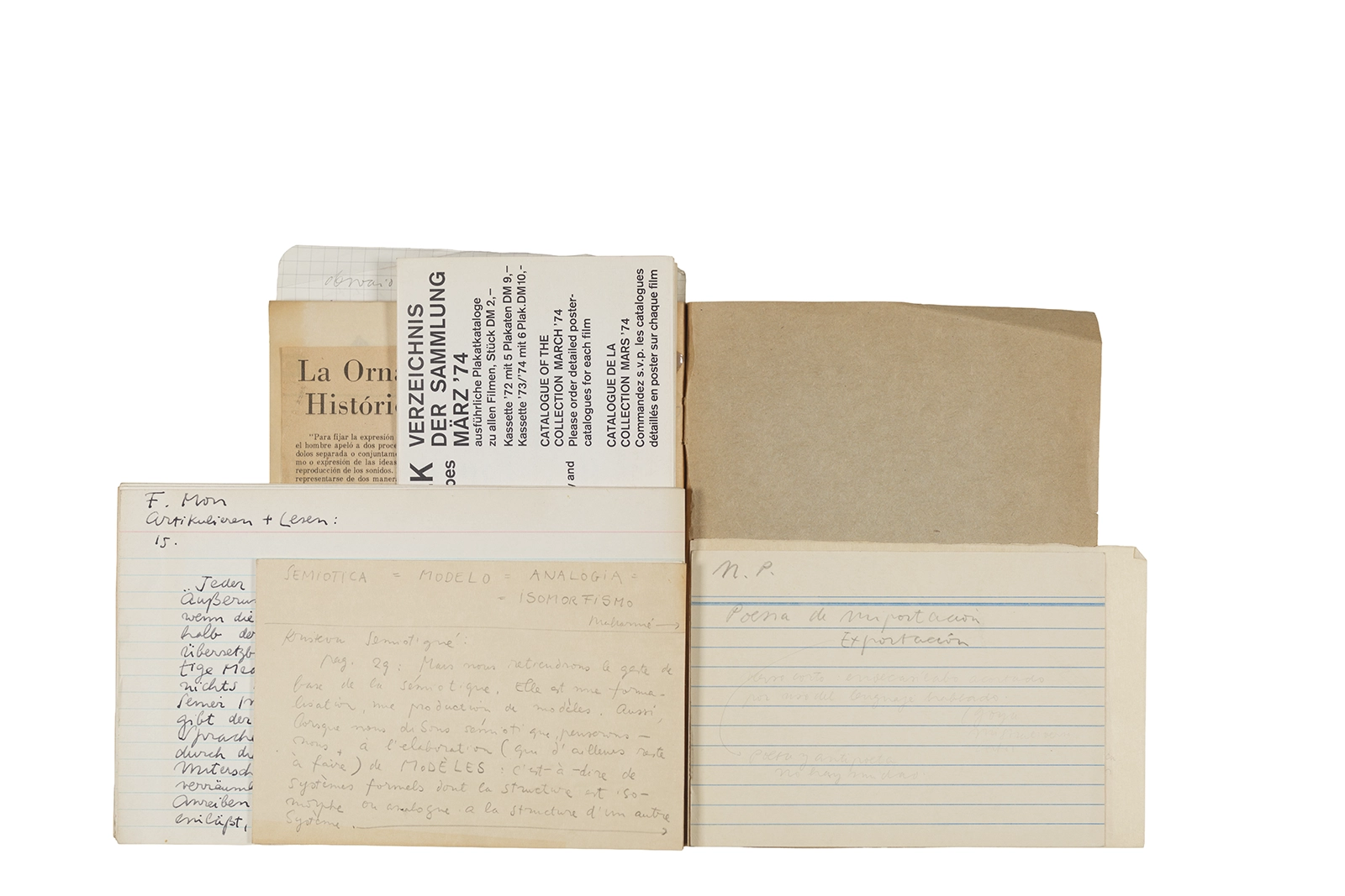Este cuaderno contiene material vinculado al seminario “Escr:i:magen: Una sistematización de los ensayos teóricos de Stéphane Mallarmé”, dictado por Ronald Kay durante el año 1975 en el Departamento de Estudios Humanísticos de la Universidad de Chile. Asimismo, contiene apuntes sobre cine y fotografía, fichas bibliográficas y recortes de prensa, entre los que se encuentra un artículo titulado “La Ornamentación: Visión Histórica sobre Escritura”. En este cuaderno se incluye además una carta breve de Roberto Hozven a Ronald Kay, y un catálogo de marzo de 1974, de la colección de la Neur Berliner Kunstverein, en la cual se incluían obras de de Rebecca Horn, Richard Hamilton, Wolf Vostell, Joseph Beuys, Allan Kaprow y Cornelia Balcerowiak, entre otros.