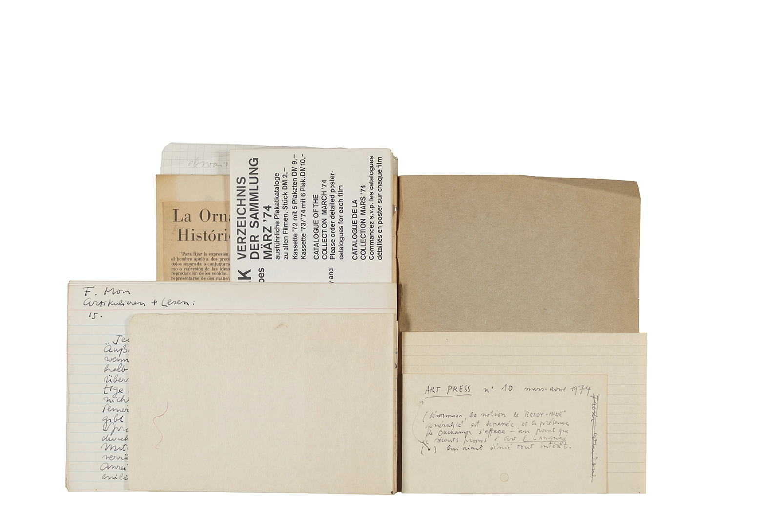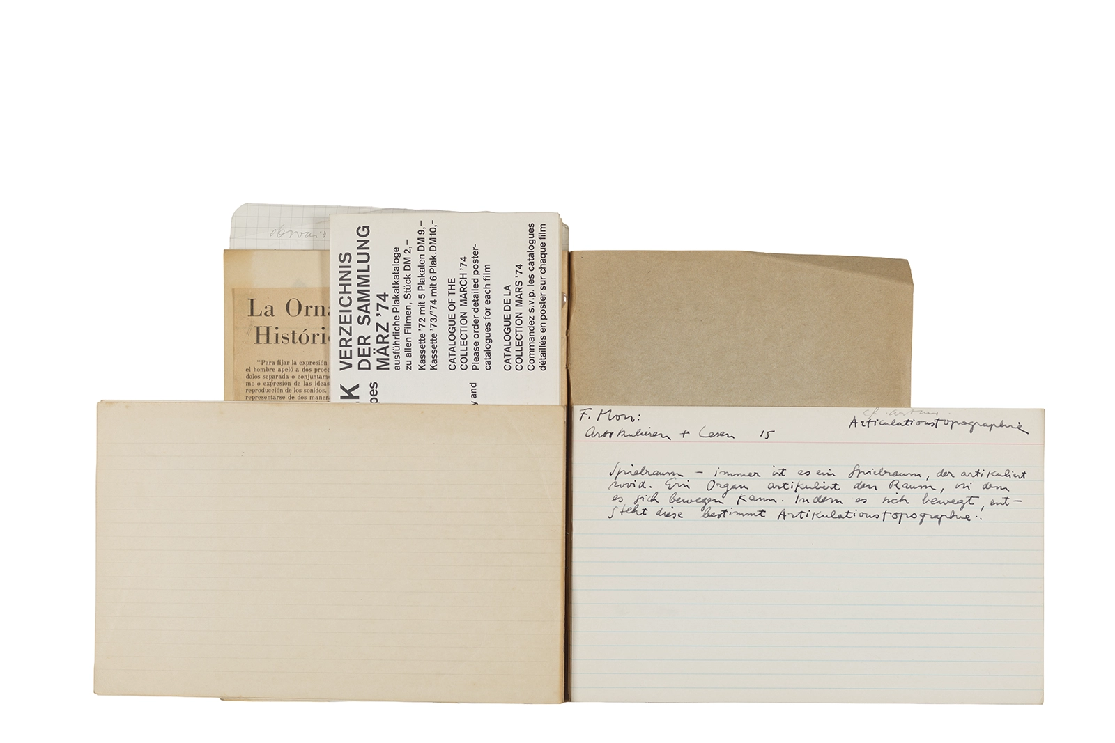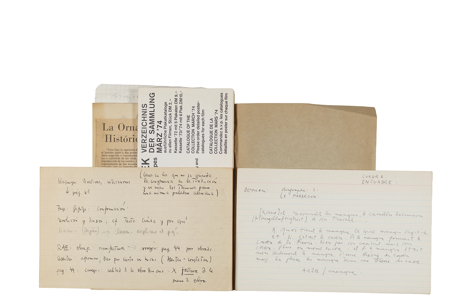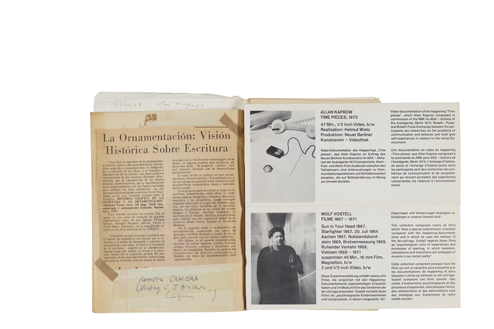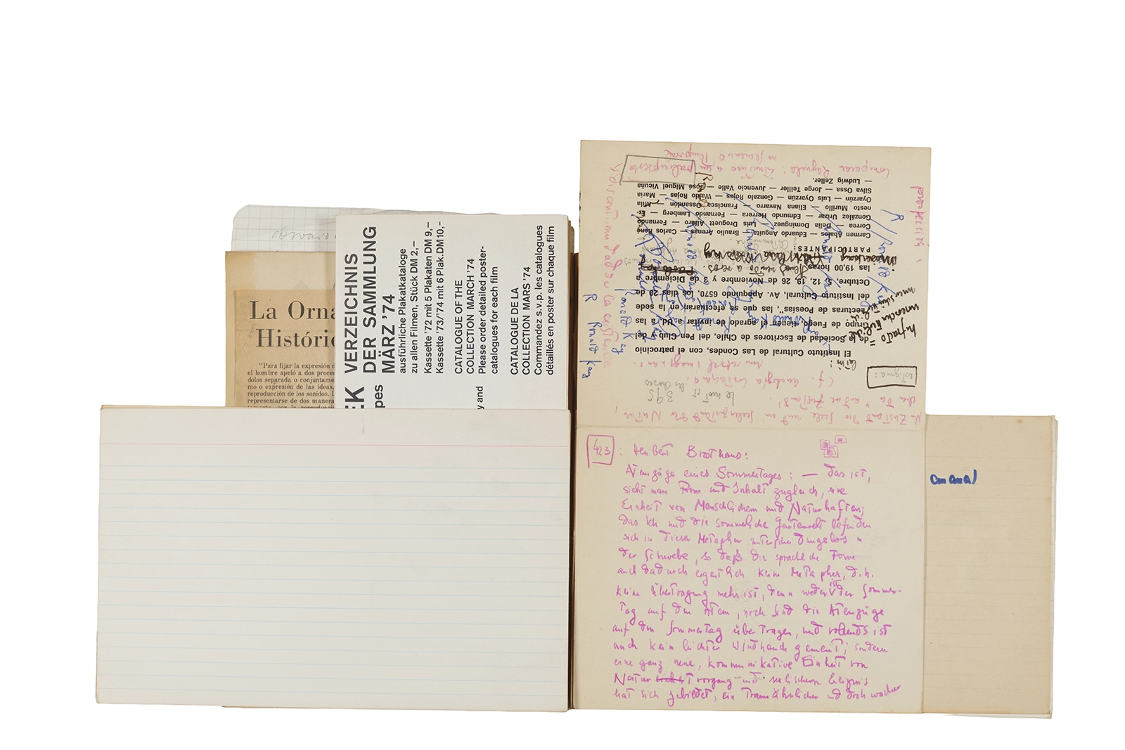 Este cuaderno contiene material vinculado al seminario “Escr:i:magen: Una sistematización de los ensayos teóricos de Stéphane Mallarmé”, dictado por Ronald Kay durante el año 1975 en el Departamento de Estudios Humanísticos de la Universidad de Chile. Asimismo, contiene apuntes sobre cine y fotografía, fichas bibliográficas y recortes de prensa, entre los que se encuentra un artículo titulado “La Ornamentación: Visión Histórica sobre Escritura”. En este cuaderno se incluye además una carta breve de Roberto Hozven a Ronald Kay, y un catálogo de marzo de 1974, de la colección de la Neur Berliner Kunstverein, en la cual se incluían obras de de Rebecca Horn, Richard Hamilton, Wolf Vostell, Joseph Beuys, Allan Kaprow y Cornelia Balcerowiak, entre otros.