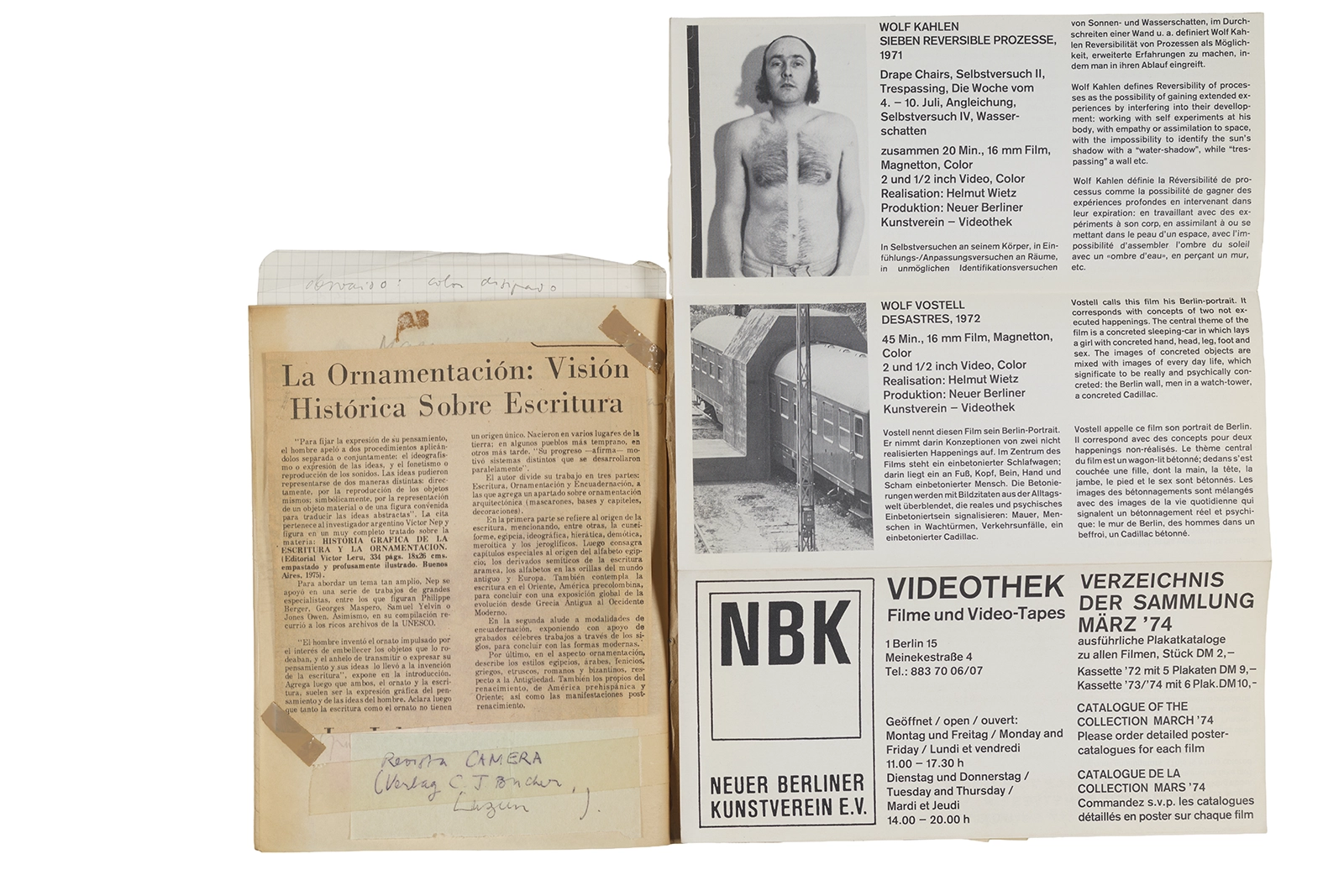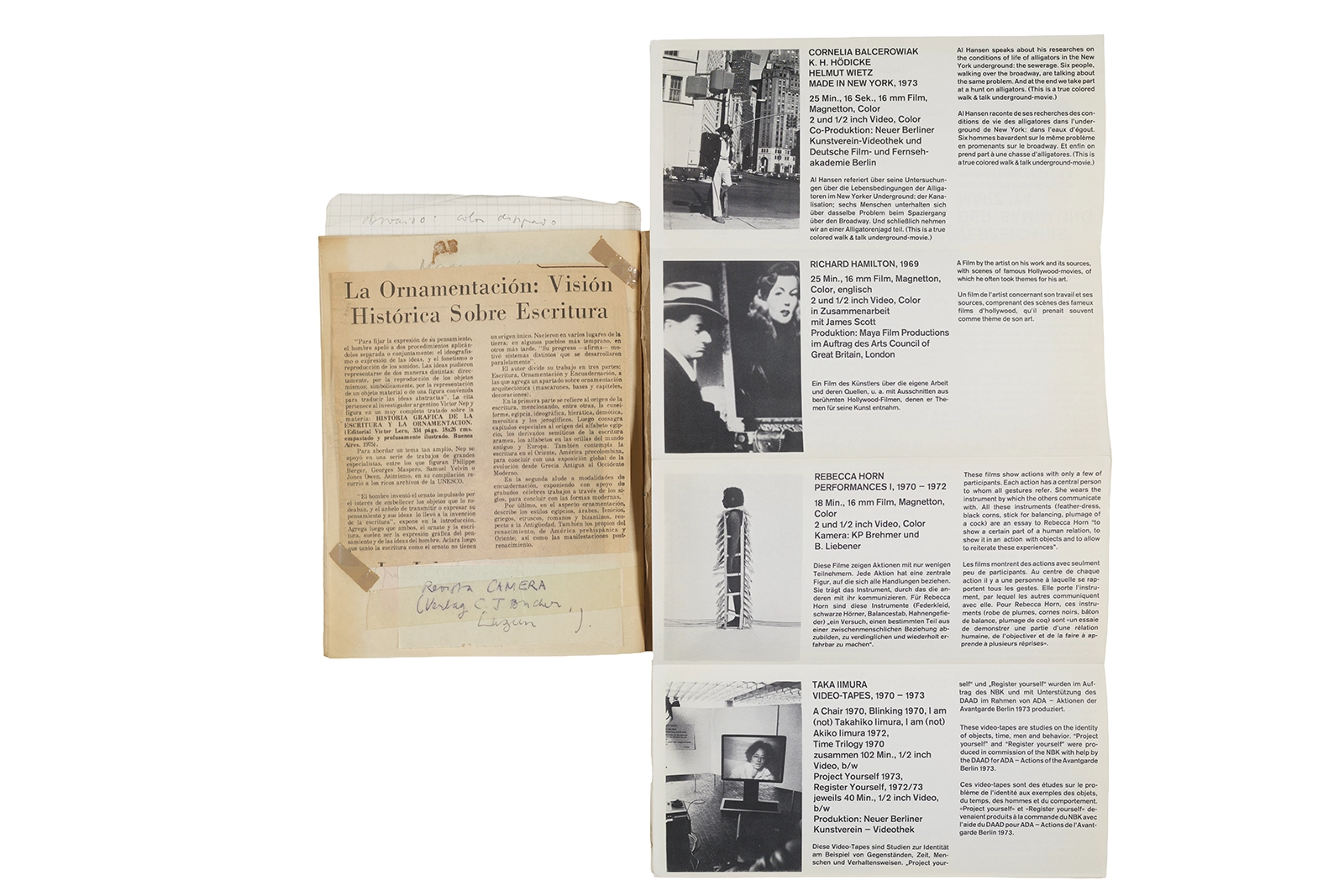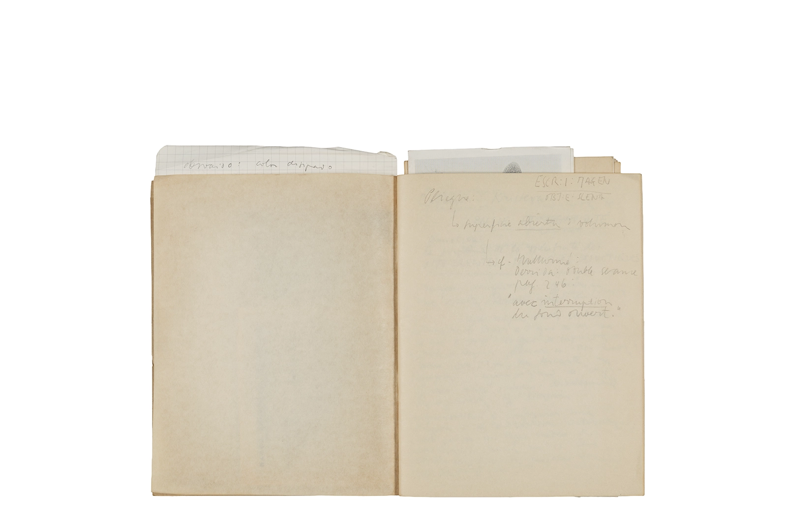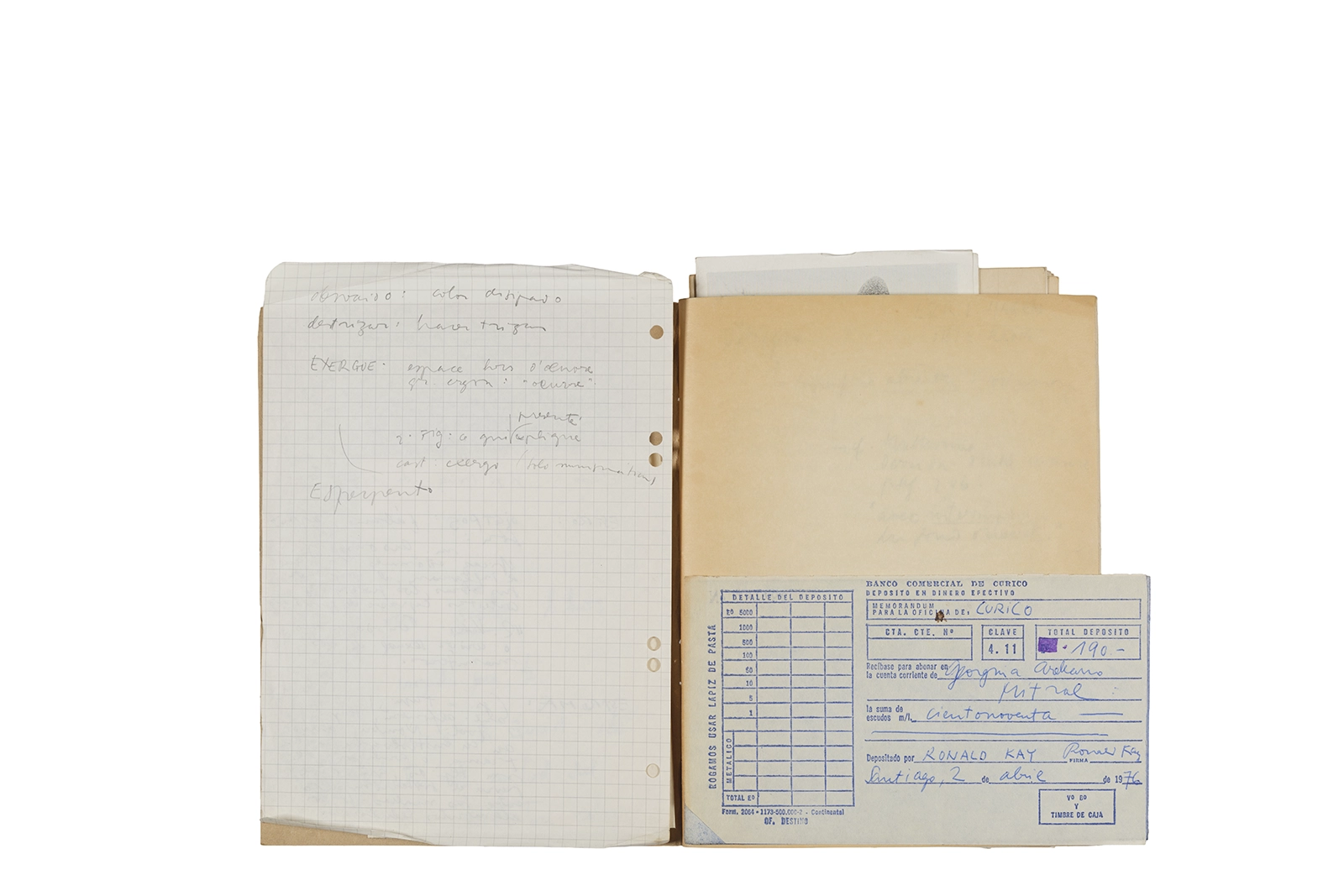 Este cuaderno contiene material vinculado al seminario “Escr:i:magen: Una sistematización de los ensayos teóricos de Stéphane Mallarmé”, dictado por Ronald Kay durante el año 1975 en el Departamento de Estudios Humanísticos de la Universidad de Chile. Asimismo, contiene apuntes sobre cine y fotografía, fichas bibliográficas y recortes de prensa, entre los que se encuentra un artículo titulado “La Ornamentación: Visión Histórica sobre Escritura”. En este cuaderno se incluye además una carta breve de Roberto Hozven a Ronald Kay, y un catálogo de marzo de 1974, de la colección de la Neur Berliner Kunstverein, en la cual se incluían obras de de Rebecca Horn, Richard Hamilton, Wolf Vostell, Joseph Beuys, Allan Kaprow y Cornelia Balcerowiak, entre otros.