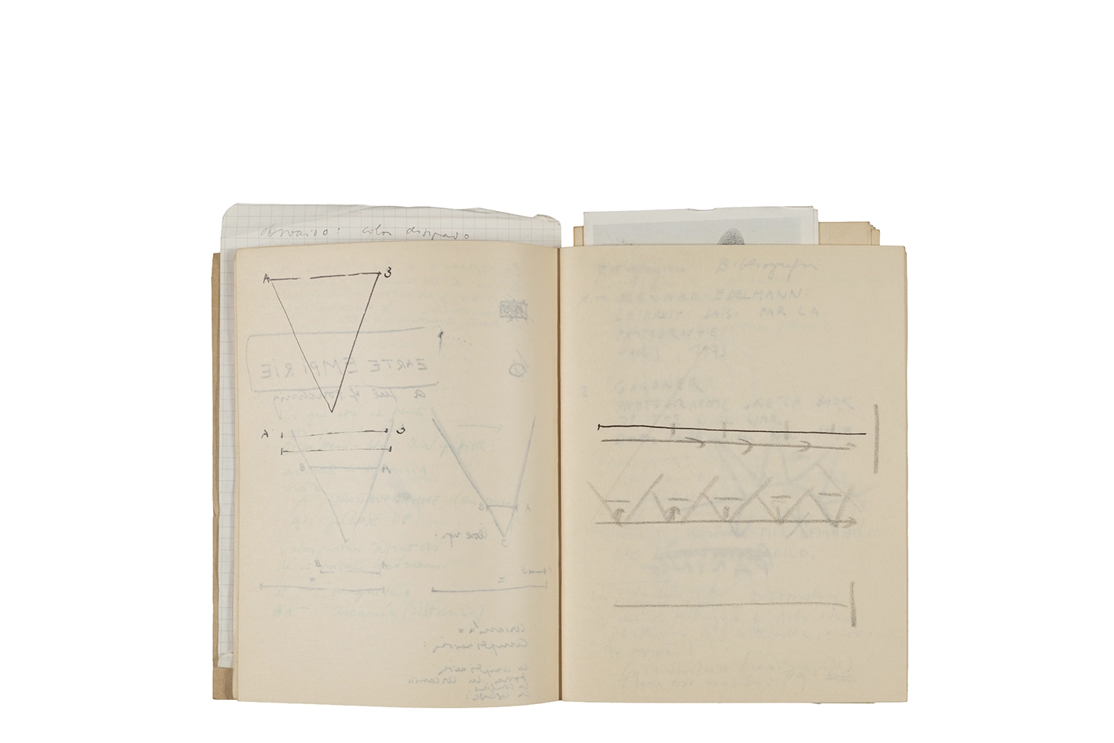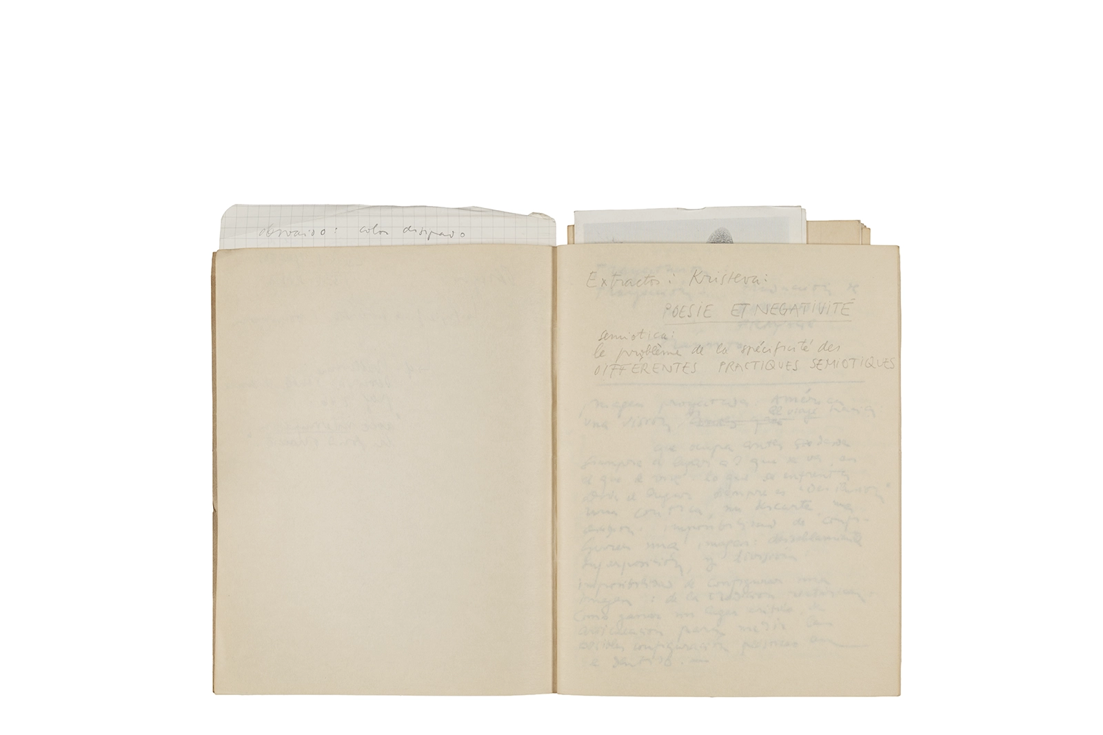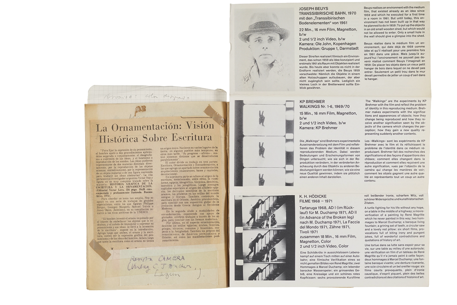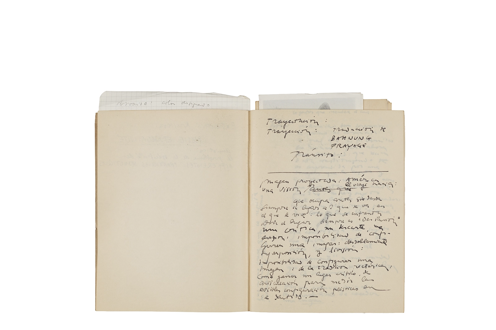 Este cuaderno contiene material vinculado al seminario “Escr:i:magen: Una sistematización de los ensayos teóricos de Stéphane Mallarmé”, dictado por Ronald Kay durante el año 1975 en el Departamento de Estudios Humanísticos de la Universidad de Chile. Asimismo, contiene apuntes sobre cine y fotografía, fichas bibliográficas y recortes de prensa, entre los que se encuentra un artículo titulado “La Ornamentación: Visión Histórica sobre Escritura”. En este cuaderno se incluye además una carta breve de Roberto Hozven a Ronald Kay, y un catálogo de marzo de 1974, de la colección de la Neur Berliner Kunstverein, en la cual se incluían obras de de Rebecca Horn, Richard Hamilton, Wolf Vostell, Joseph Beuys, Allan Kaprow y Cornelia Balcerowiak, entre otros.