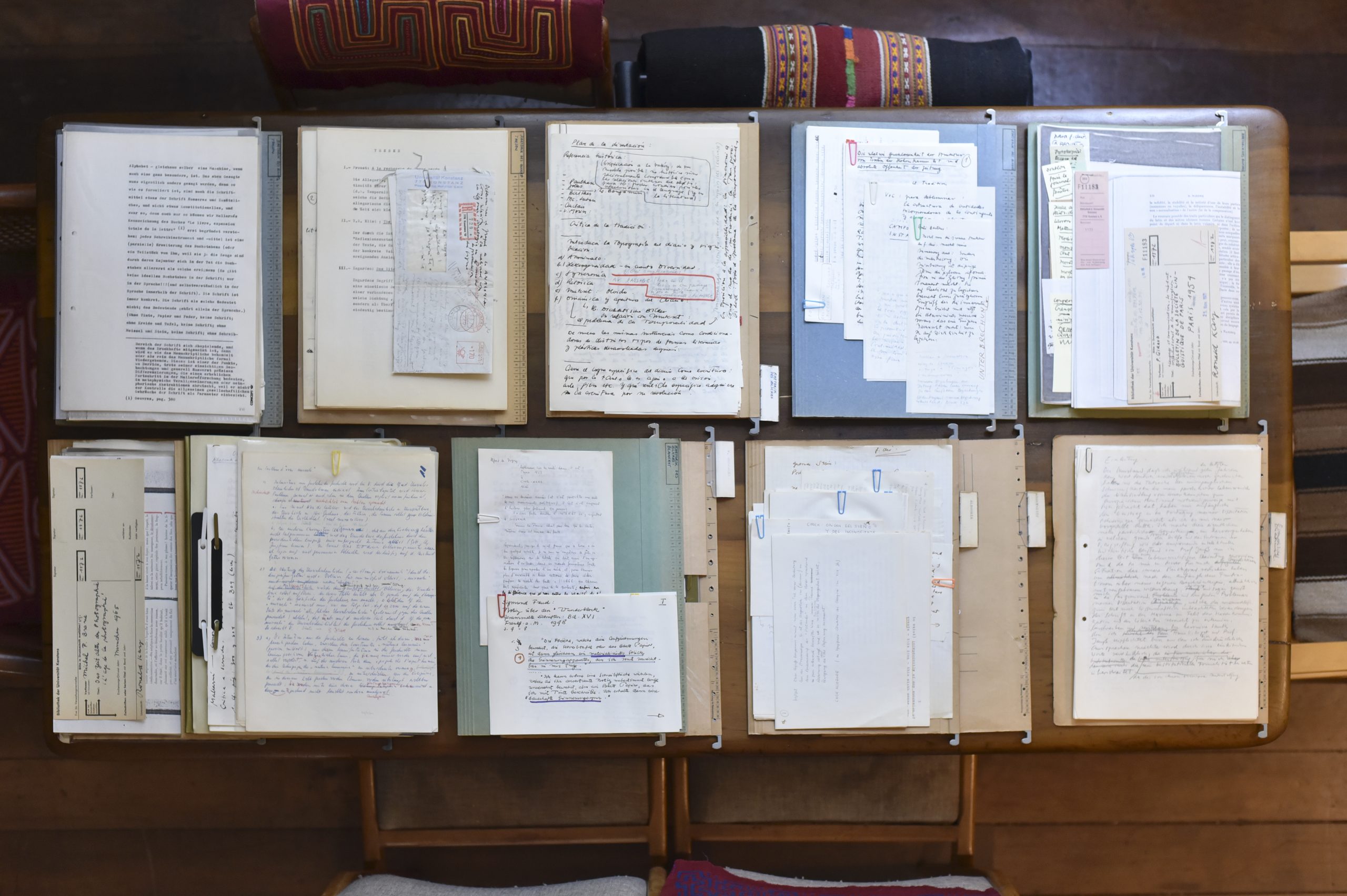 Este expediente reúne 45 unidades documentales vinculadas a la tesis doctoral “Die Rhetorik des Blickes” (“La retórica de la mirada”, en español), desarrollada por Ronald Kay entre 1969 y 1972, mientras fue estudiante de postgrado en la Universidad de Constanza. Dirigida por el filólogo alemán Hans-Robert Jauss, esta tesis se centra en la estética de la recepción a través del análisis de la diagramación y la diferencia tipográfica de la prensa escrita —en particular de los fait divers— del siglo XIX. Además de copias de la tesis terminada, este expediente contiene diversos materiales utilizados durante el proceso de investigación. Entre ellos, destacan fotocopias, traducciones y estudios sobre “Un coup de dés jamais n’abolira le hasard” de Stéphane Mallarmé y apuntes sobre las investigaciones de Marshall McLuhan, así como referencias a Walter Benjamin, Claude Lévi-Strauss y Jacques Derrida.