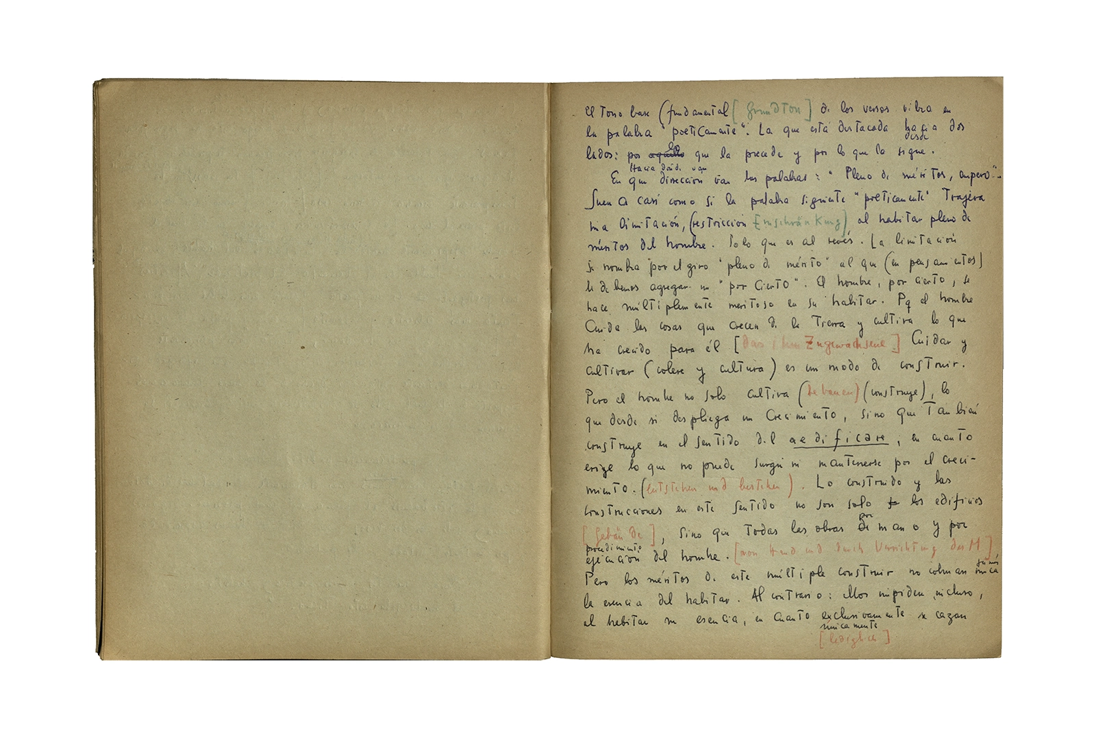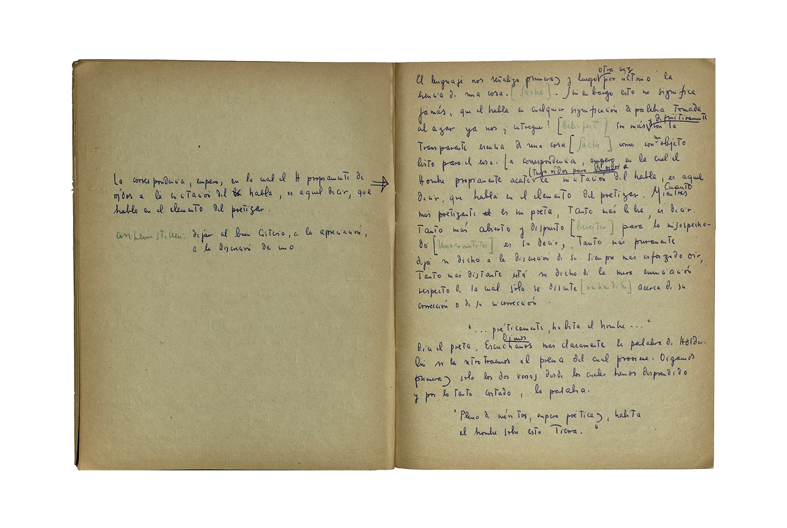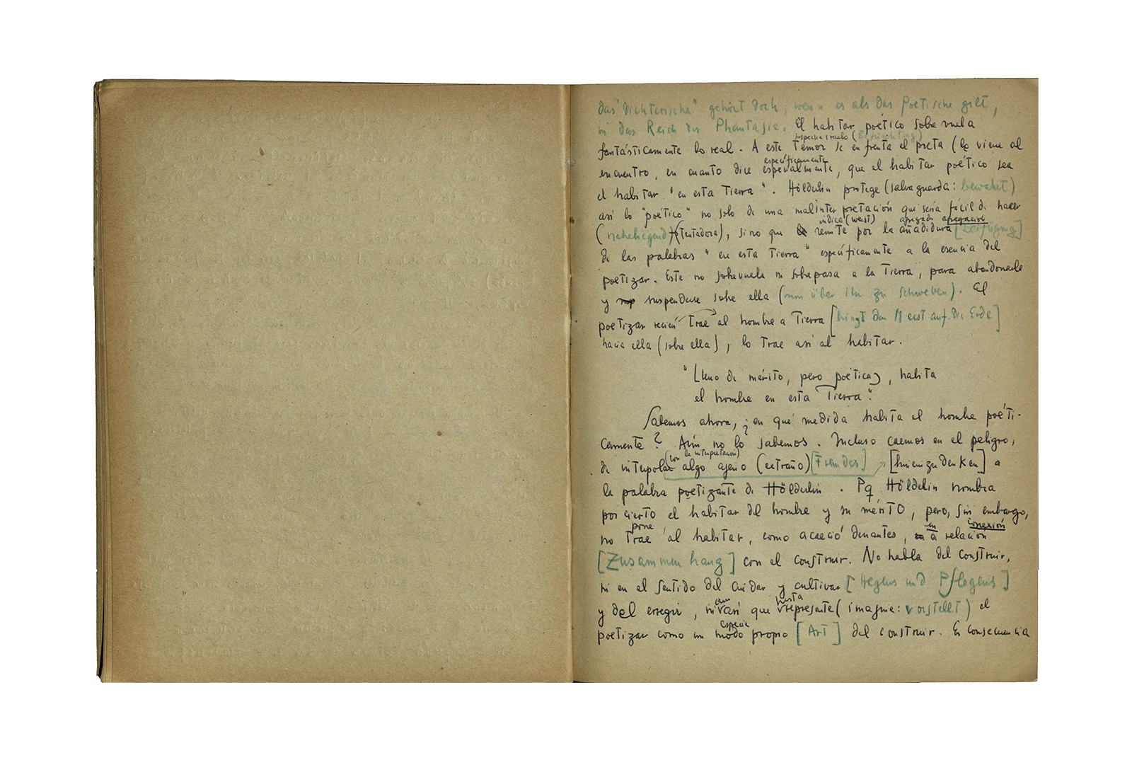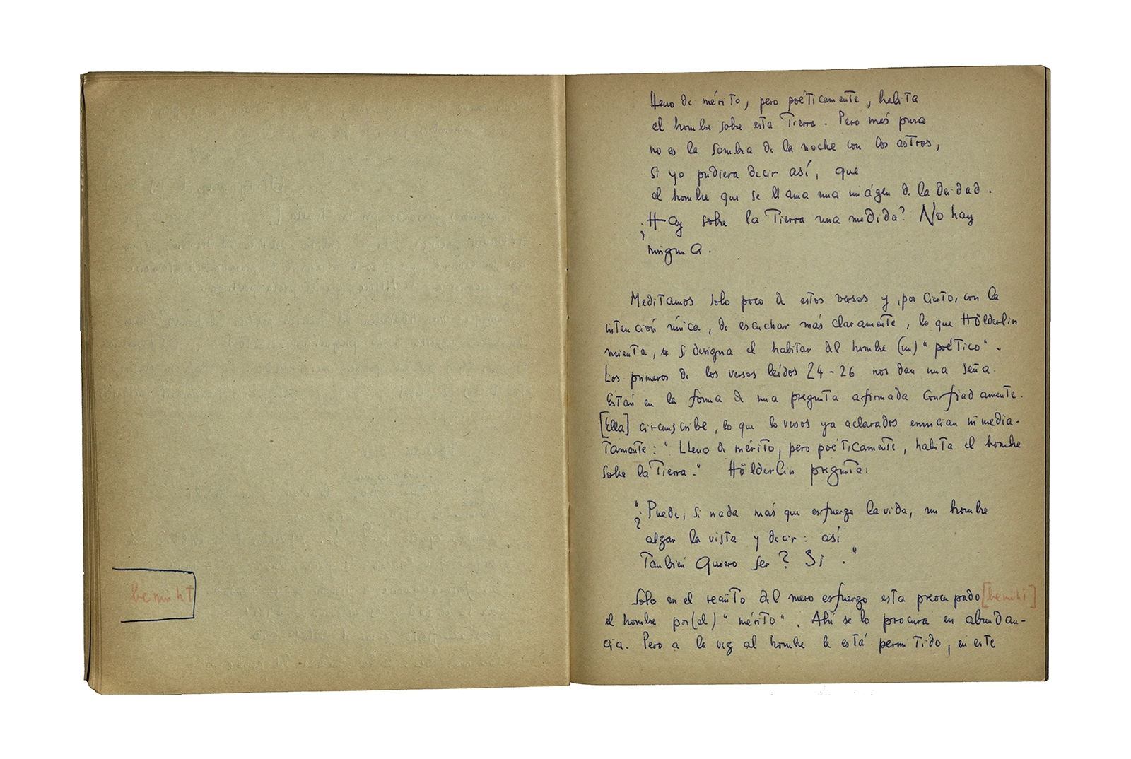 Cuaderno que contiene la traducción de la conferencia “Dichterisih wohnet der mensch” obtenida del libro “Vorträge und Aufsätze”, publicado por Neske, Pfullingen, (1959) de Martin Heidegger. El cuaderno además incluye dos pequeñas hojas de calendario de 1967 con notas de la traducción del texto.