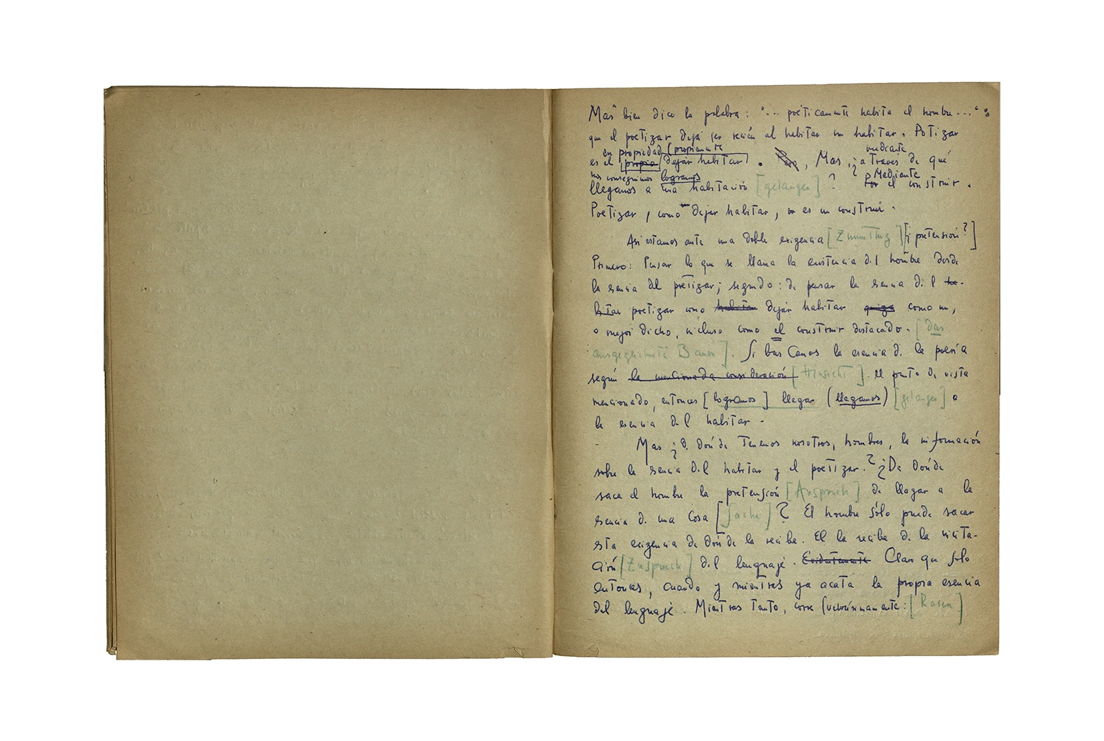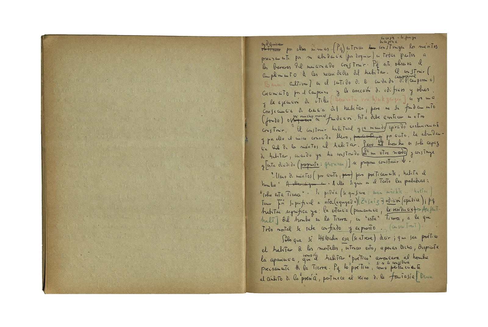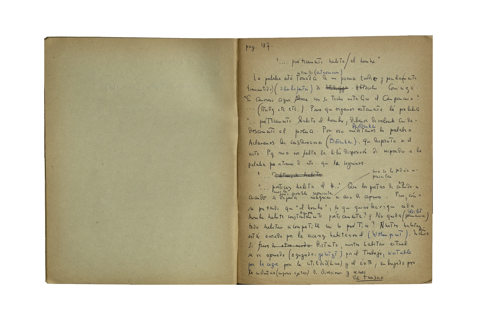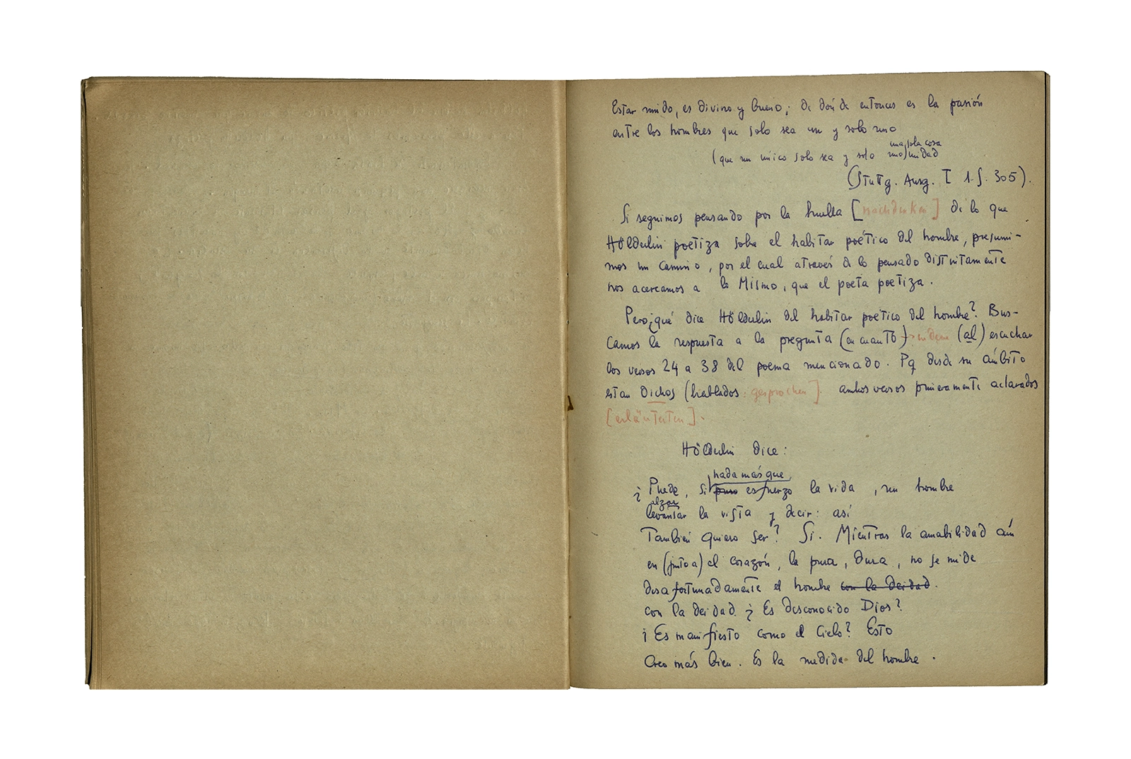 Cuaderno que contiene la traducción de la conferencia “Dichterisih wohnet der mensch” obtenida del libro “Vorträge und Aufsätze”, publicado por Neske, Pfullingen, (1959) de Martin Heidegger. El cuaderno además incluye dos pequeñas hojas de calendario de 1967 con notas de la traducción del texto.