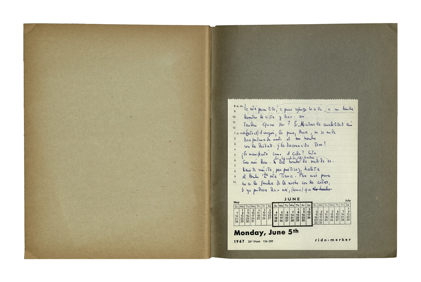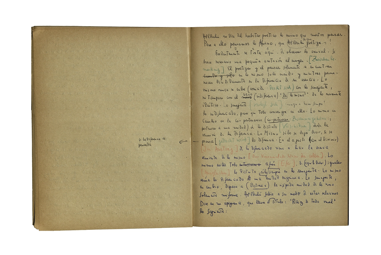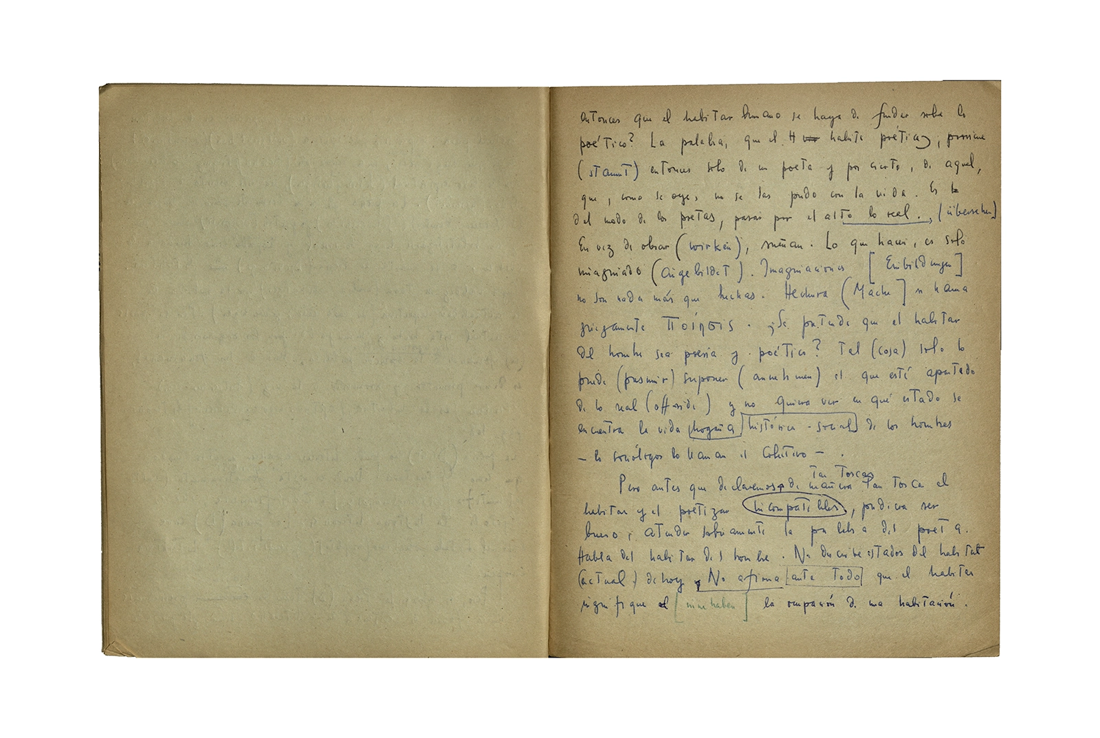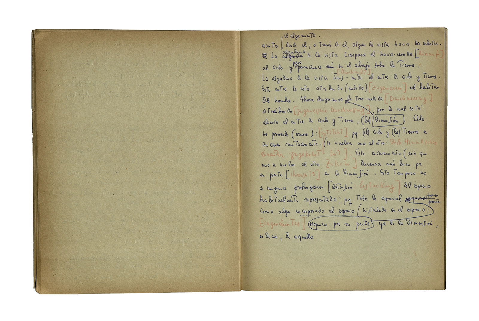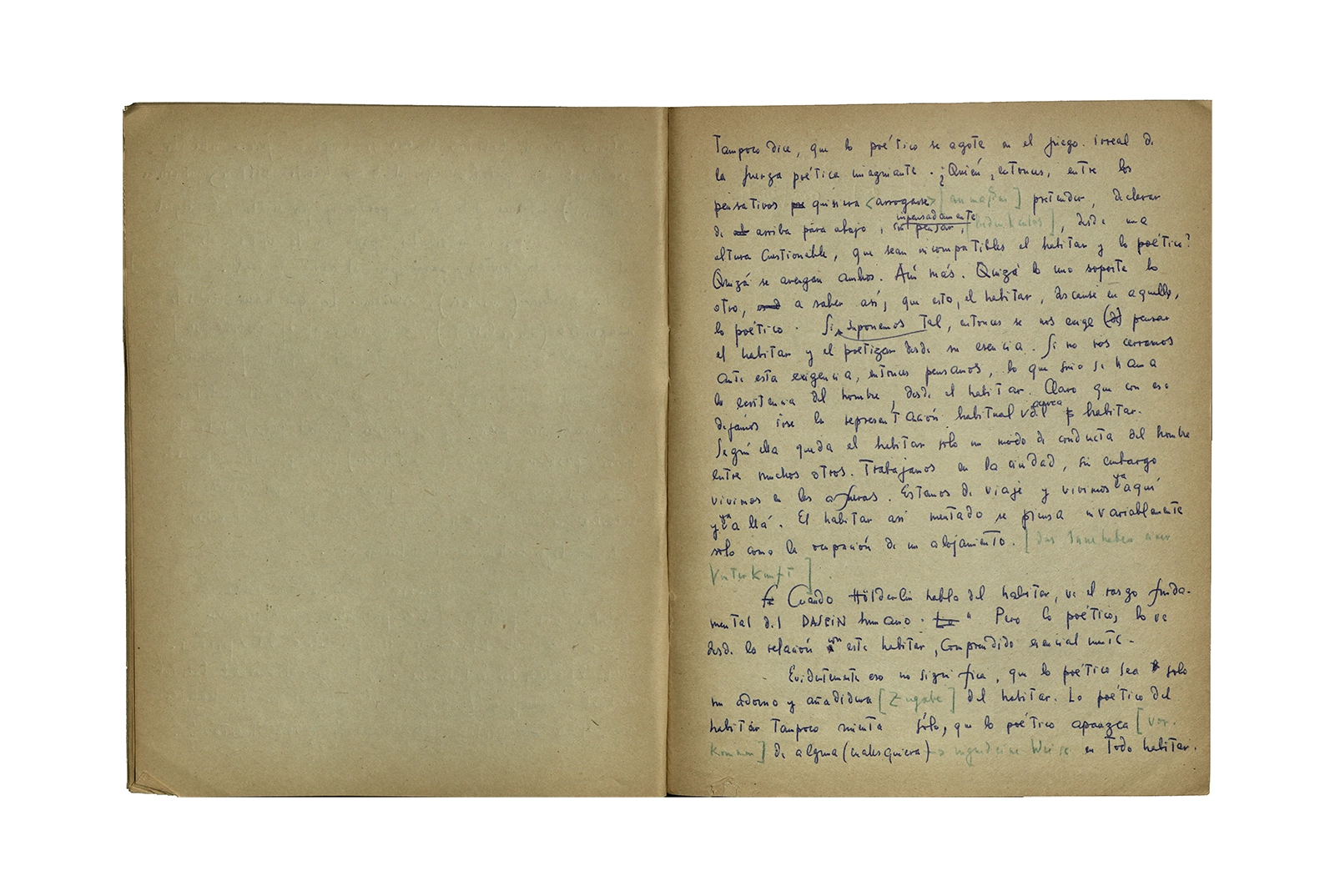 Cuaderno que contiene la traducción de la conferencia “Dichterisih wohnet der mensch” obtenida del libro “Vorträge und Aufsätze”, publicado por Neske, Pfullingen, (1959) de Martin Heidegger. El cuaderno además incluye dos pequeñas hojas de calendario de 1967 con notas de la traducción del texto.