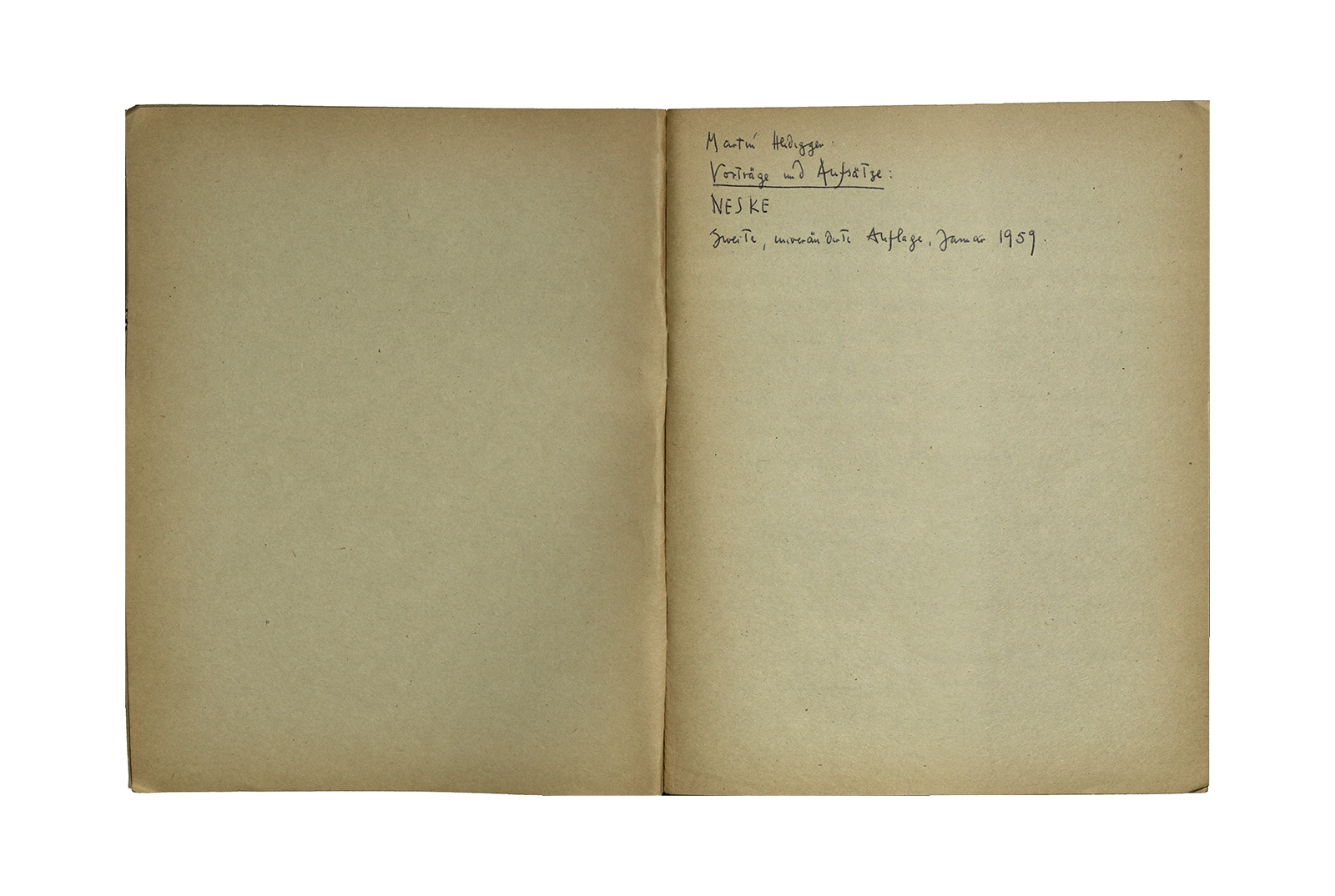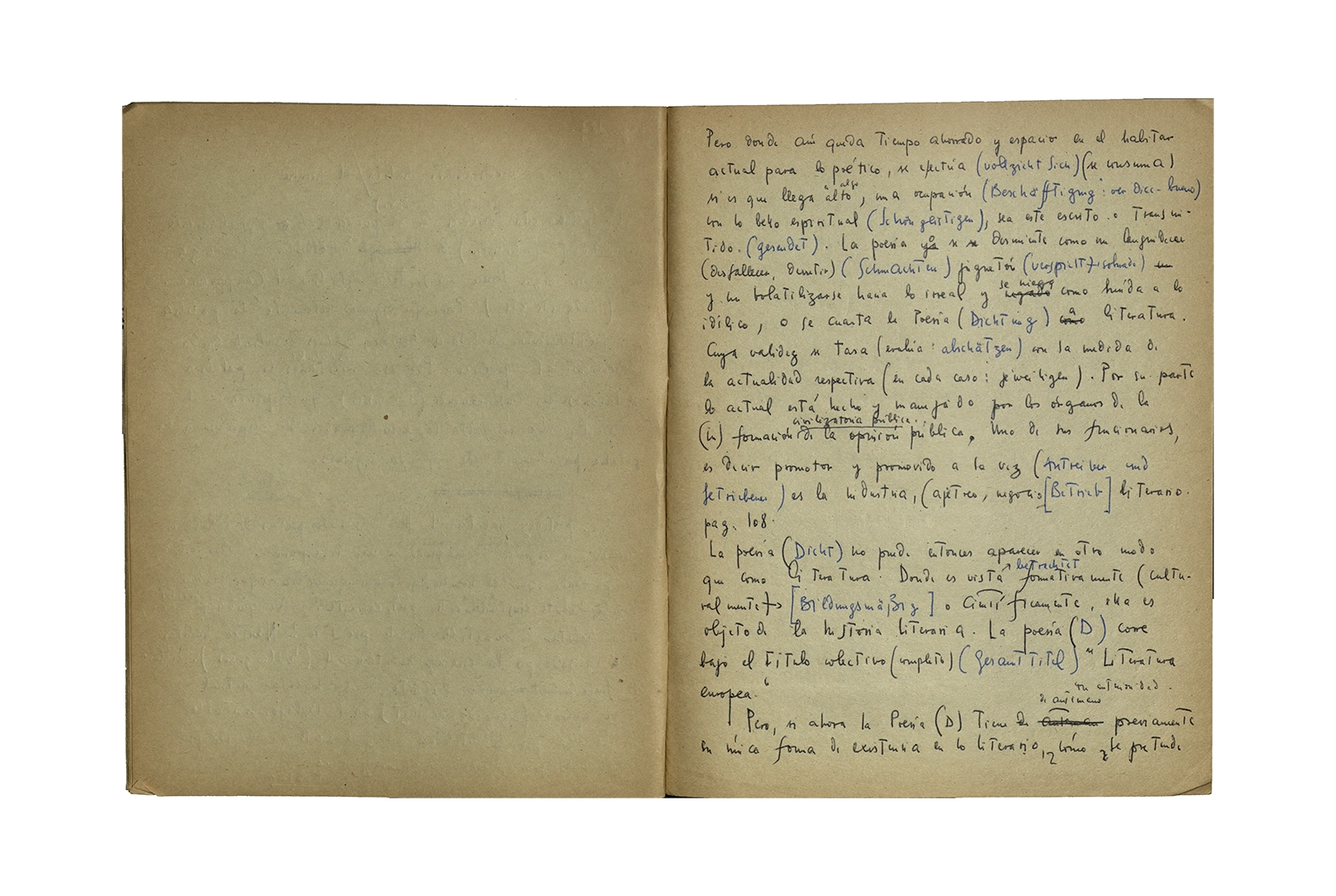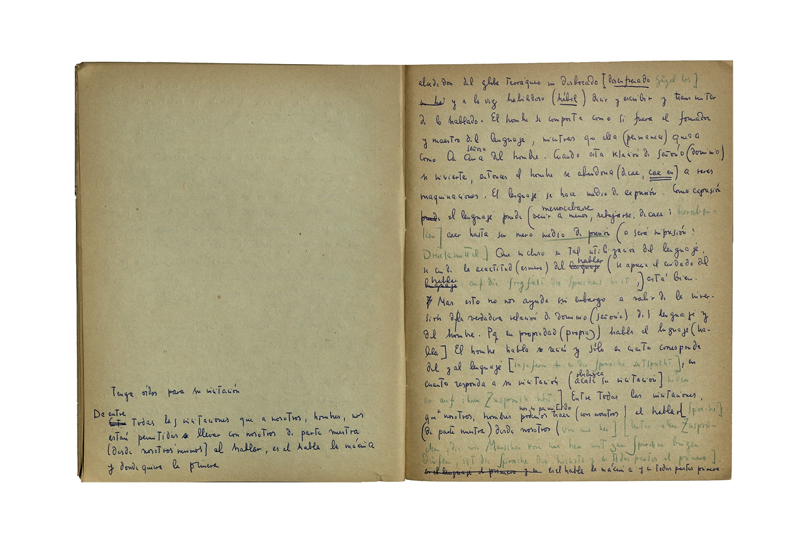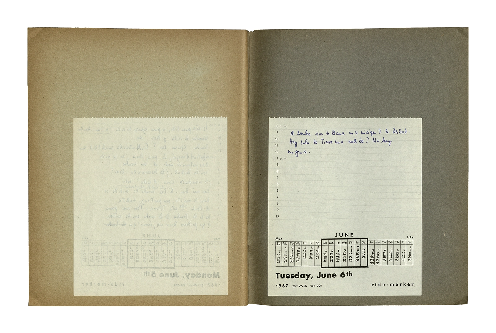 Cuaderno que contiene la traducción de la conferencia “Dichterisih wohnet der mensch” obtenida del libro “Vorträge und Aufsätze”, publicado por Neske, Pfullingen, (1959) de Martin Heidegger. El cuaderno además incluye dos pequeñas hojas de calendario de 1967 con notas de la traducción del texto.