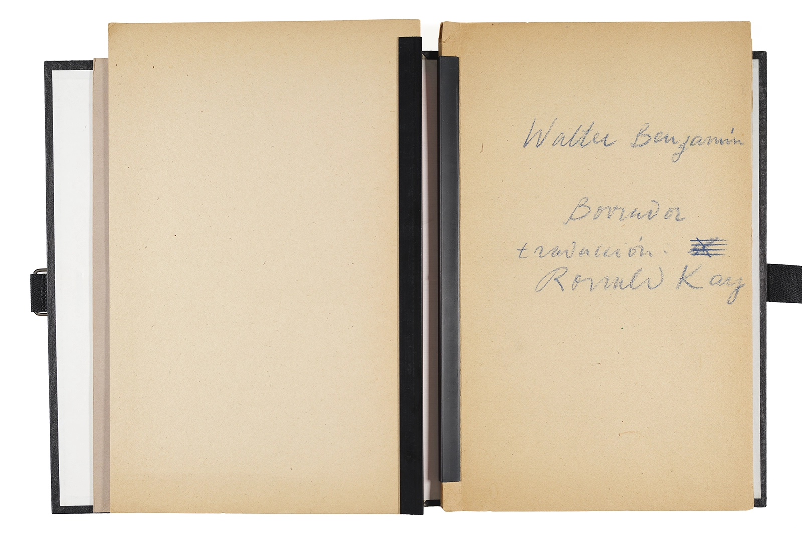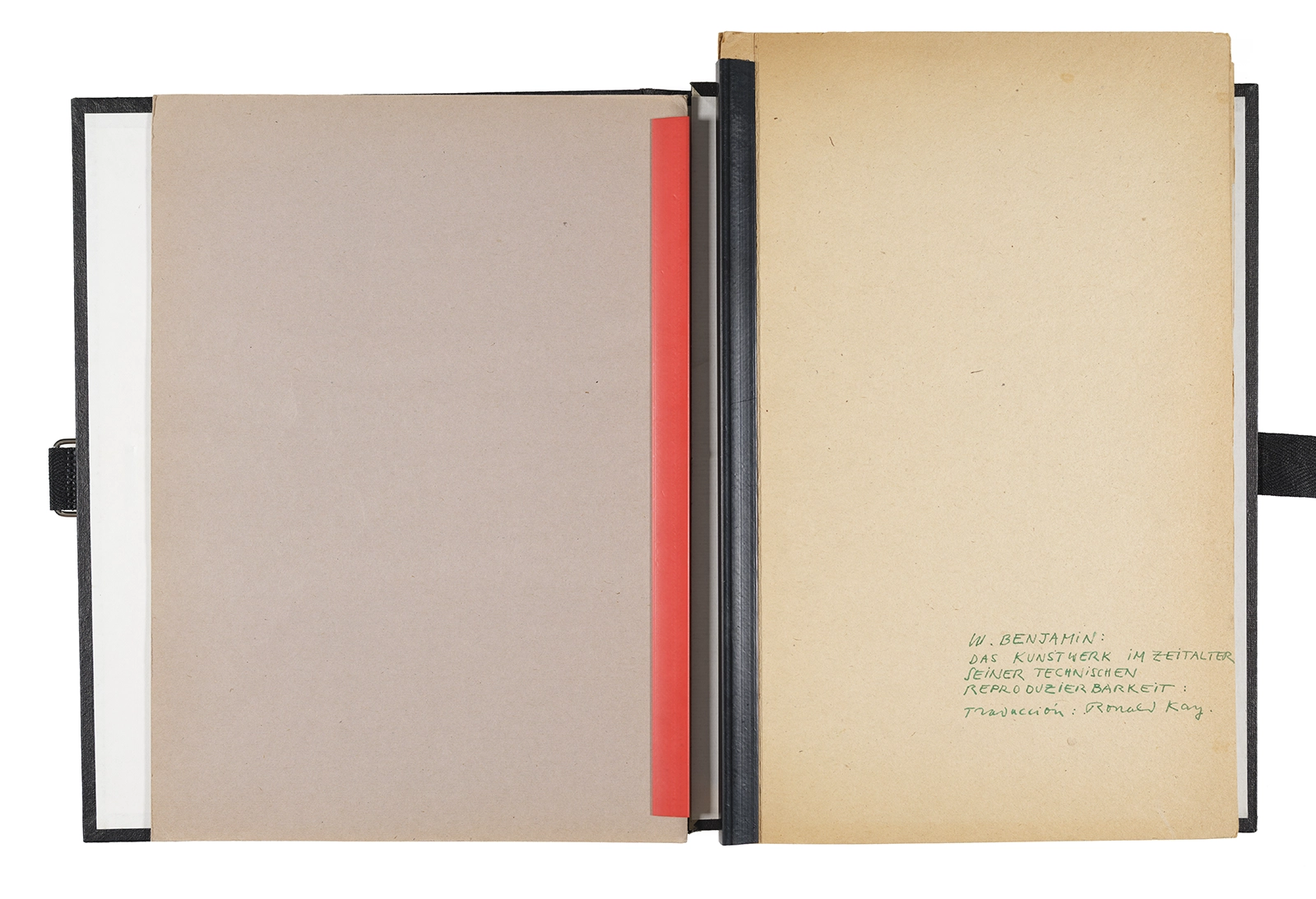 Conjunto de tres carpetas en las que Ronald Kay reúne apuntes y borradores para la traducción al español del ensayo “La obra de arte en la época de su reproductibilidad técnica” de Walter Benjamin. Los documentos abarcan los primeros nueve apartados del ensayo original, por lo que la traducción se encuentra incompleta. A pesar de que estos materiales no se encuentran fechados, una de las carpetas contiene una nota con el concepto “escr:i:magen”, nombre de uno de los seminarios que Kay dicta en el Departamento de Estudios Humanísticos en 1975, por lo que los documentos podrían situarse alrededor de ese año.